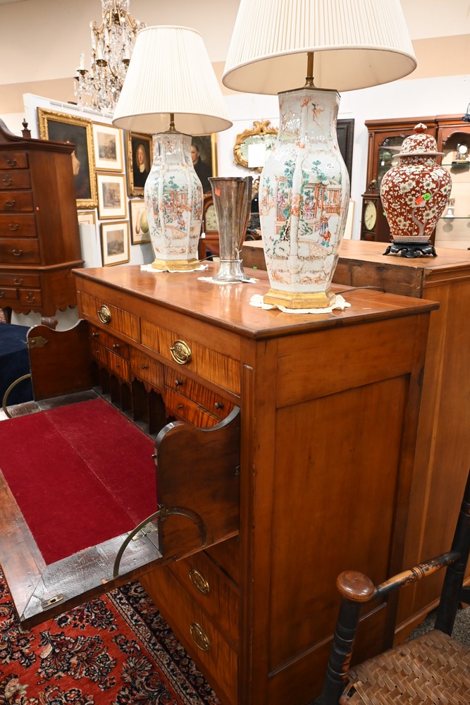 Lot 106: Sheraton Cherry Butlers Desk with tiger maple drawers having two short drawers over drop front desk opening to reveal tiger maple drawers all over three drawer set on turned legs circa 1840 height 48 inches, width 45 inches, top 22 x 45 inches