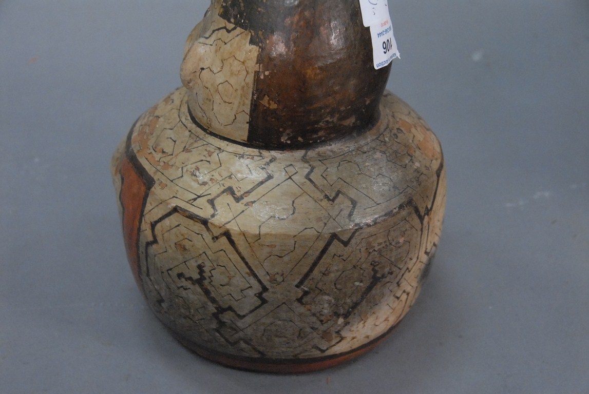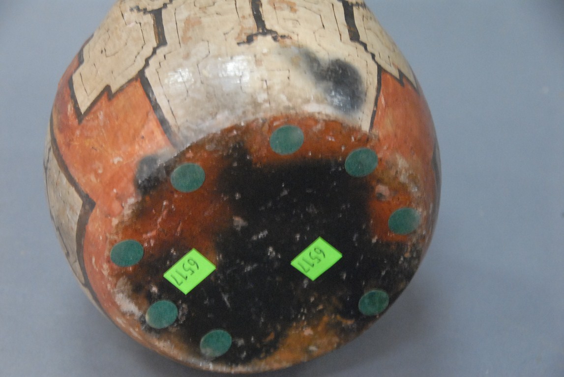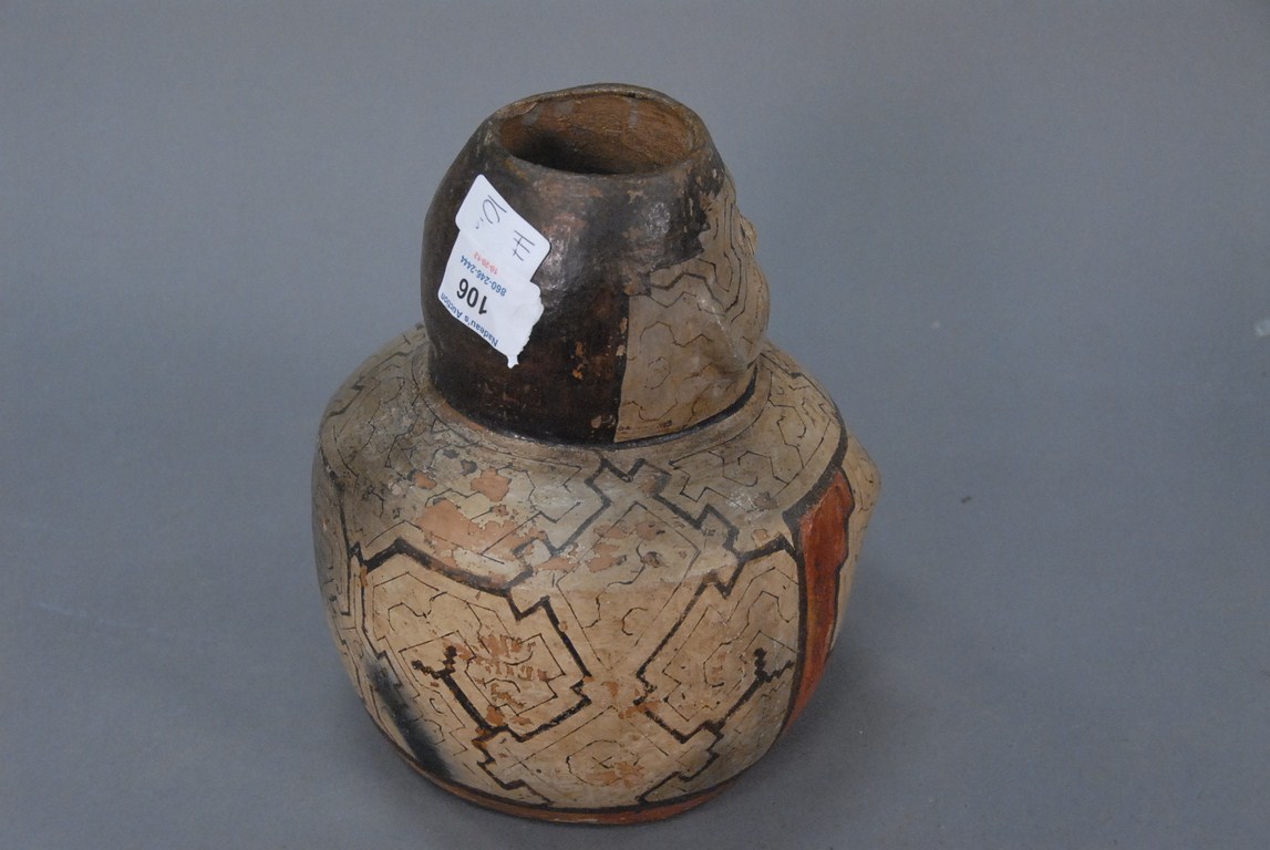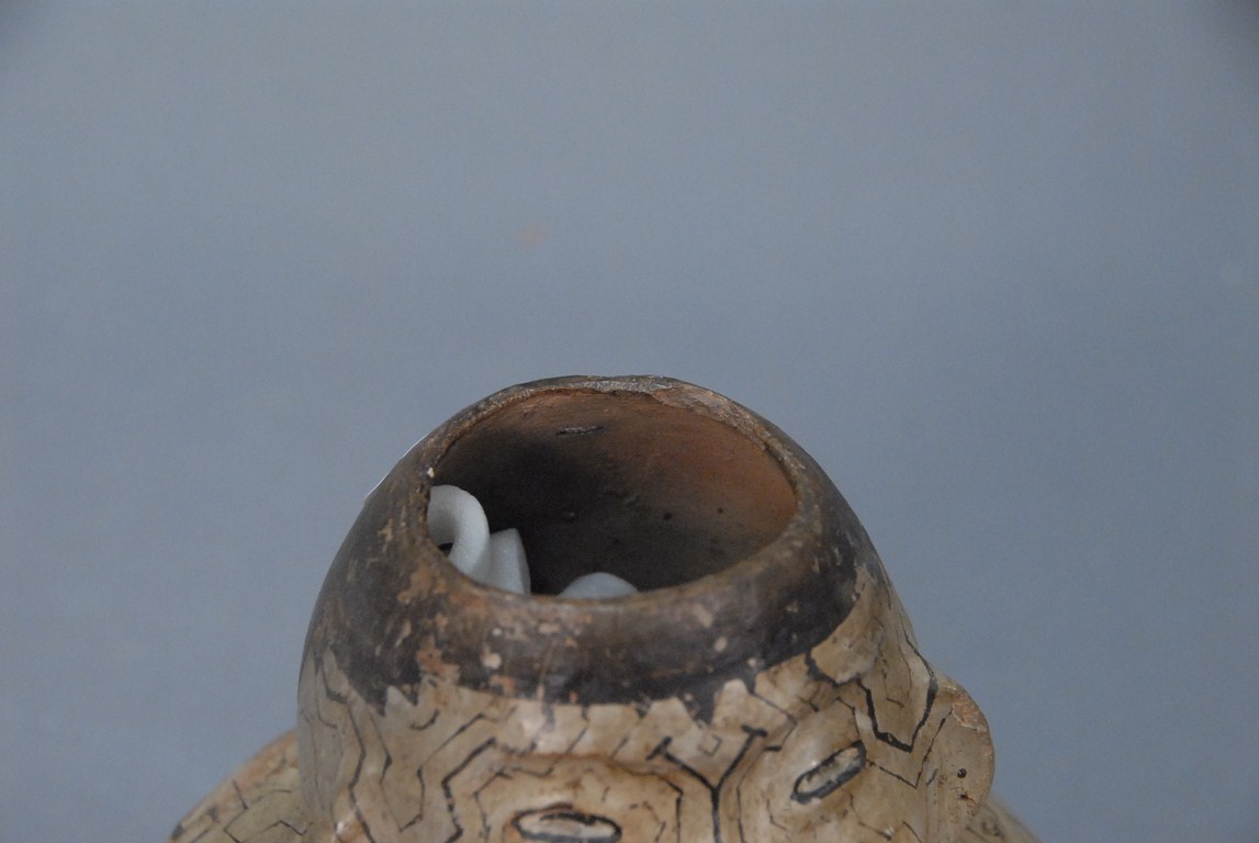 Shipibo Effigy pot Ucayali River female geometric designs in brown on cream. ht. 10in.