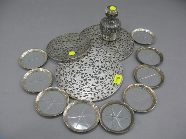 Sterling silver & glass lot including 3 pot stands & an overlay cologne bottle with stopper and several coasters with sterling rims