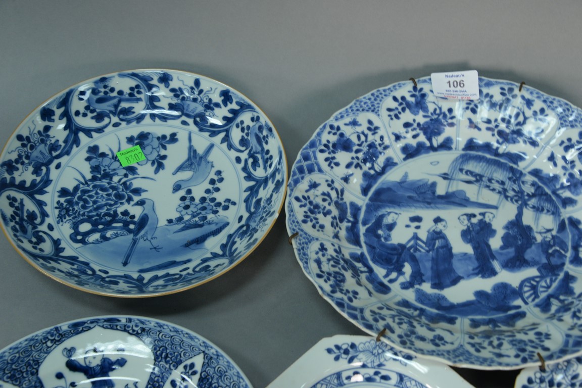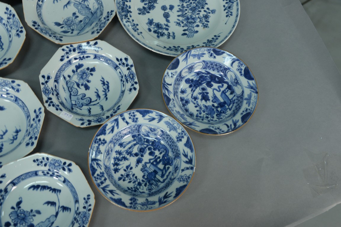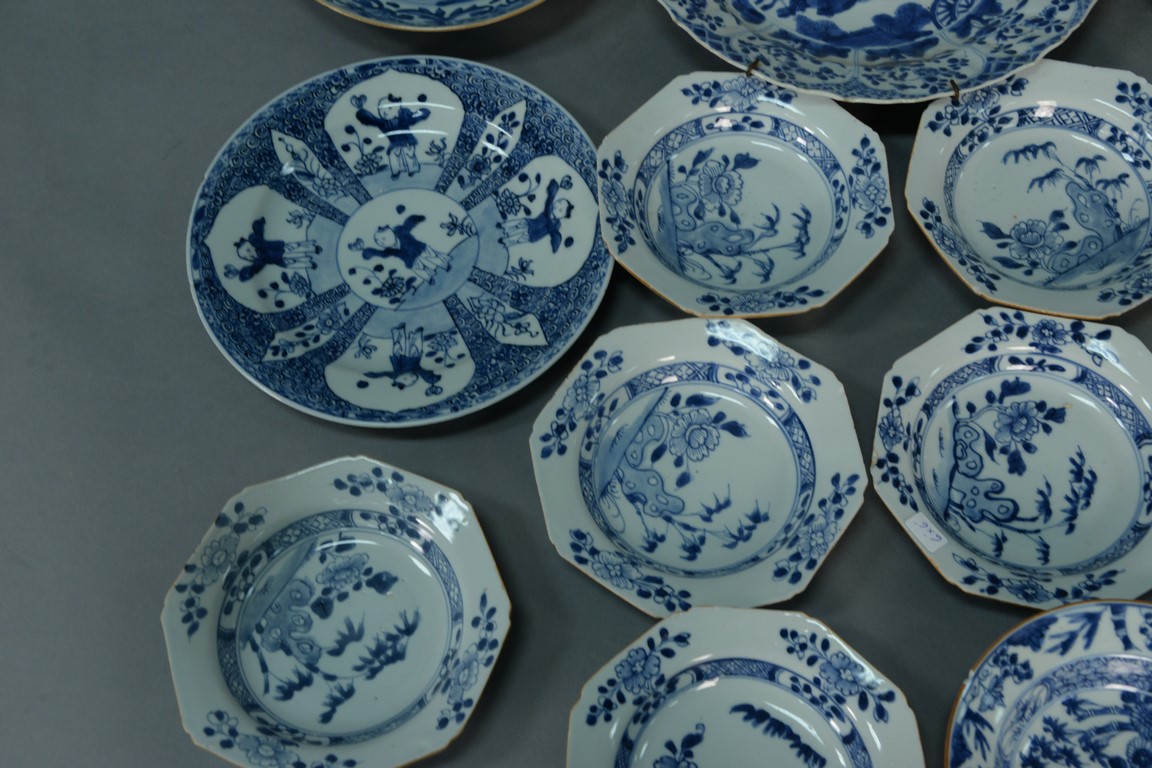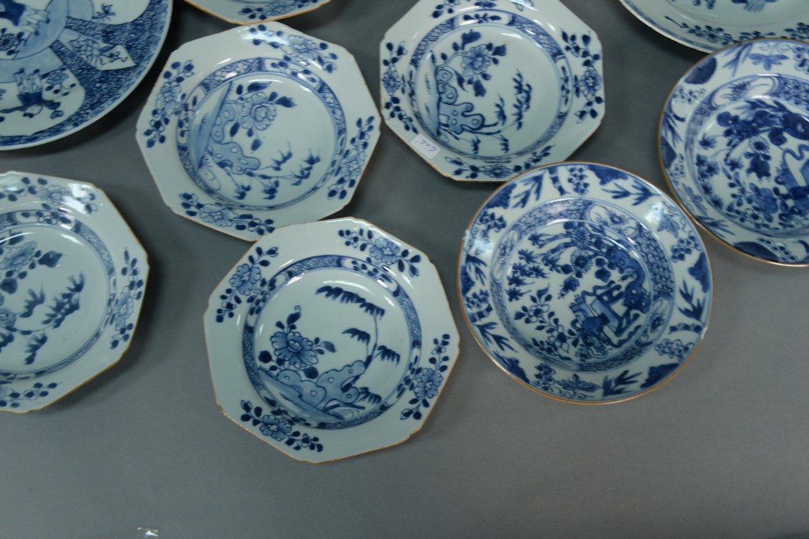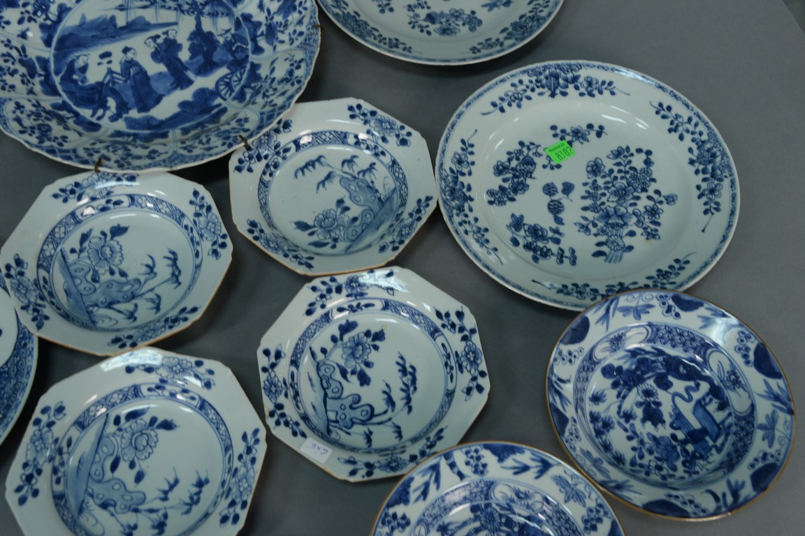 Thirteen piece lot of Chinese blue and white porcelain to include a deep plate, Chinese plate with five boys small chip on foot, two small bowls, large deep dish with Guanyin and scholar figures, pair of floral decorated dishes, and a set of six octagon bowls.