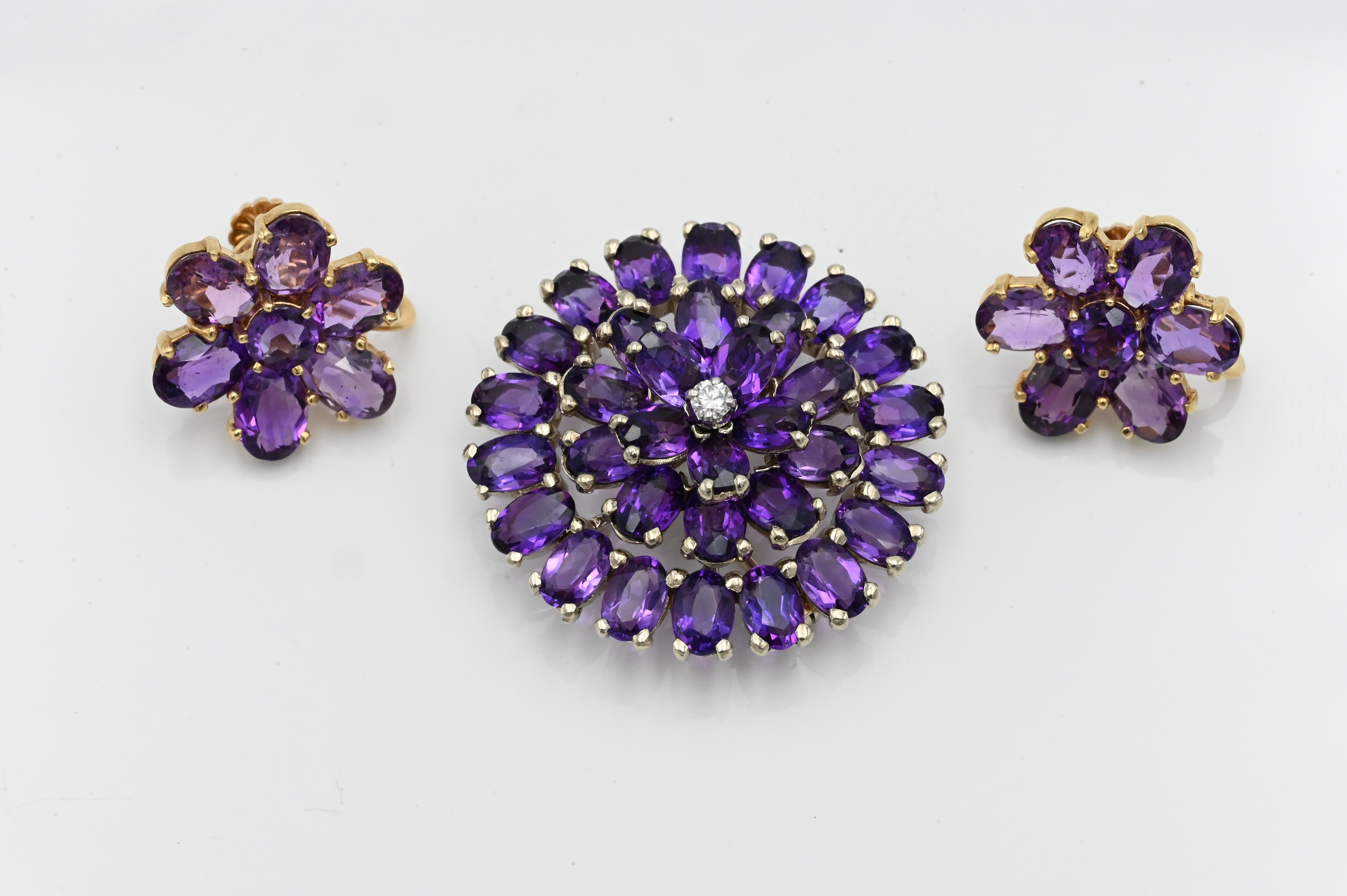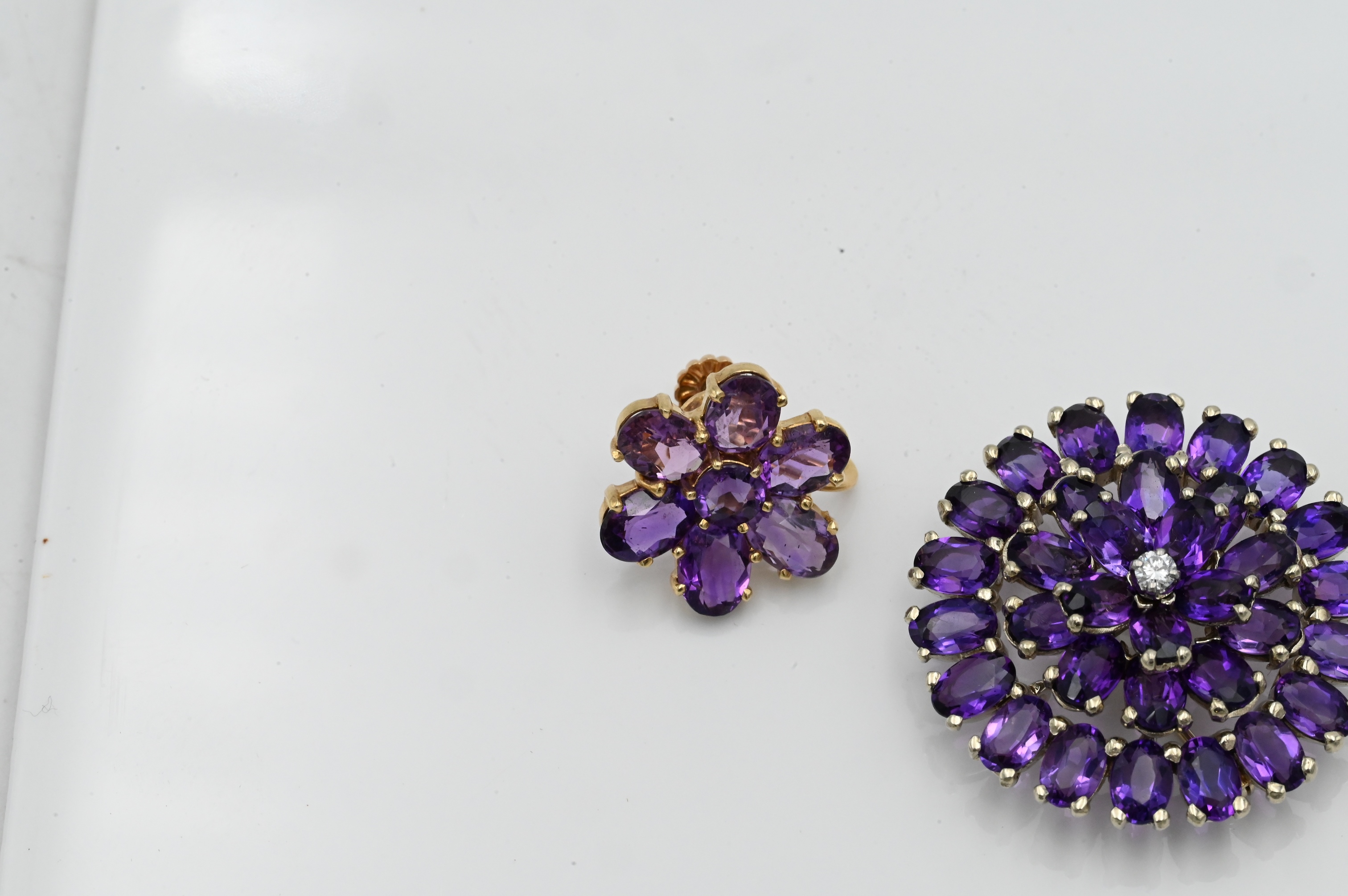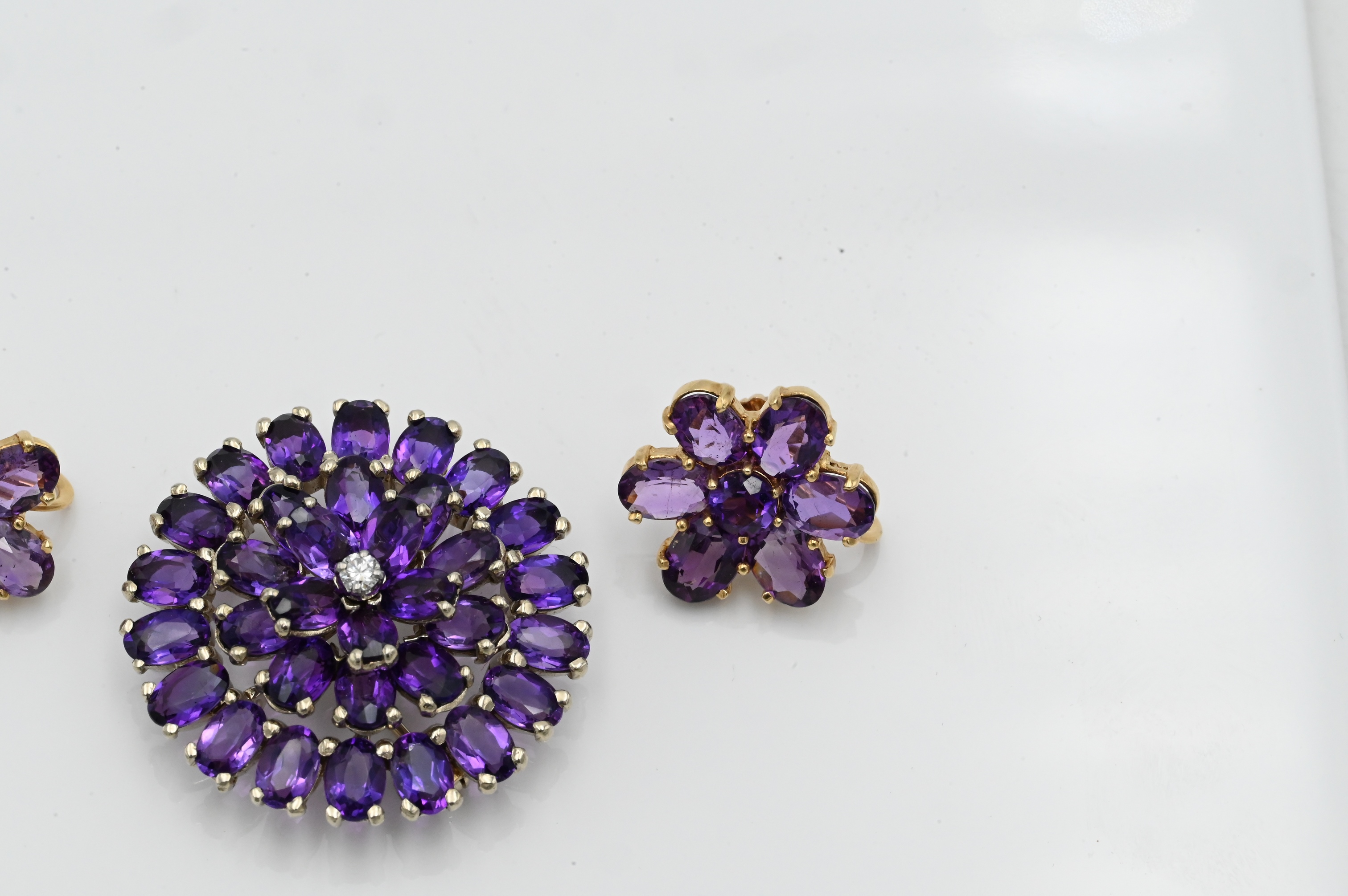 one center diamond along with a pair of 14K yellow gold ear clips mounted with amethysts