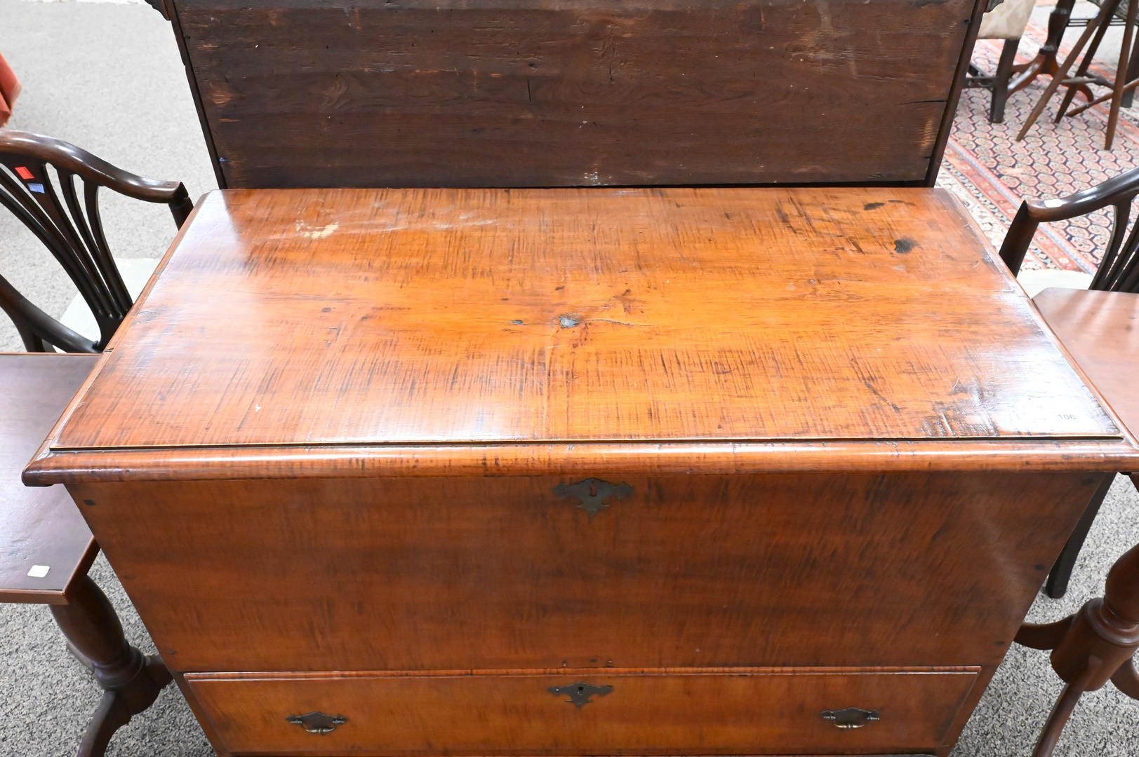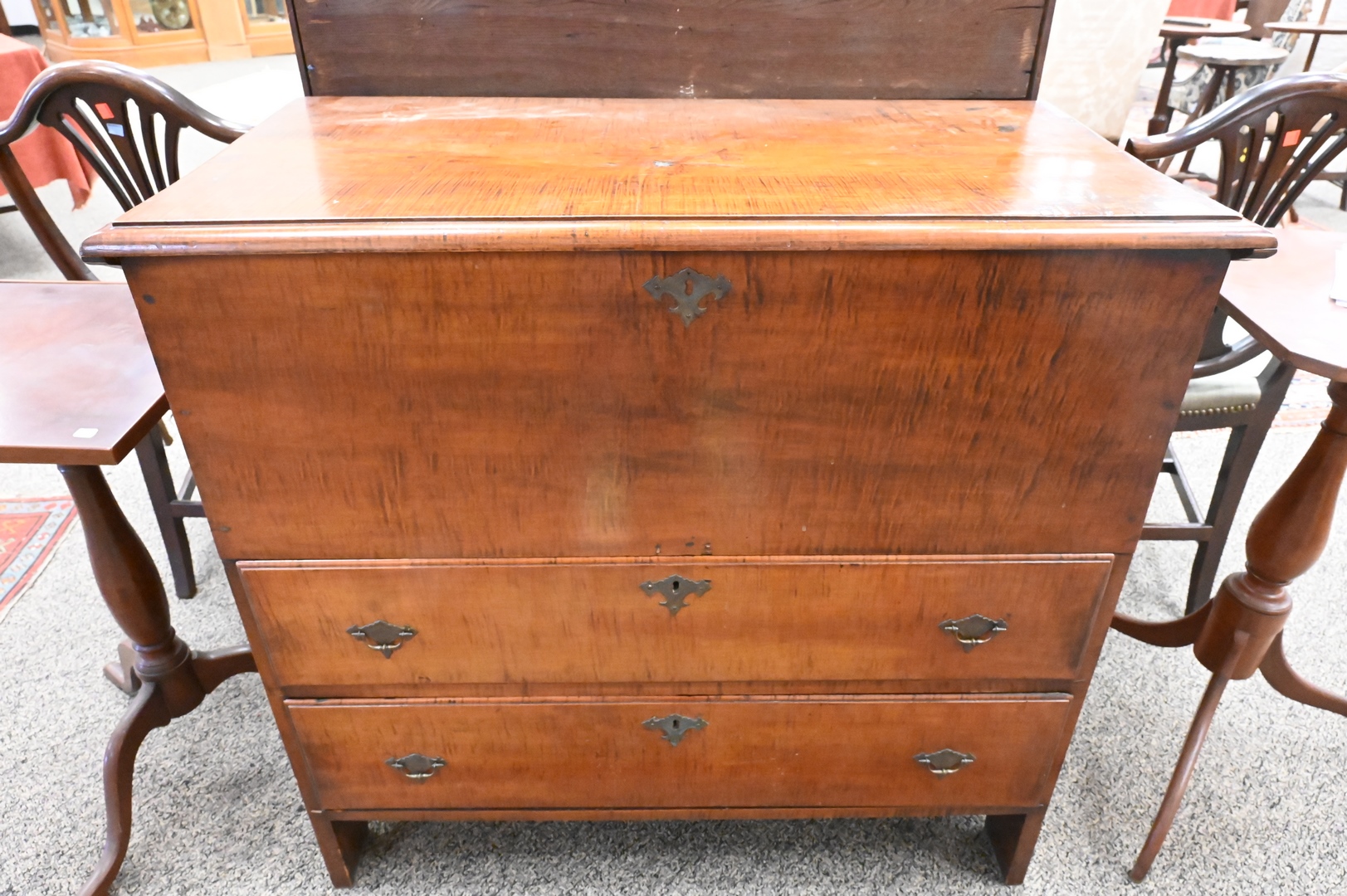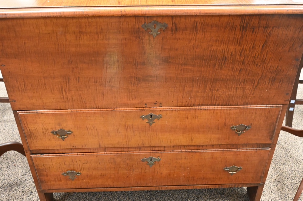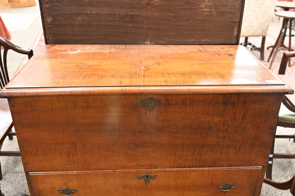 Lot 106: Tiger Maple Blanket Chest, having lift top over two drawers, set on boot jack ends, original snipe hinges and hardware, circa 1750, made in Massachusetts, maple, eastern white pine, drawer linings and back boards (by microanalysis), height 36 inches, width 36 1/2 inches, Mabel Brady Garvan Collection. Provenance: Jacob Margolis (born Russia, probably 1875), New York; consigned to Anderson Galleries, November 8, 1924, lot 508; sold to Francis P. Garvan (1875–1937), New York; by gift to Yale University Art Gallery, New Haven, Conn., 1930.