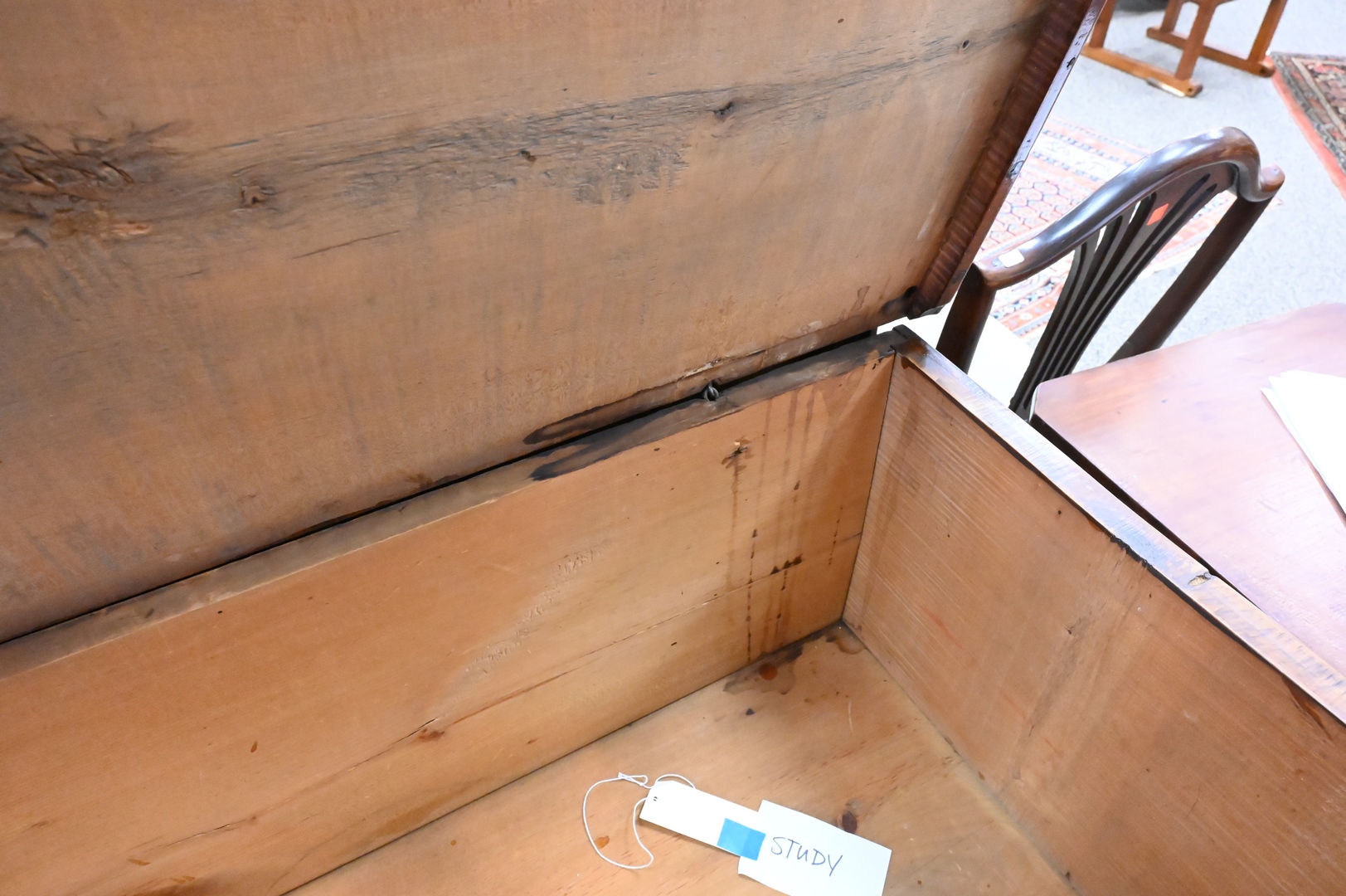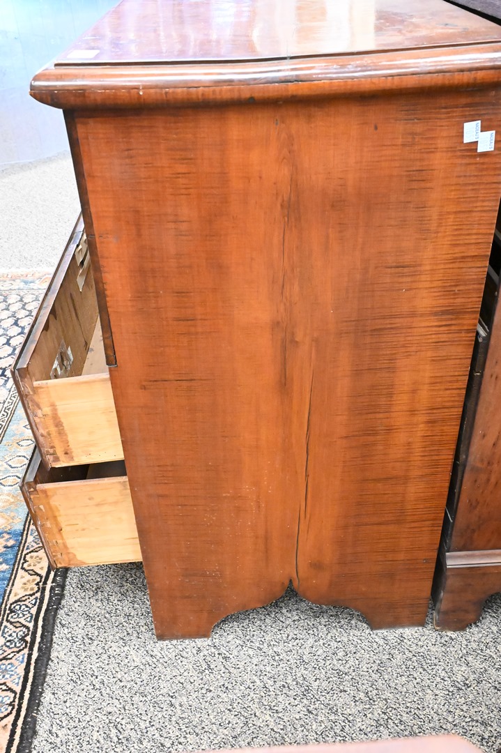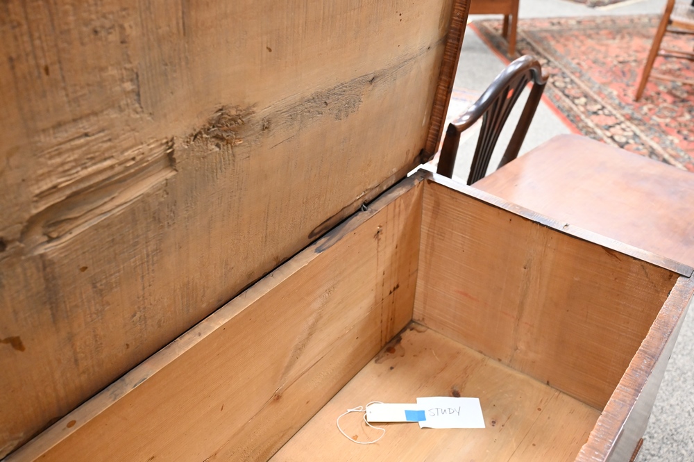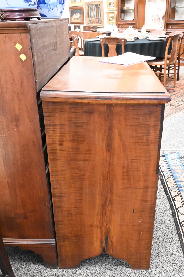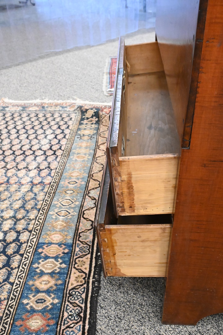 Lot 106: Tiger Maple Blanket Chest, having lift top over two drawers, set on boot jack ends, original snipe hinges and hardware, circa 1750, made in Massachusetts, maple, eastern white pine, drawer linings and back boards (by microanalysis), height 36 inches, width 36 1/2 inches, Mabel Brady Garvan Collection. Provenance: Jacob Margolis (born Russia, probably 1875), New York; consigned to Anderson Galleries, November 8, 1924, lot 508; sold to Francis P. Garvan (1875–1937), New York; by gift to Yale University Art Gallery, New Haven, Conn., 1930.