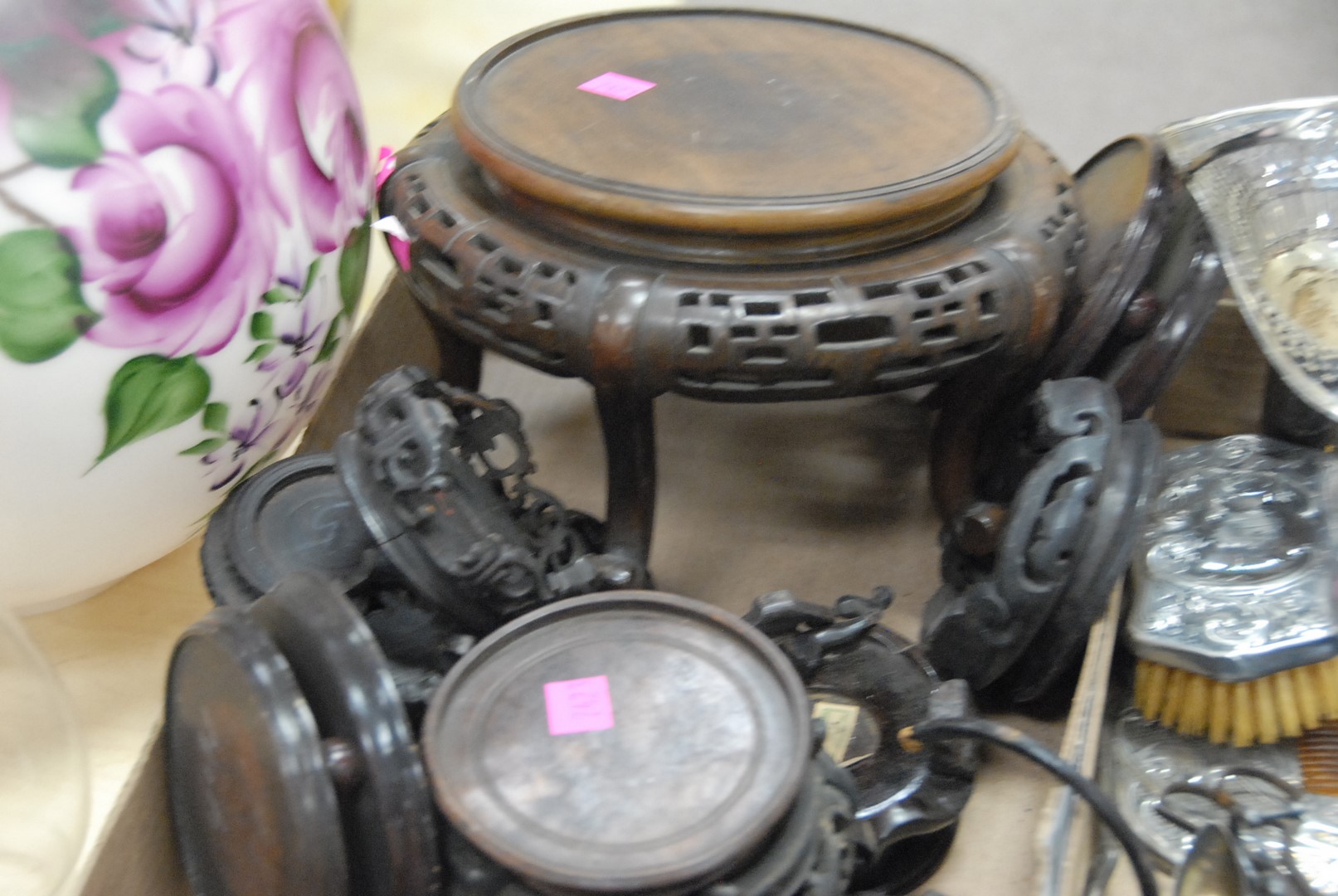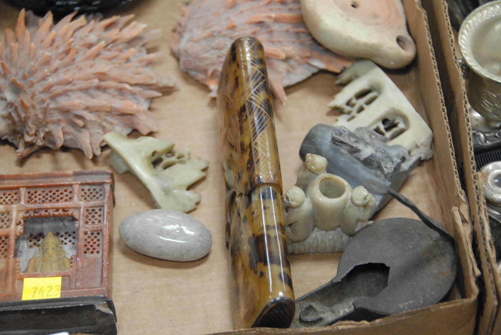 Lot 106: Two box lots to include Chinese hardwood stands, soap stone, and four clay oil lamps one appears to be ancient Roman.