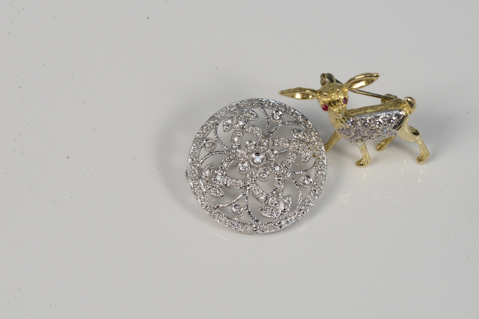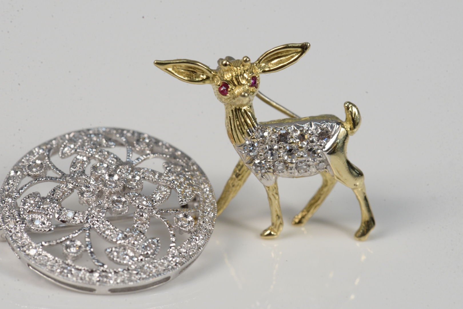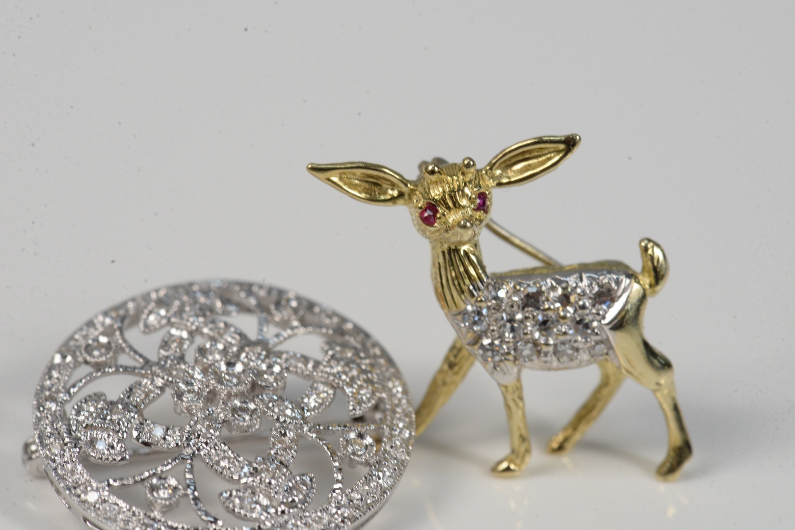 Lot 106: Two Brooches 14 Karat Yellow Gold Deer Brooch set with diamonds with ruby eyes, plus circular 14 karat white gold and diamond brooch…