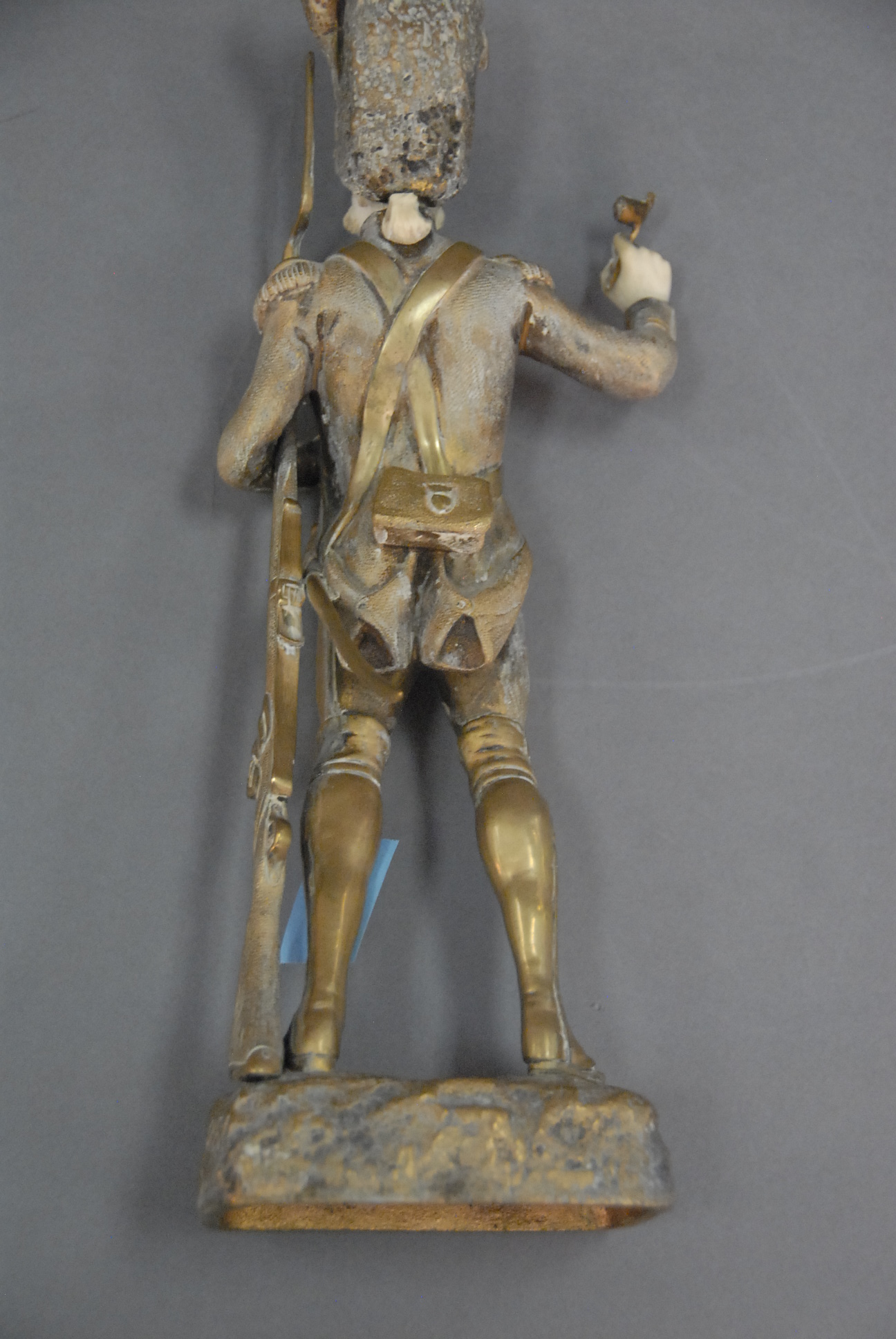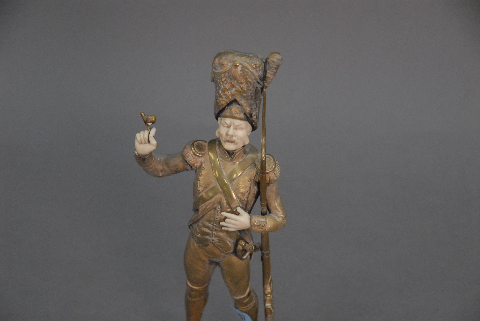 Lot 107: Bronze soldier figure with ivory head and hand with pipe in hand and gun by his side, signed Omerh