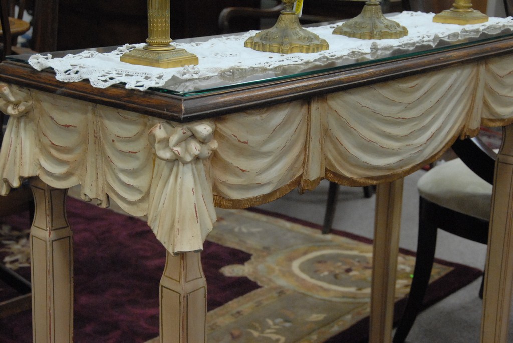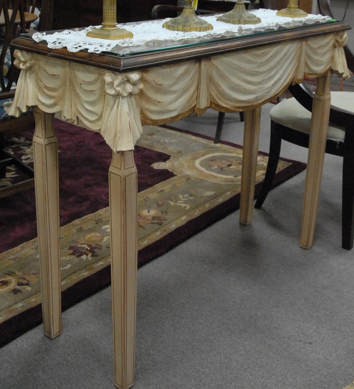 Contemporary decorative hall table with swag design and glass top, ht. 32, wd. 40.