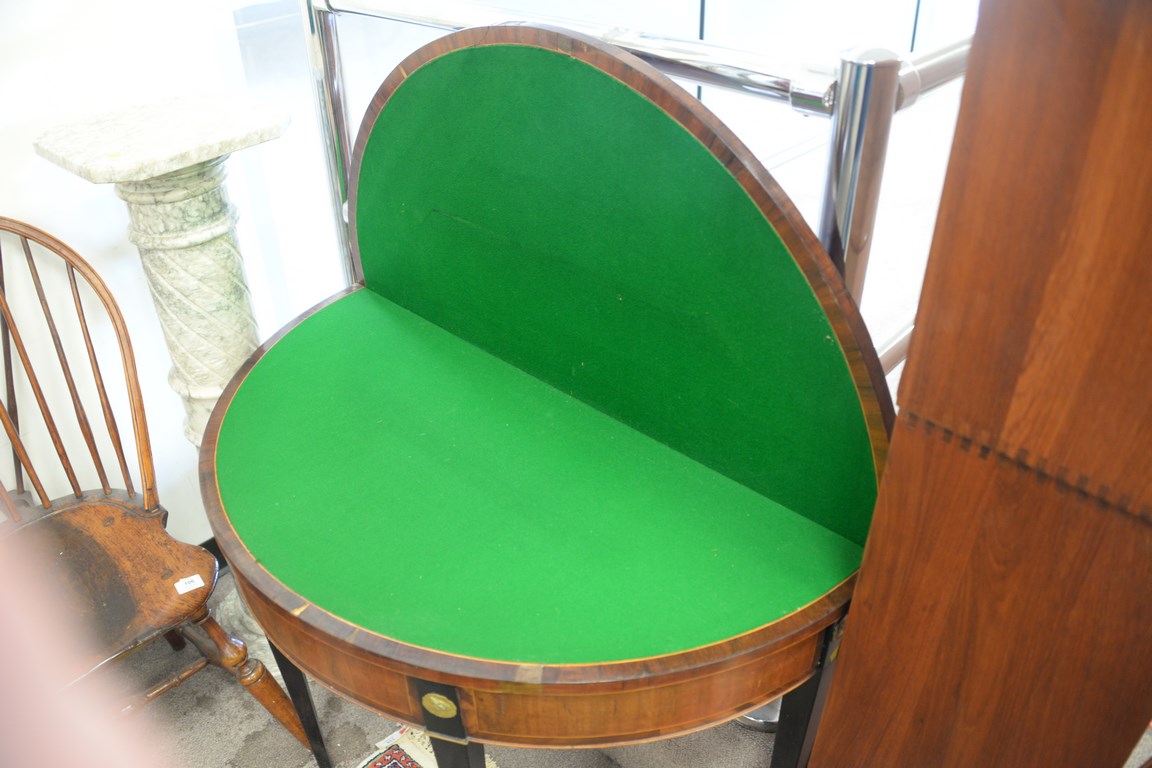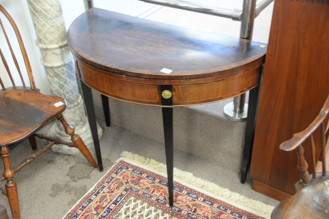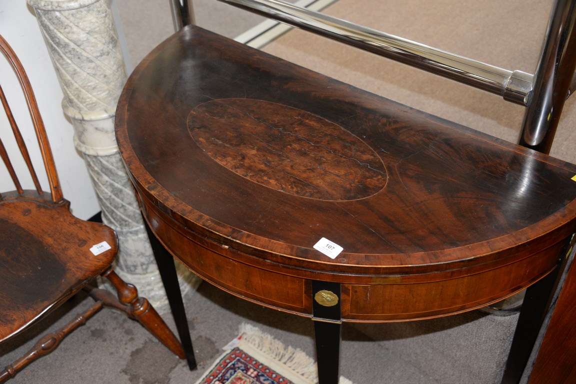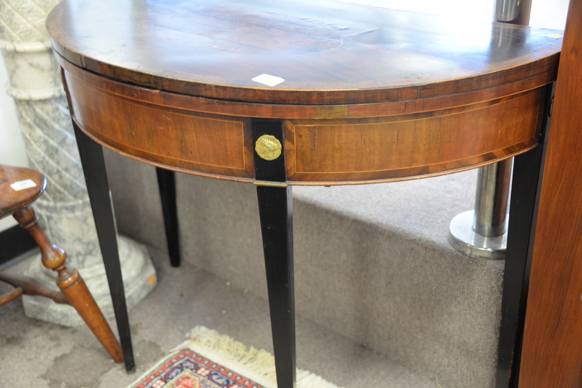 Lot 107: Continental mahogany inlaid game table having burl oval inlaid panel in the top, banded inlaid edge on black painted tapered legs. h…