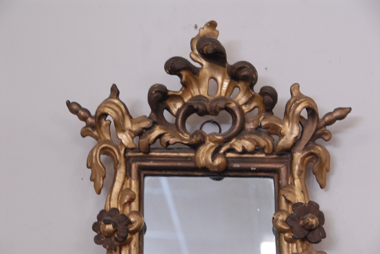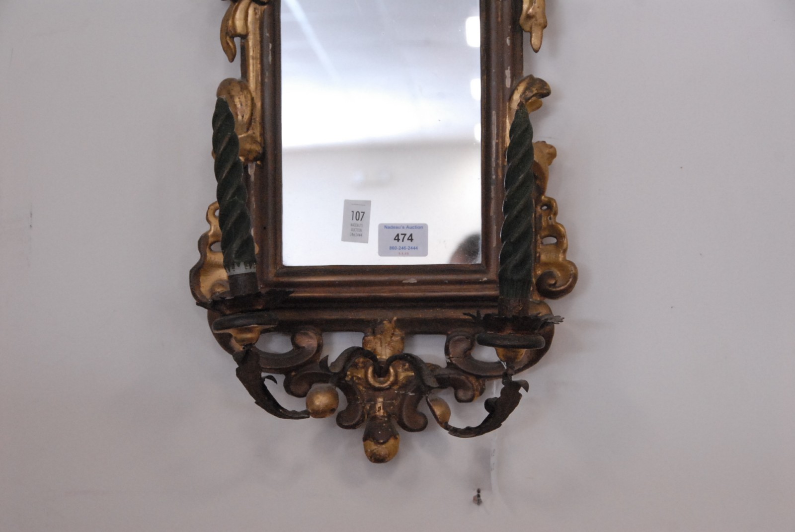 Continental mounted mirror with two cande holders, with metal leaf decoration, early 19th century