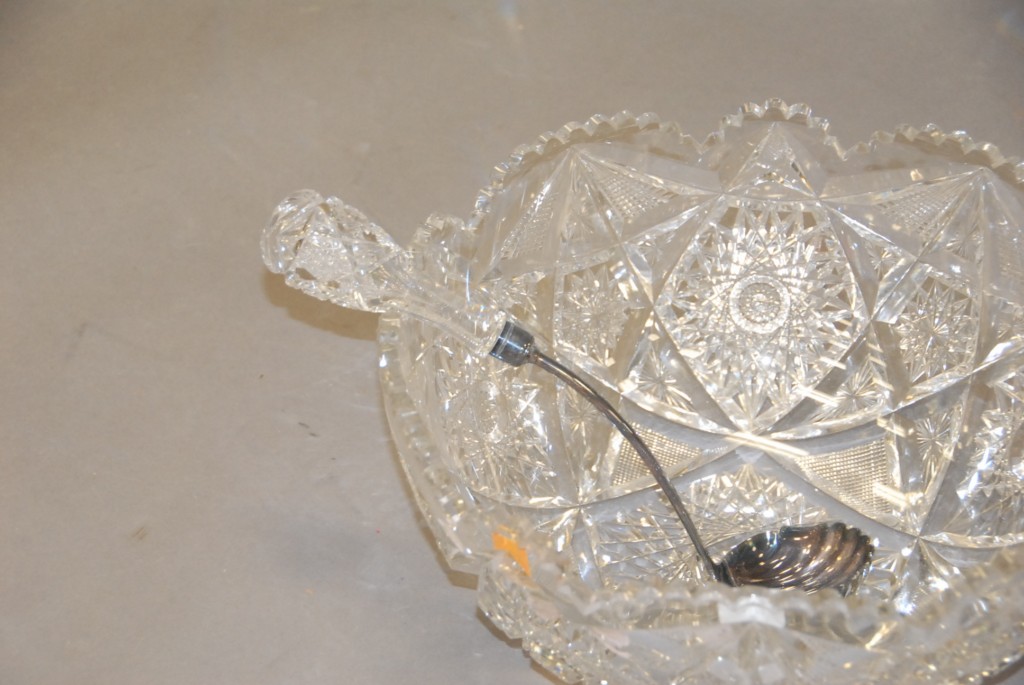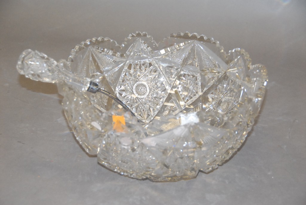 Cut-glass punch bowl and ladle in excellent condition.