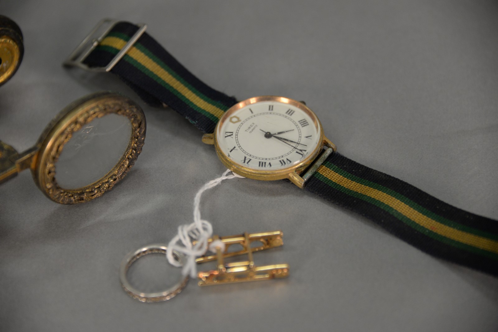 Lot 107: Four piece lot to include platinum ring setting 2.7 grams, 14K gold clip 6 grams, gilt opera glasses, and Timex watch.