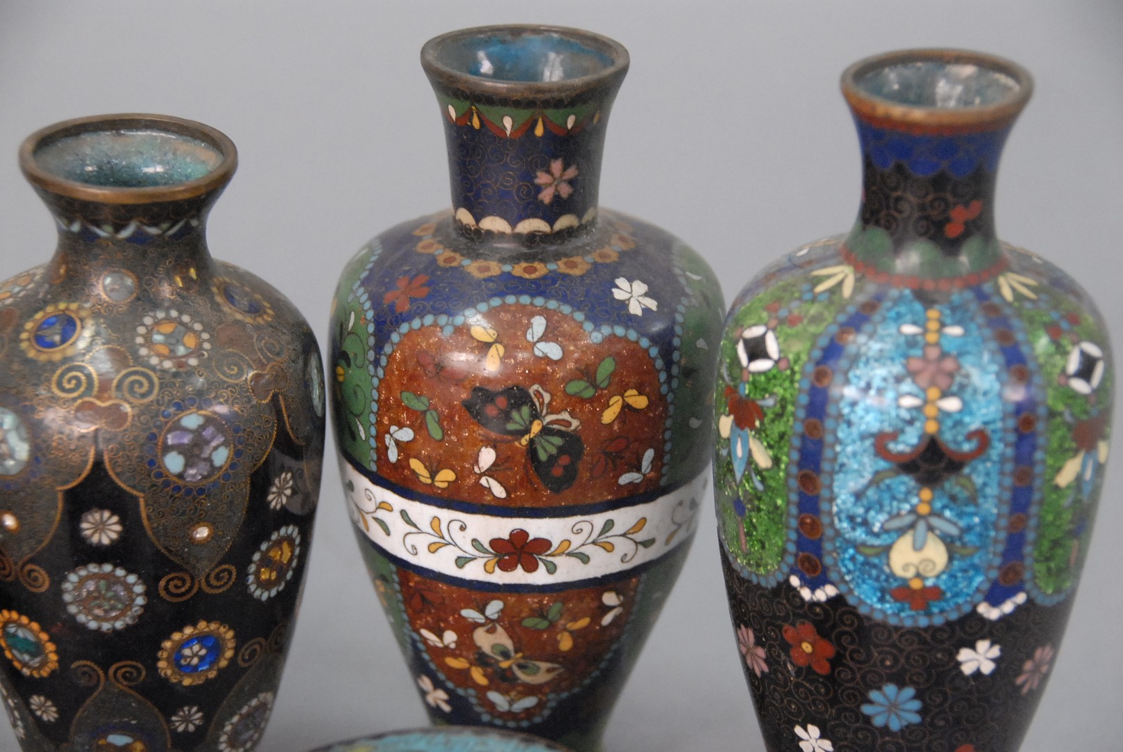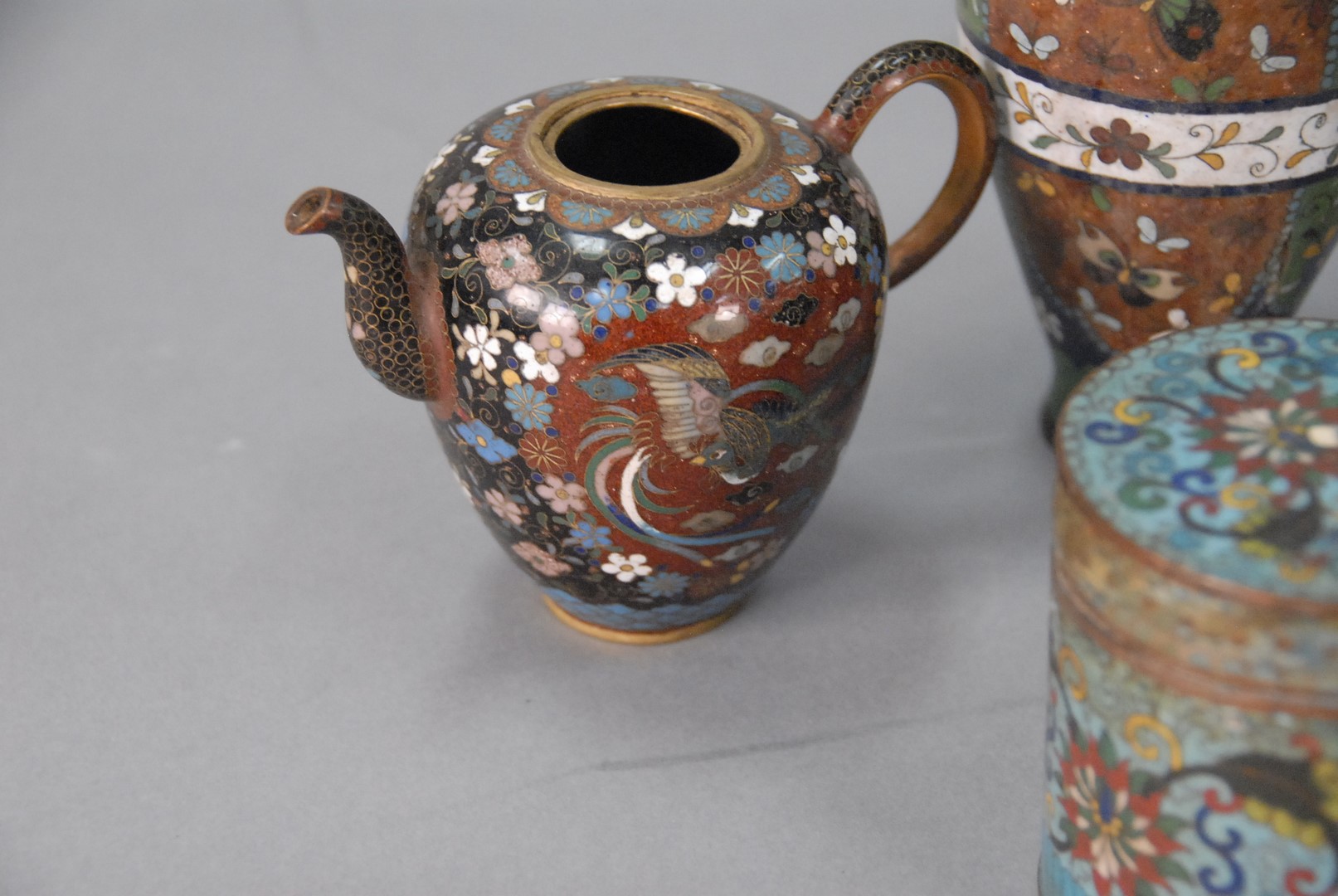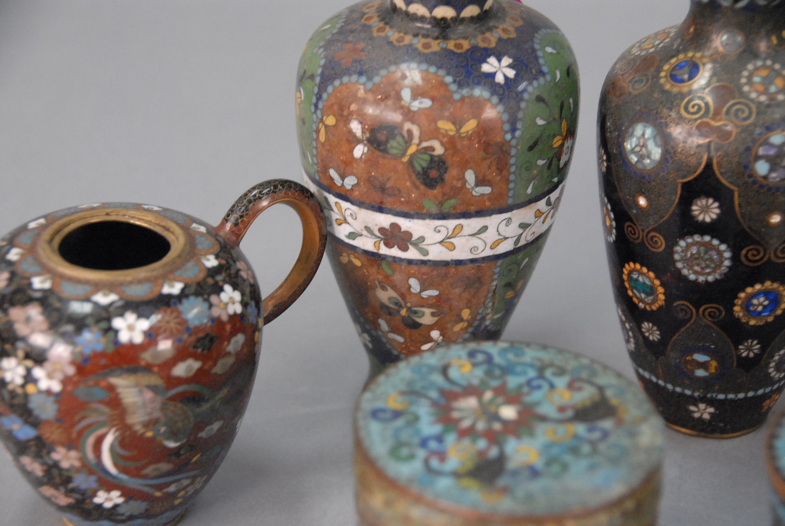 Lot 107: Group of seven Cloisonne pieces including four vases, two round covered boxes, and a creamer.