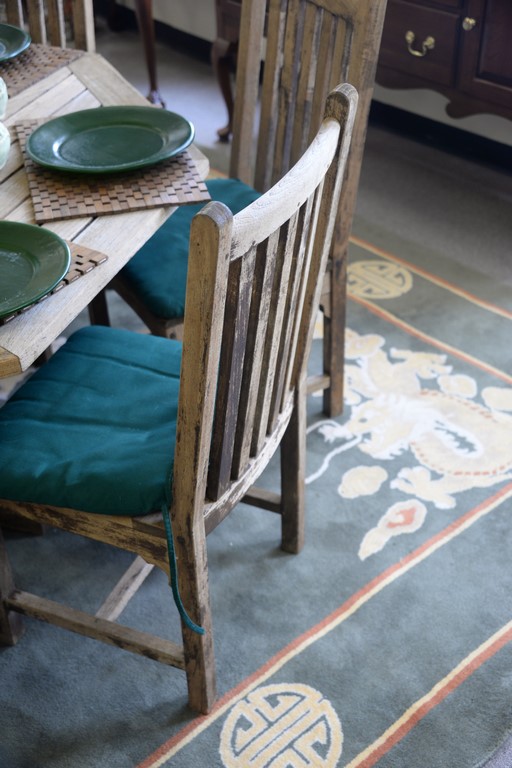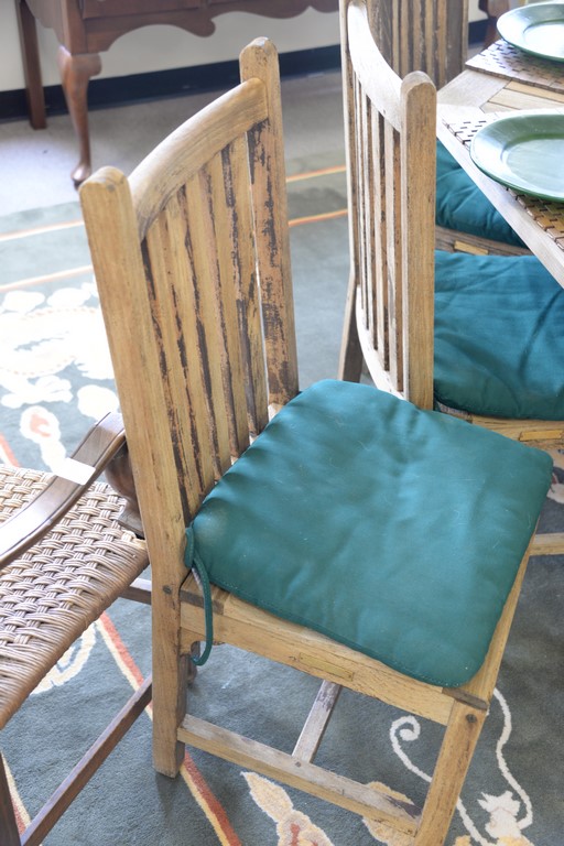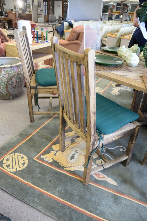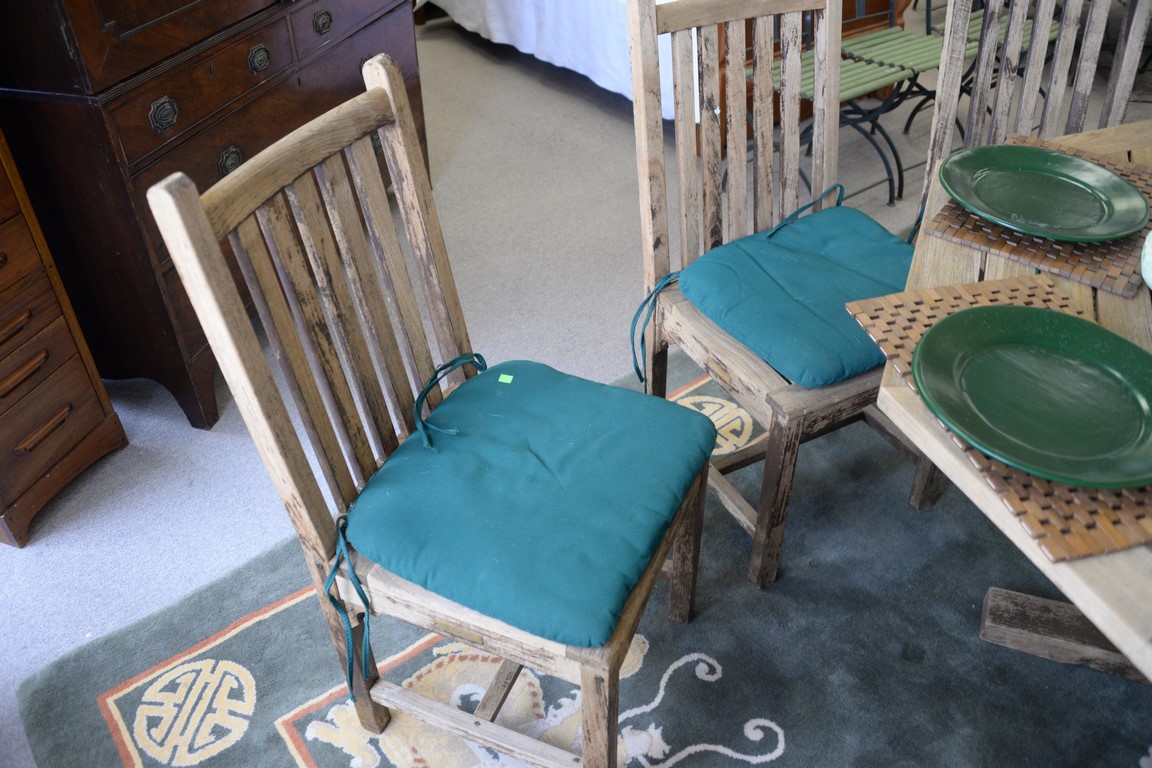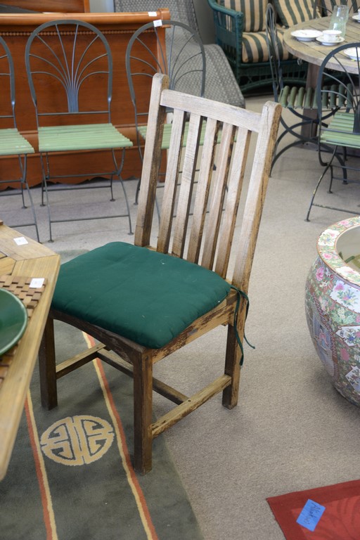 Kingsley & Bate seat of seven teak slat back side chairs three chairs loose.