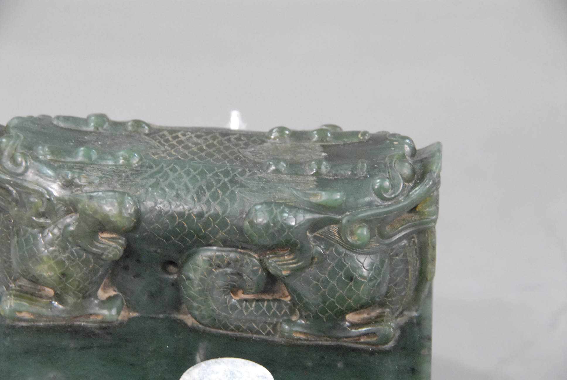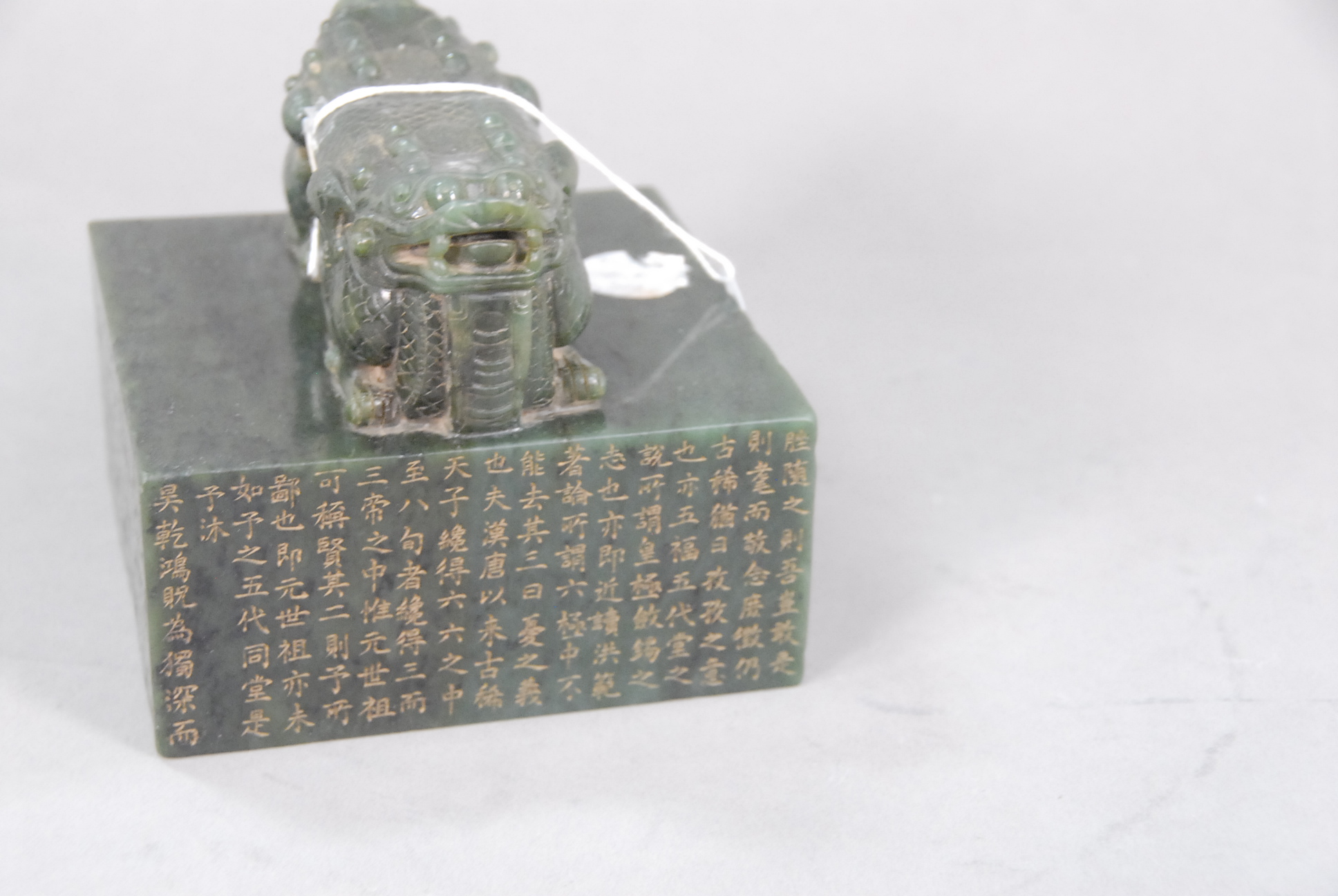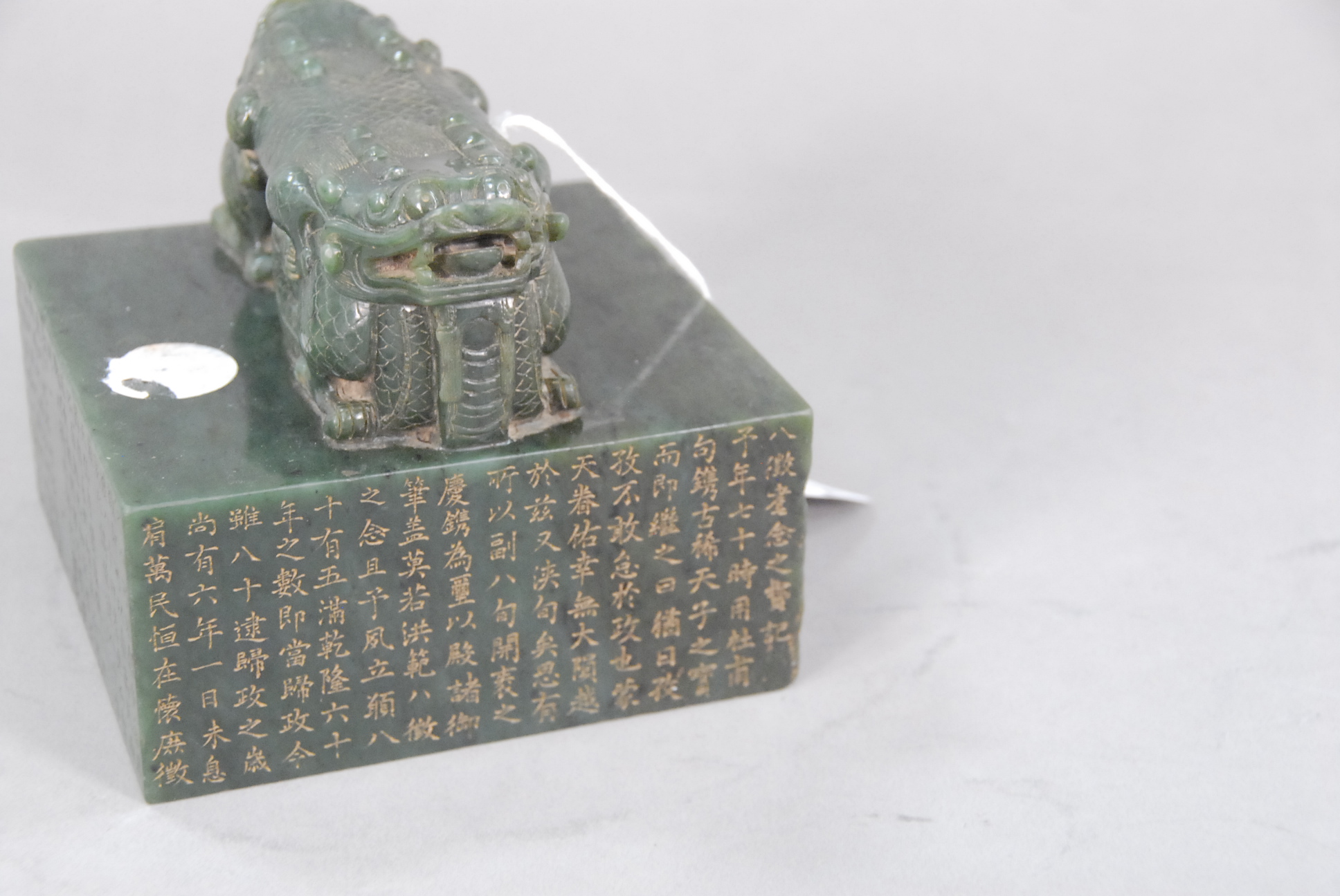 Large spinach jade square seal, solid square block having a large carved handle formed by a pair of addorsed dragons, square block having characters around all sides.