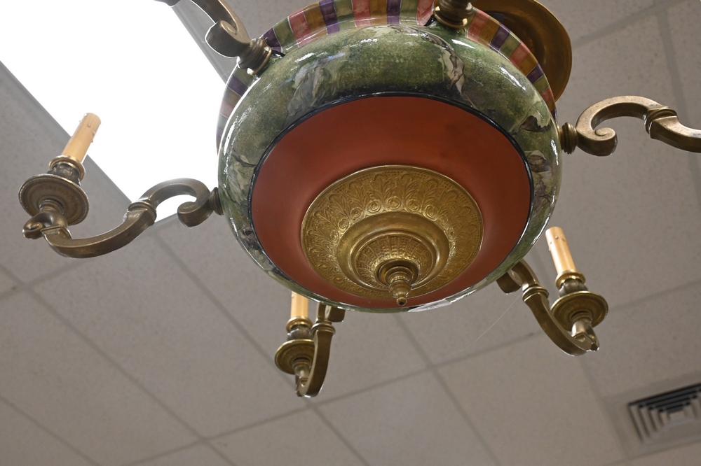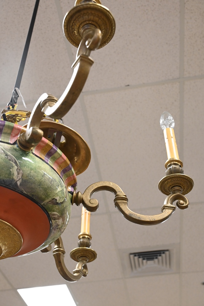 Lot 107: Mackenzie Childs Hanging Light Chandelier, having six arms, height 14 inches, diameter 30 inches.