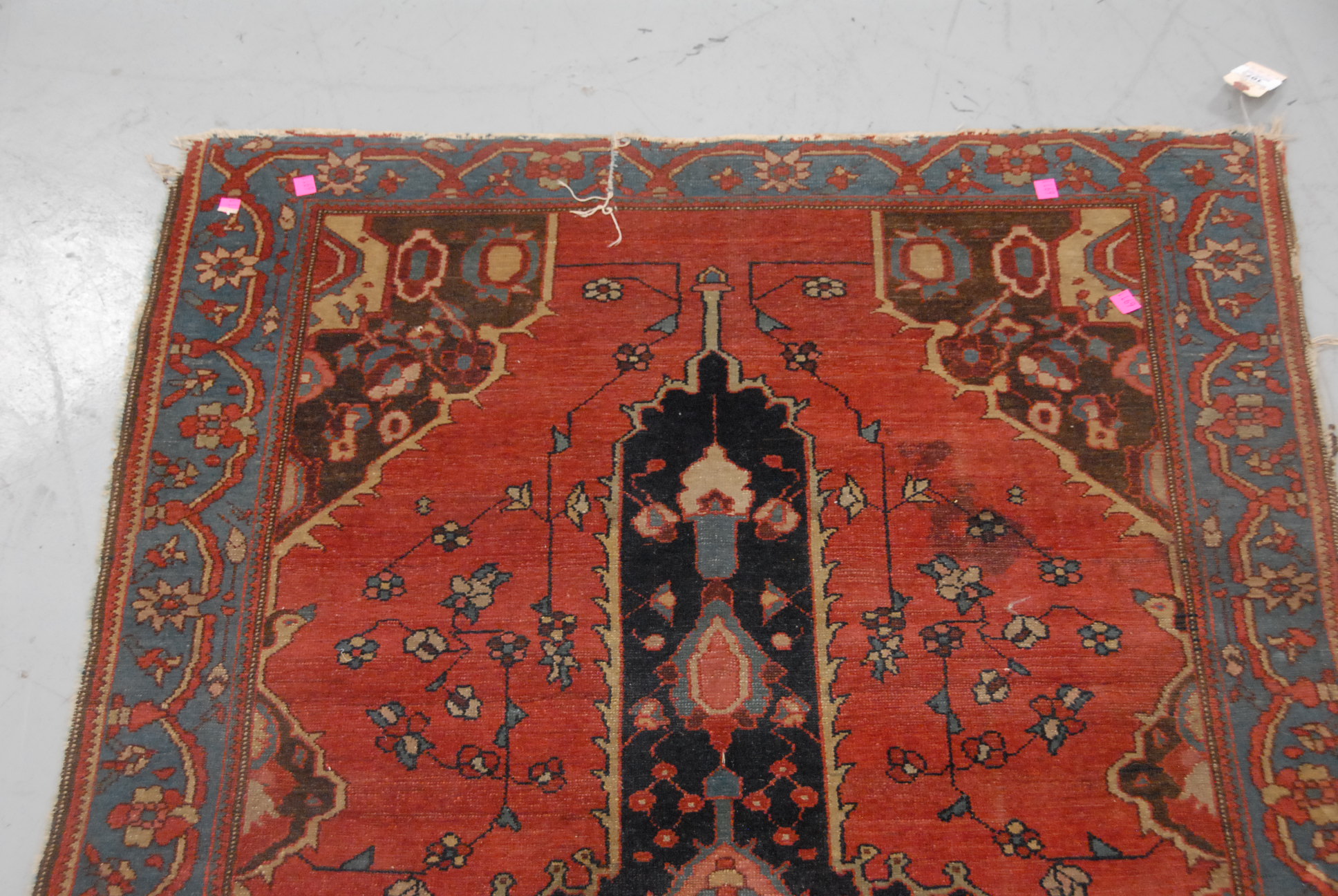 Maylayer Oriental rug small cut and ends frayed, 3’11 x 4’5.