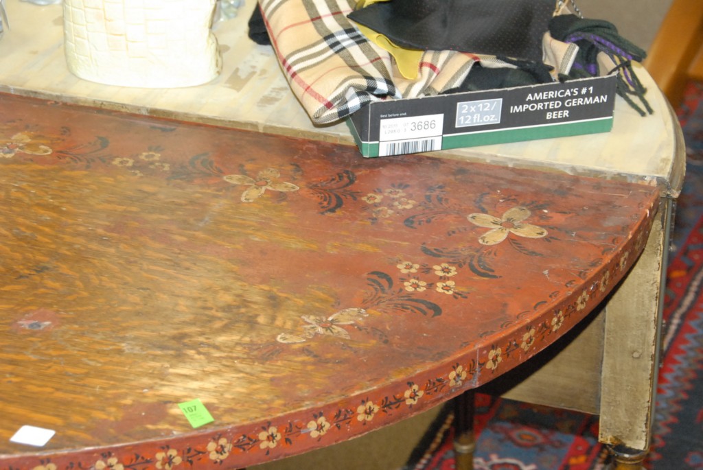 Oak half round table set on paint decorated barrel, ht. 30, wed. 48.