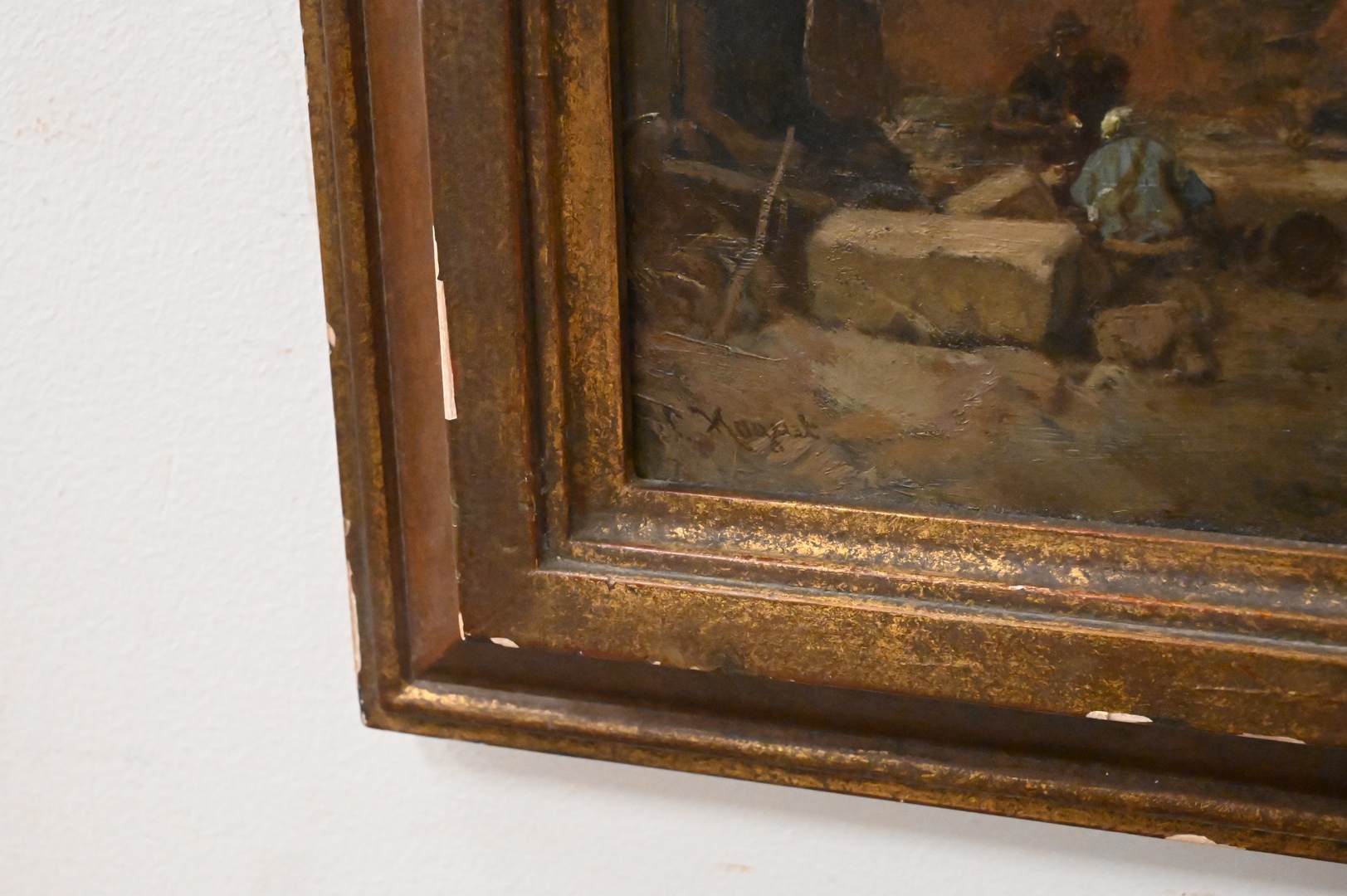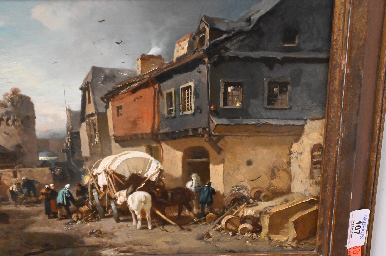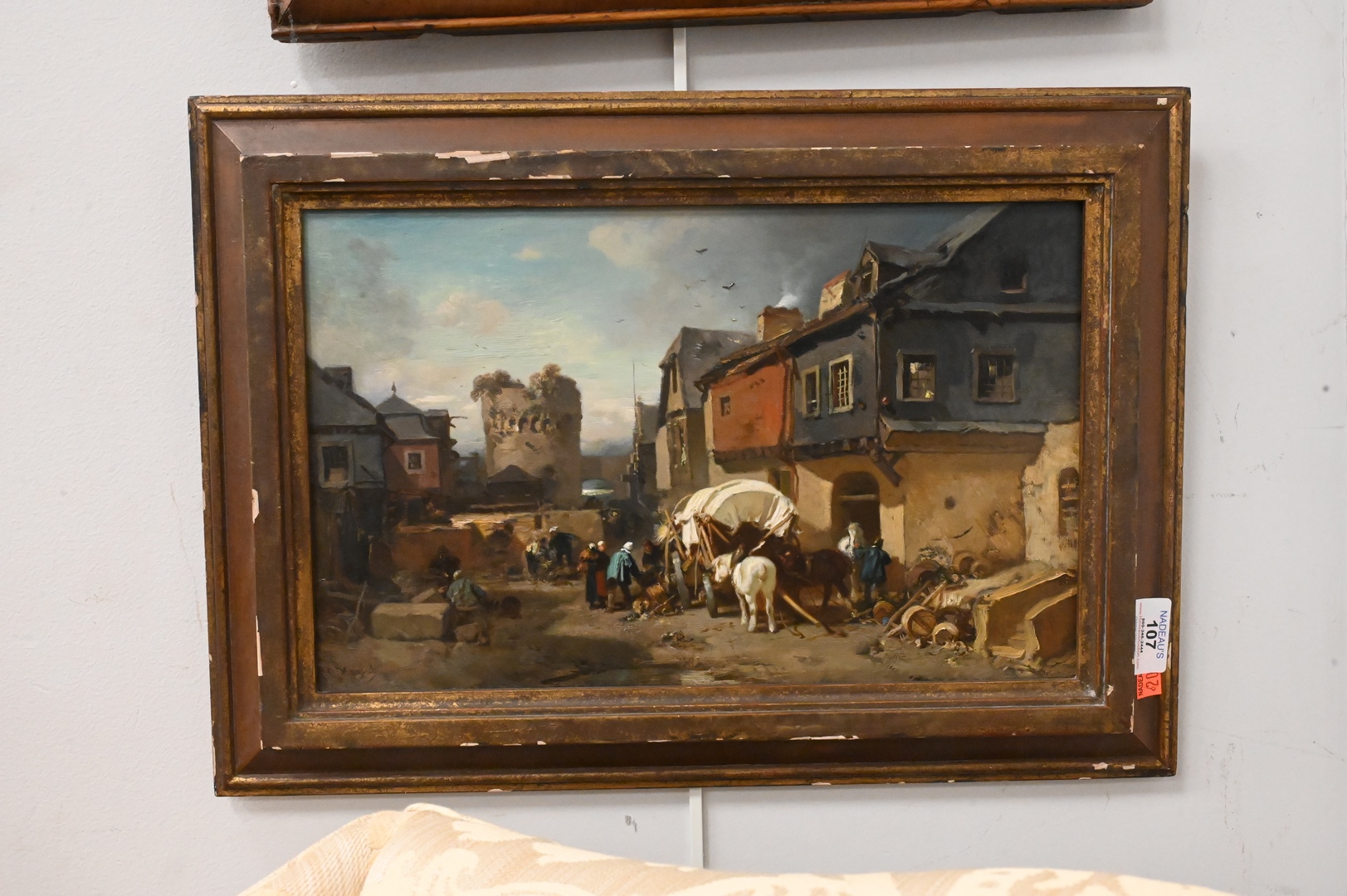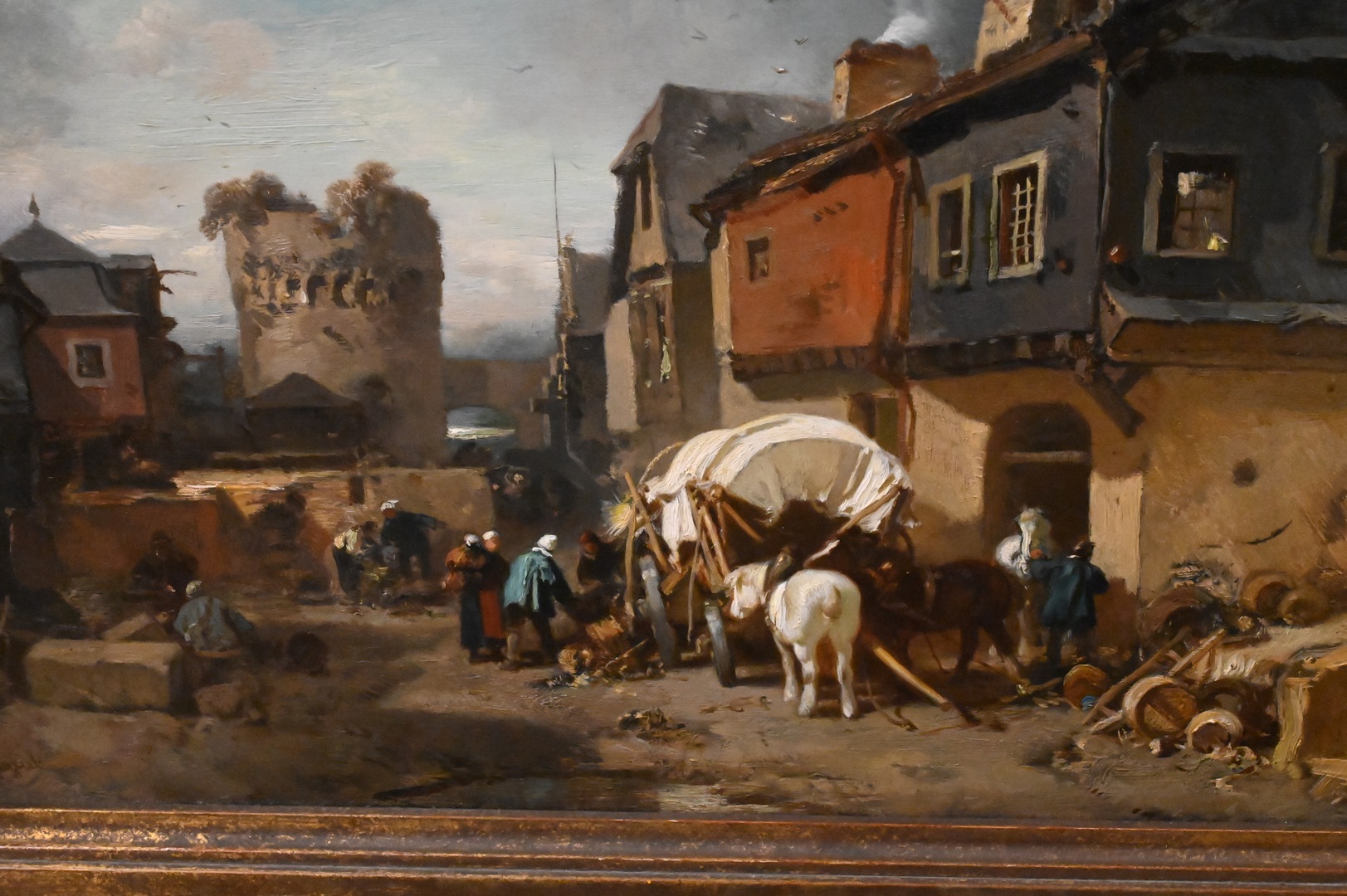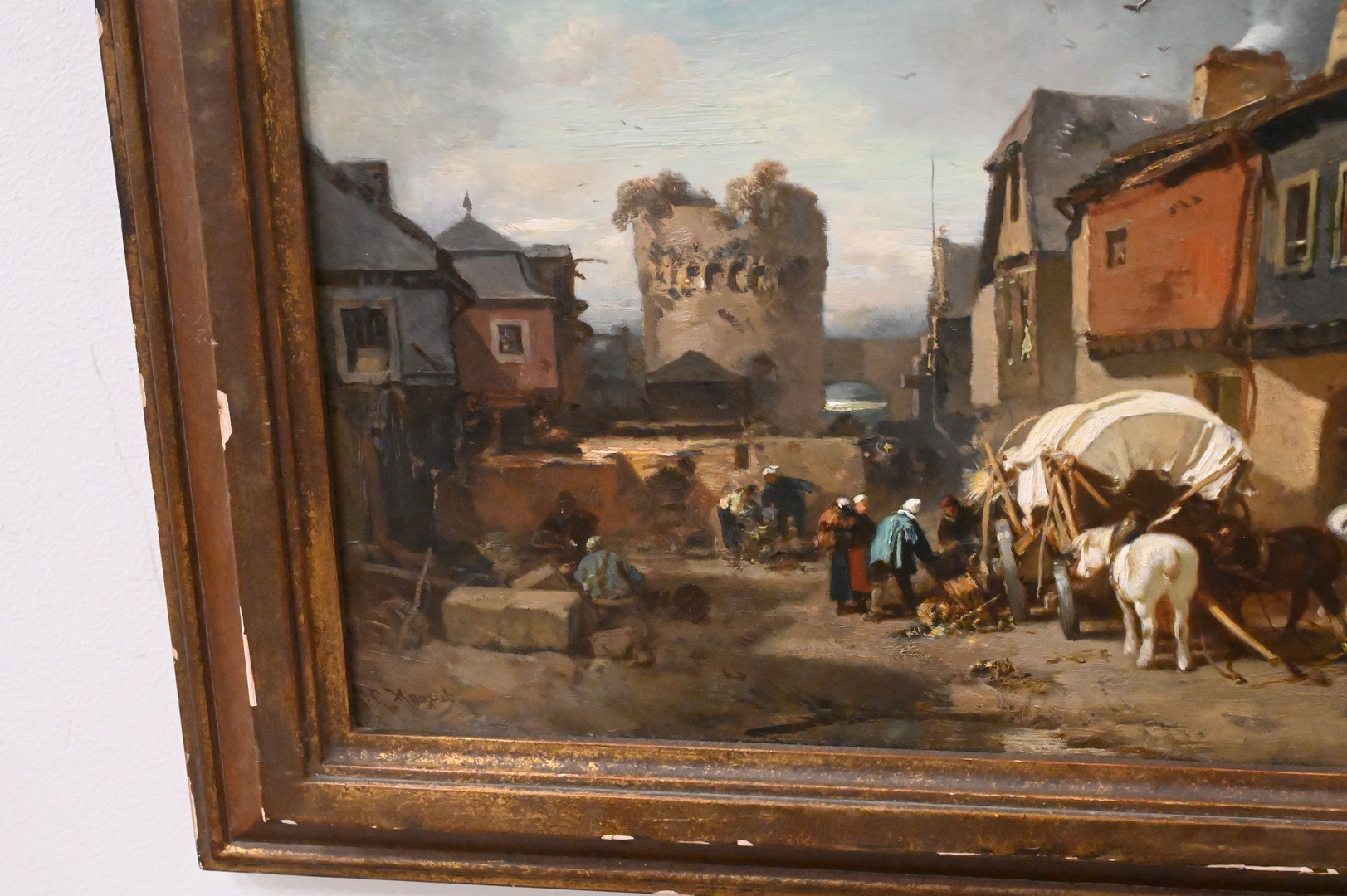 Oil on Board, village market, artist unknown, signed illegibly lower right “C. Hoguet”?, 9 3/4″ x 15″.