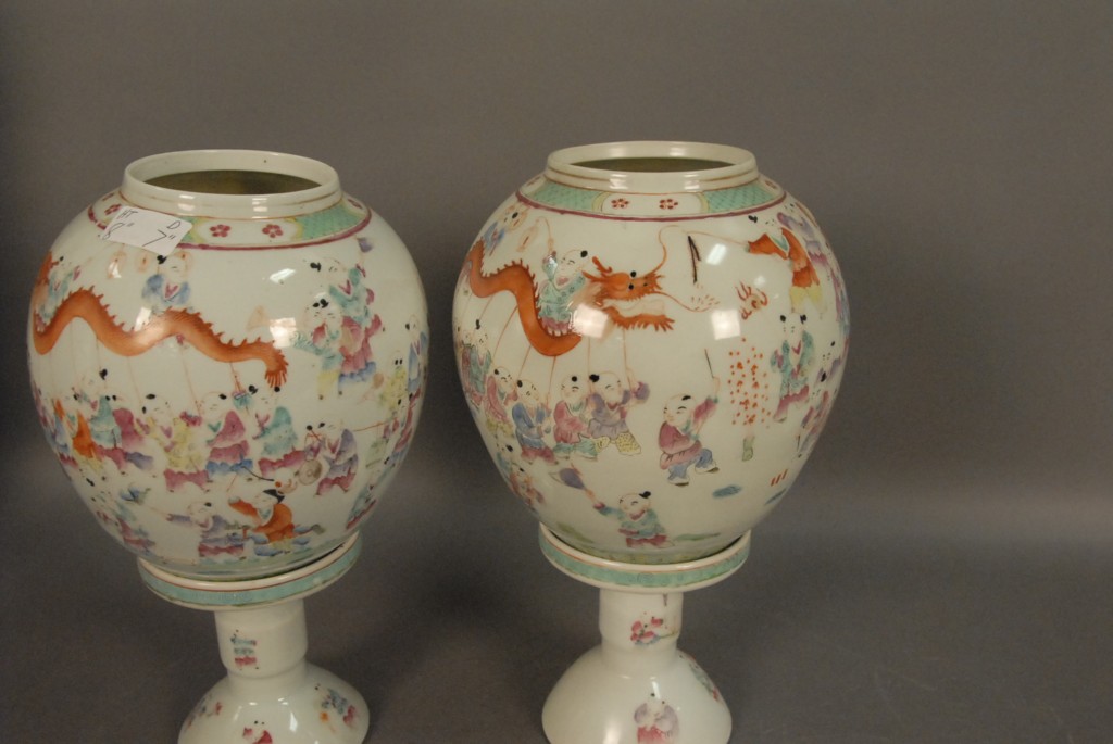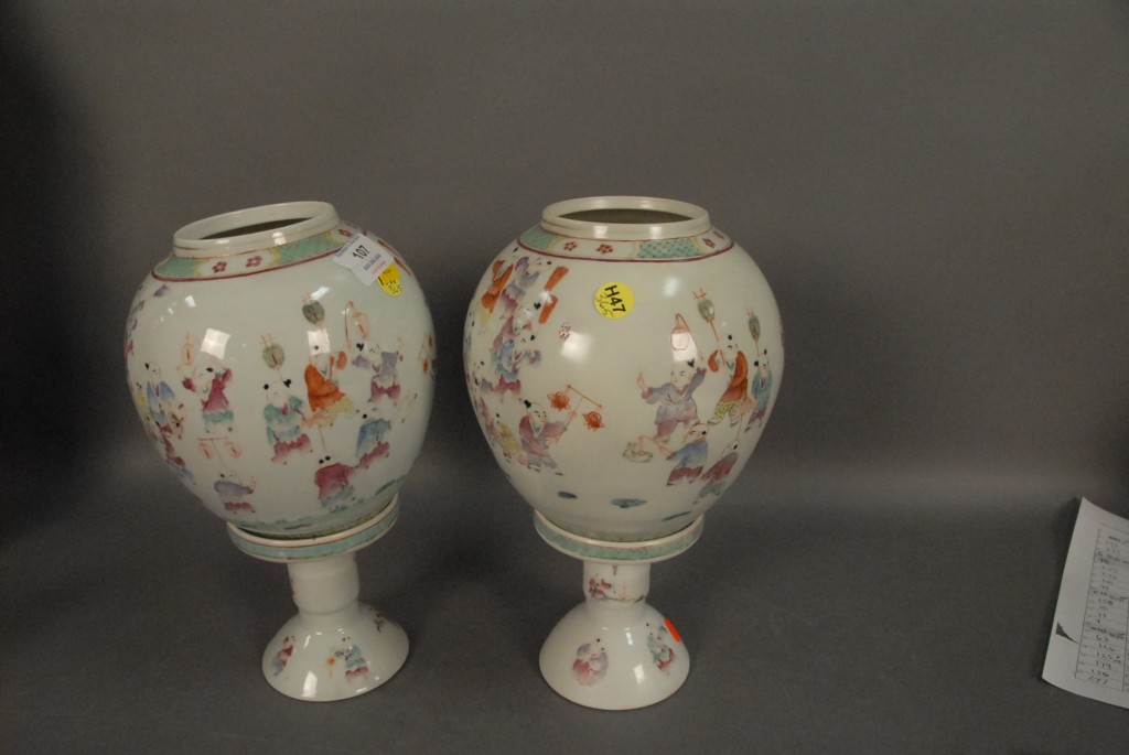 Lot 107: Pair of Republic Period boys wedding lamps, both in two parts, painted throughout with boys playing one as is, ht. 12.
