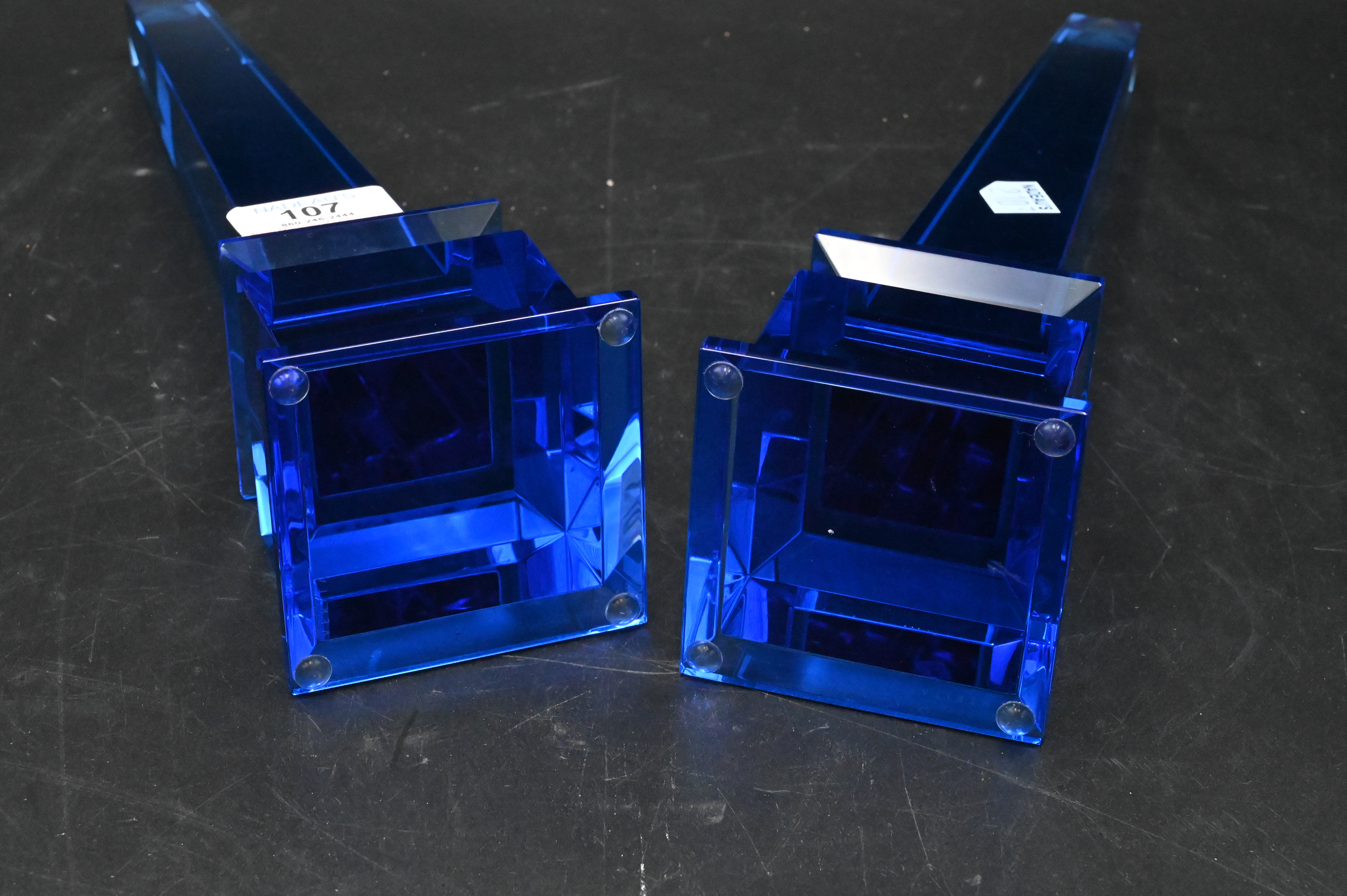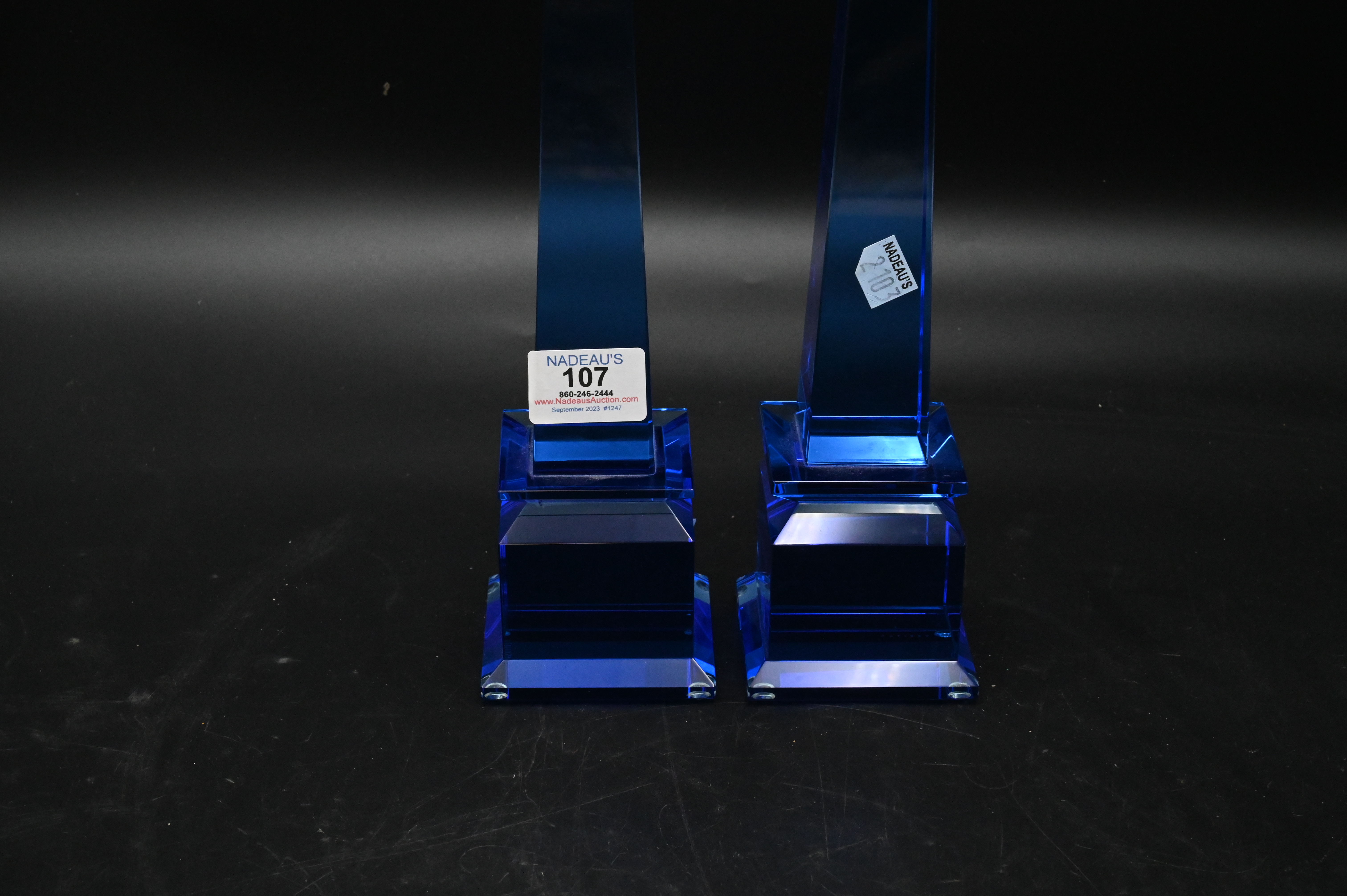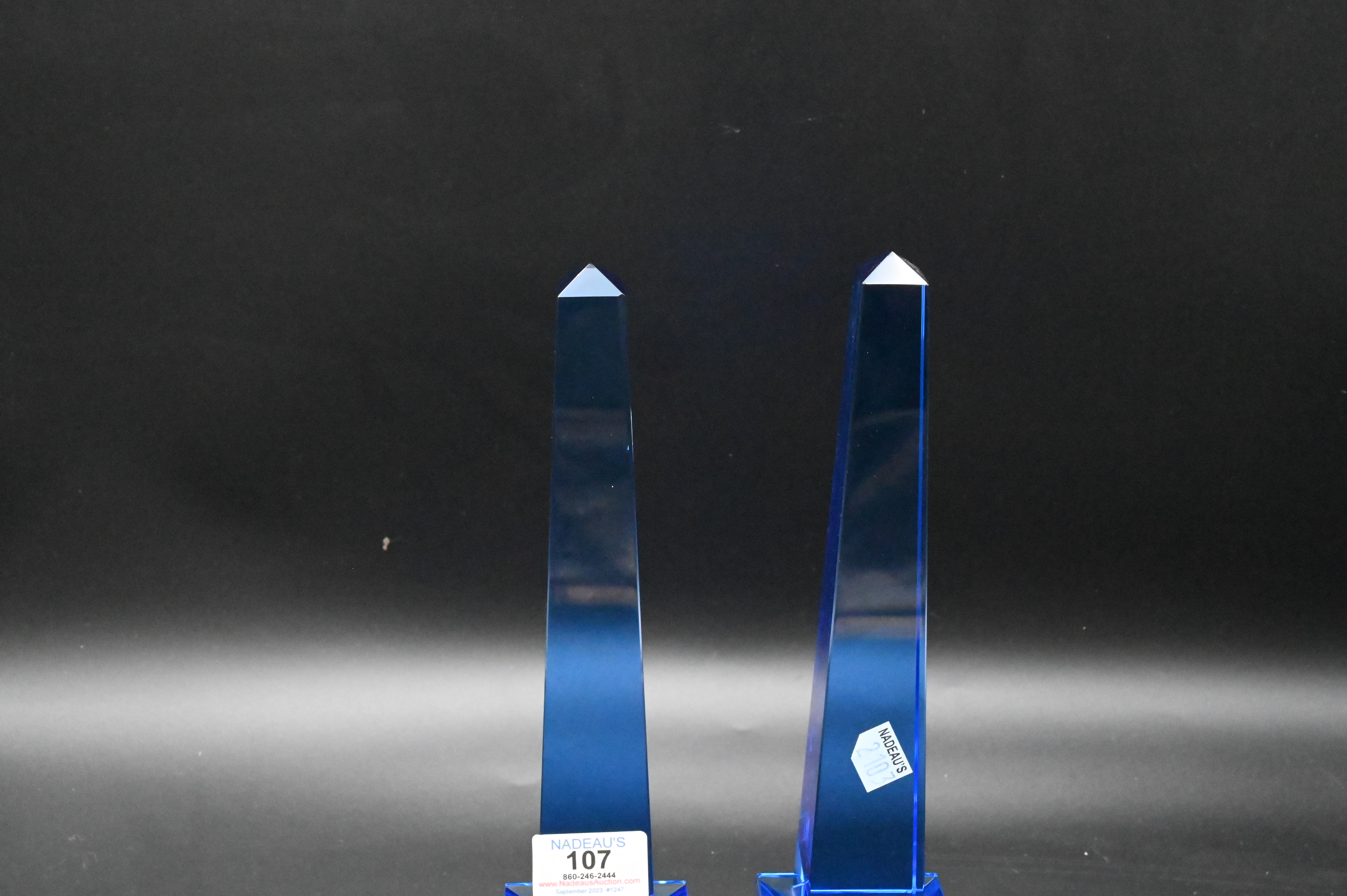 Pair of Veritas Blue Glass Obelisks, marked Veritas on bottom, height 12 1/2 inches.