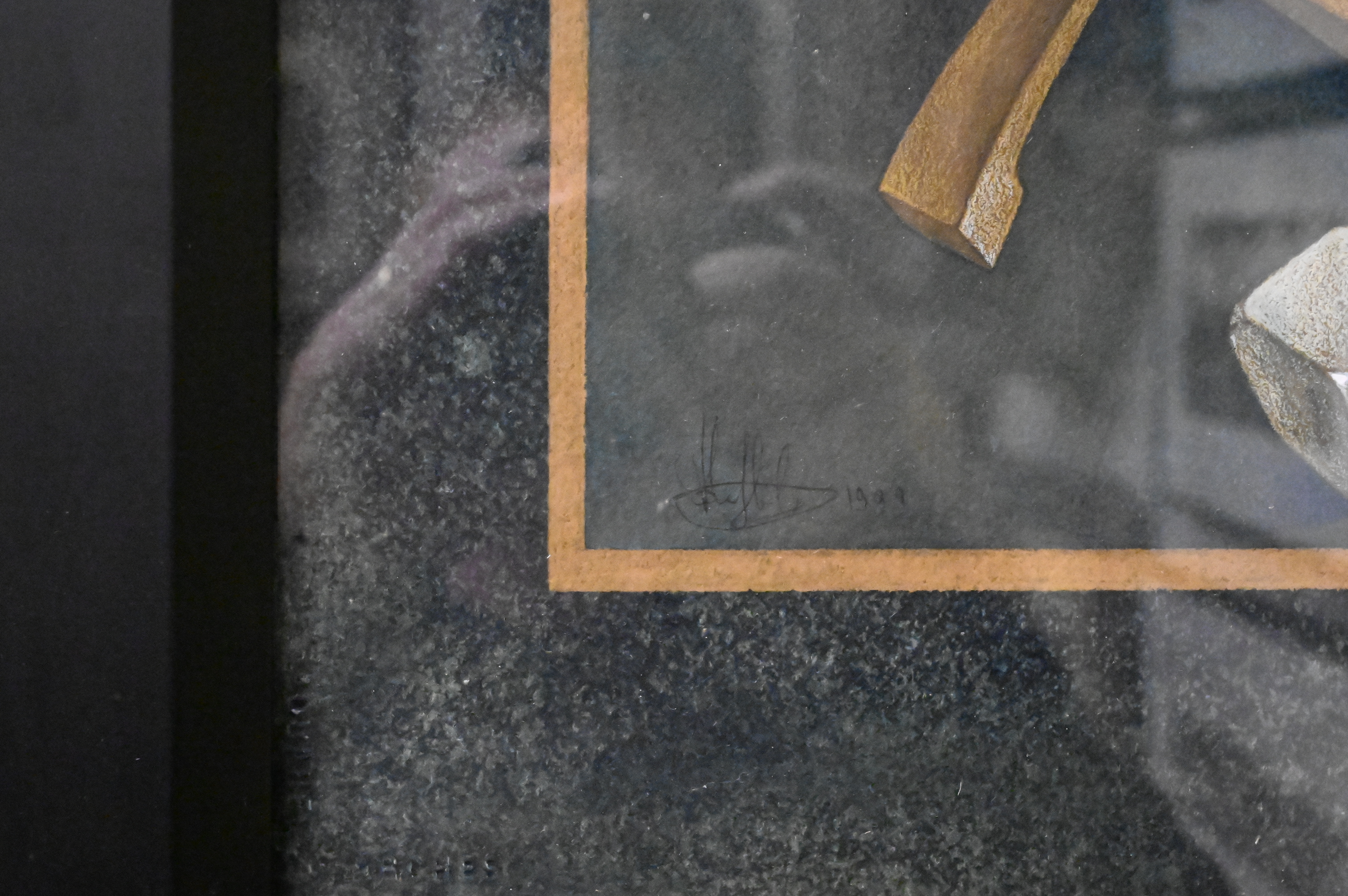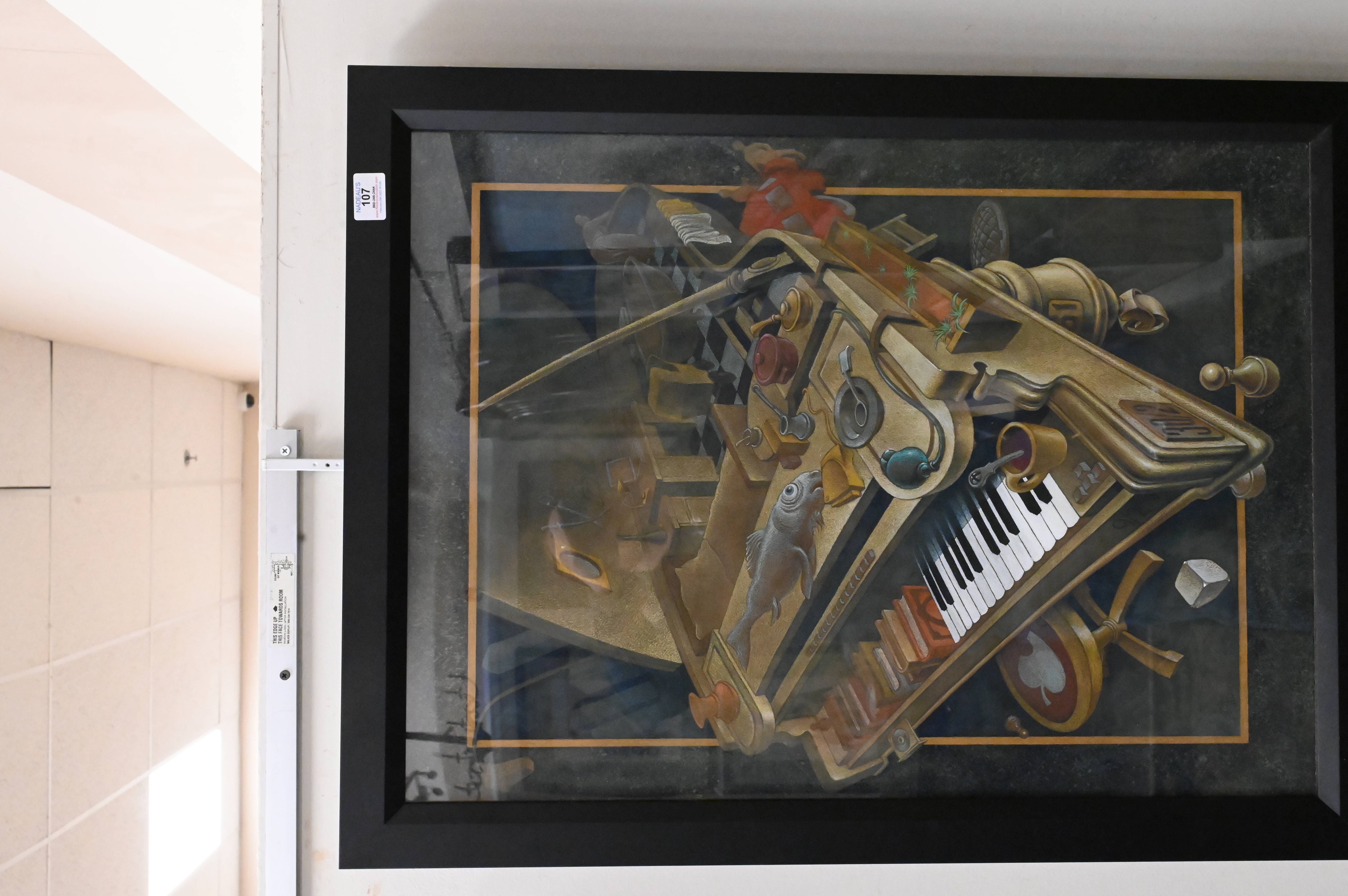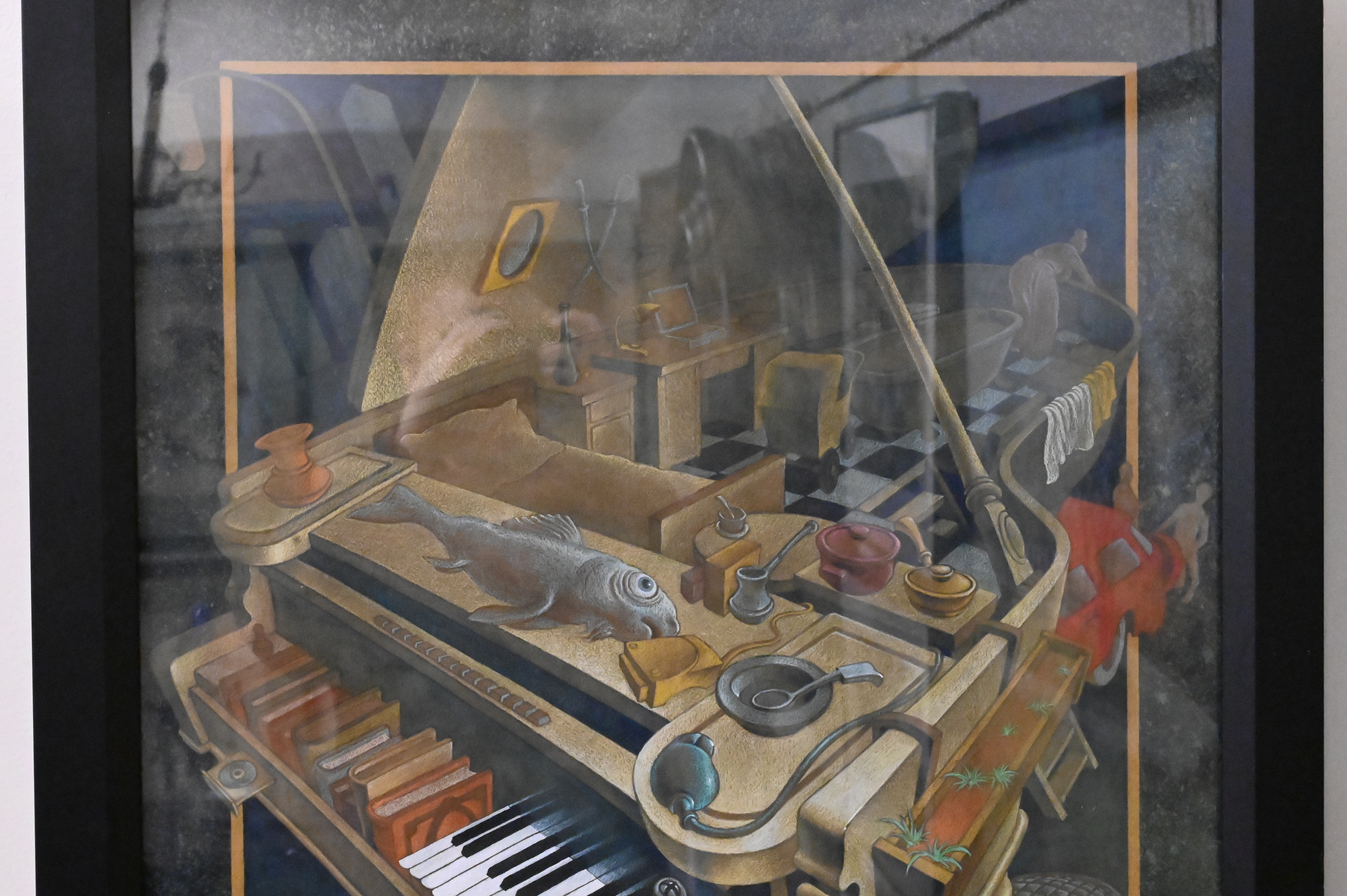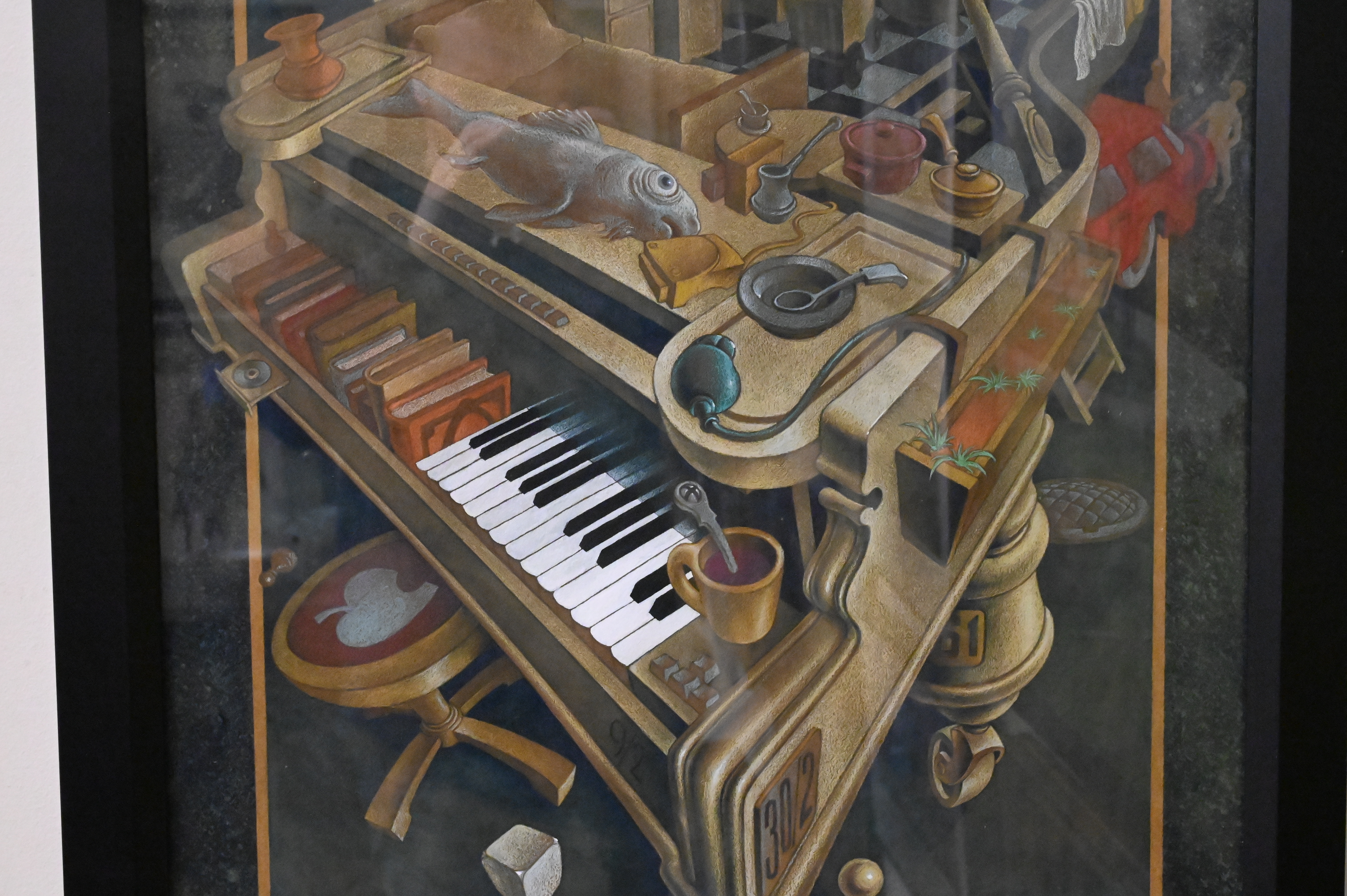 Sergey Poyarkov (Ukrainian, b. 1965), mixed media on paper, ‘Birthday’, signed and dated lower left “Sergey Poyarkov, 1999″, 22″ x 30”. Provenance: Estate of Peter Tillou, Litchfield, Connecticut.
