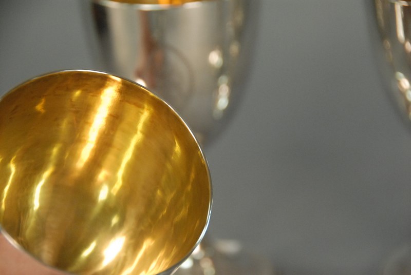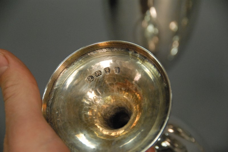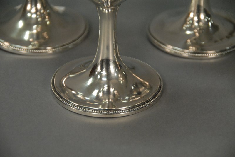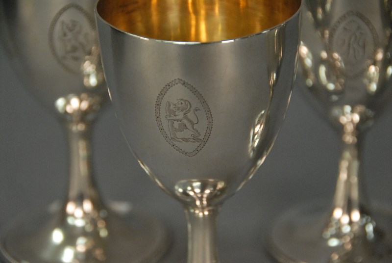 Lot 107: Set of four Georgian silver stem cups monogramed with coat of arms and initialed small dents on one foot. ht. 5 7/8in.