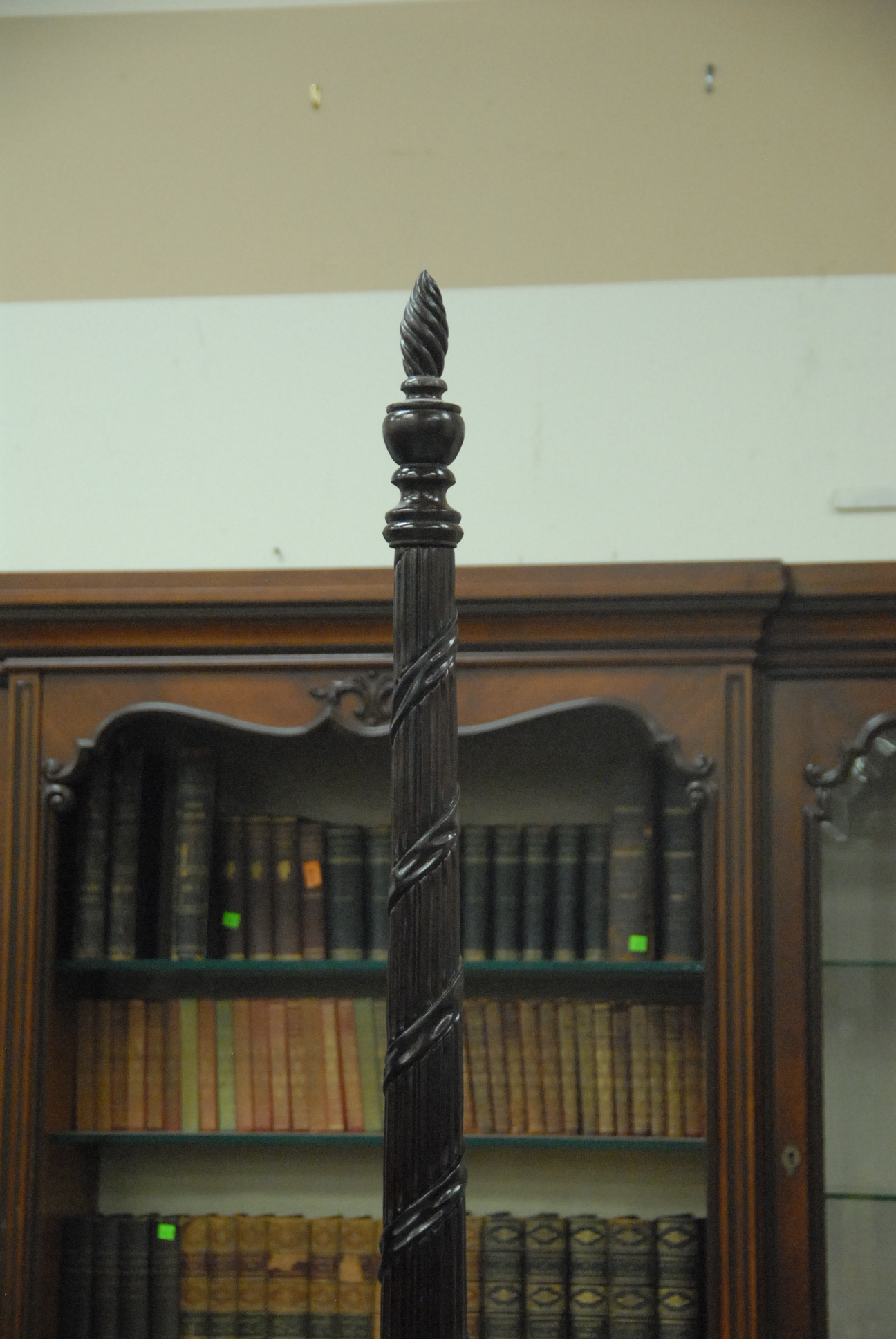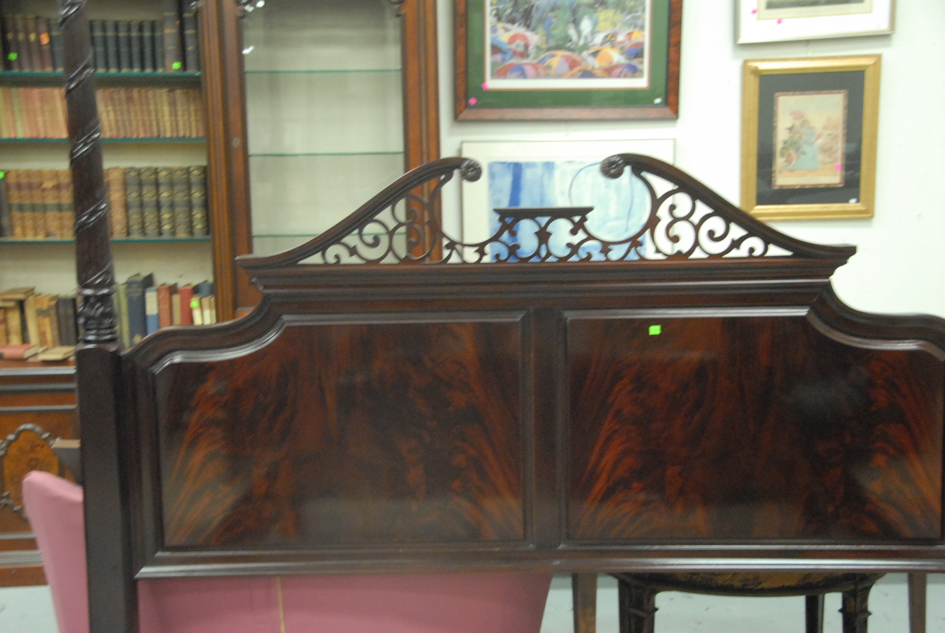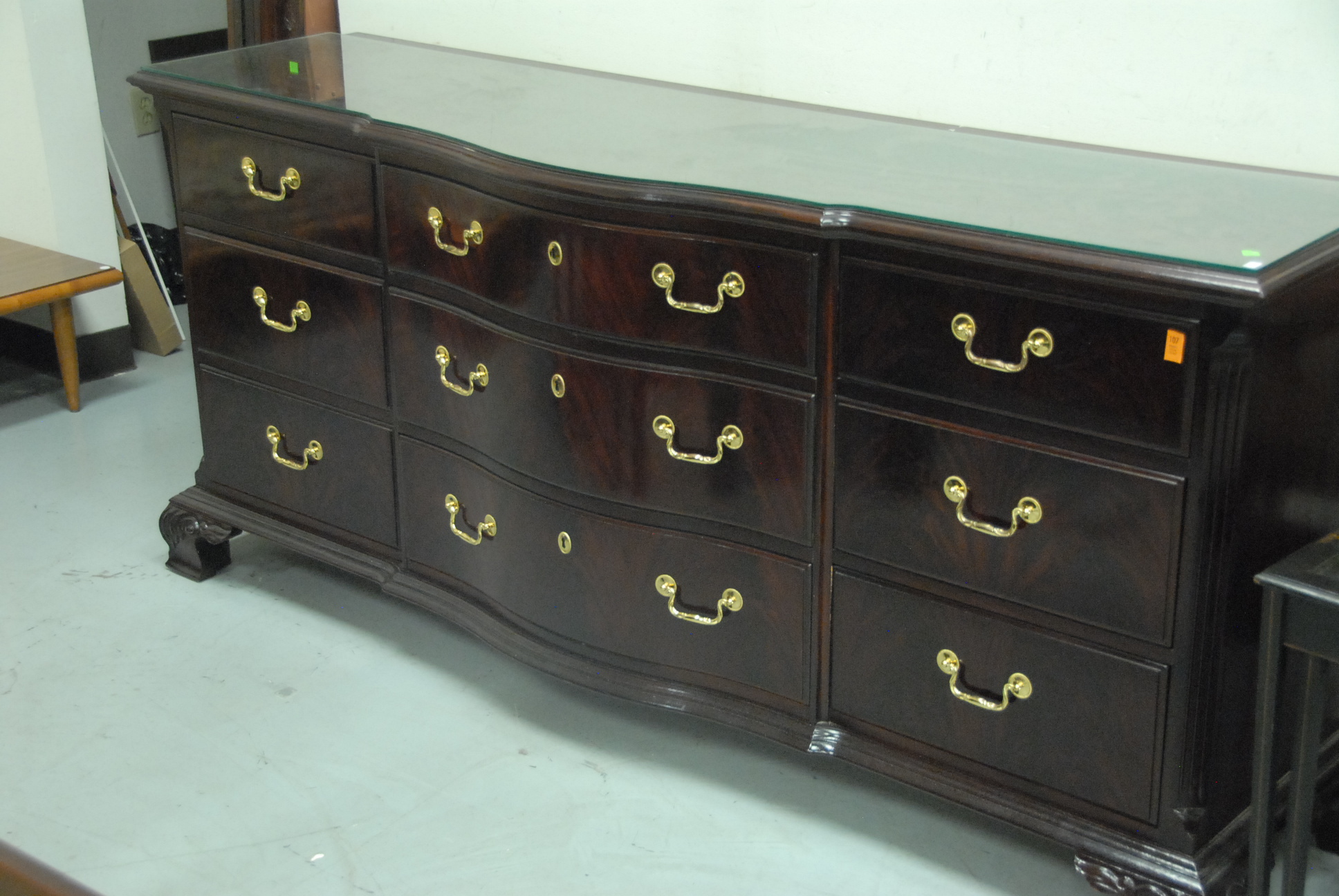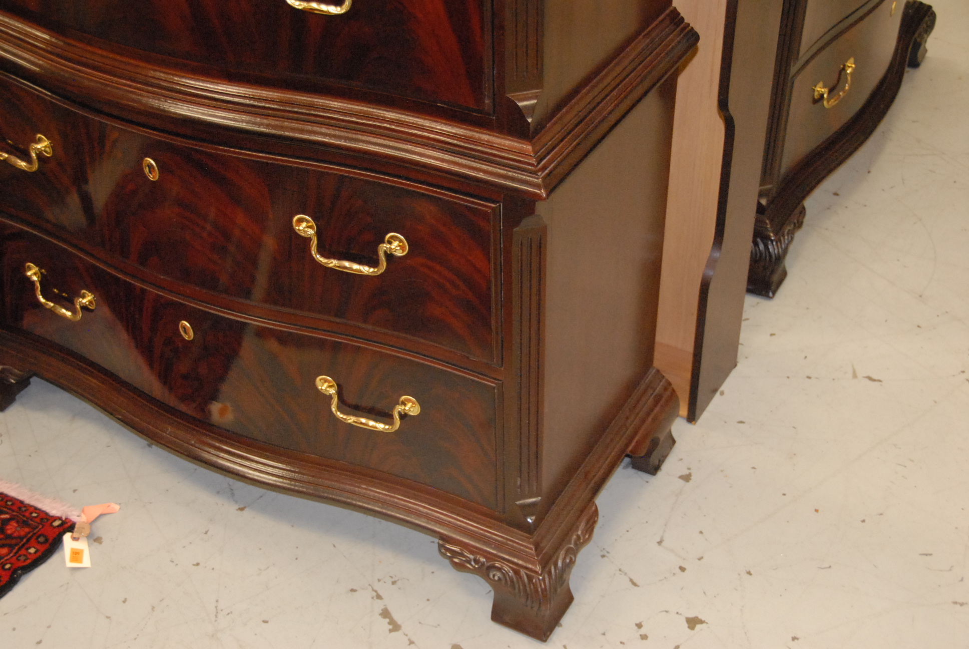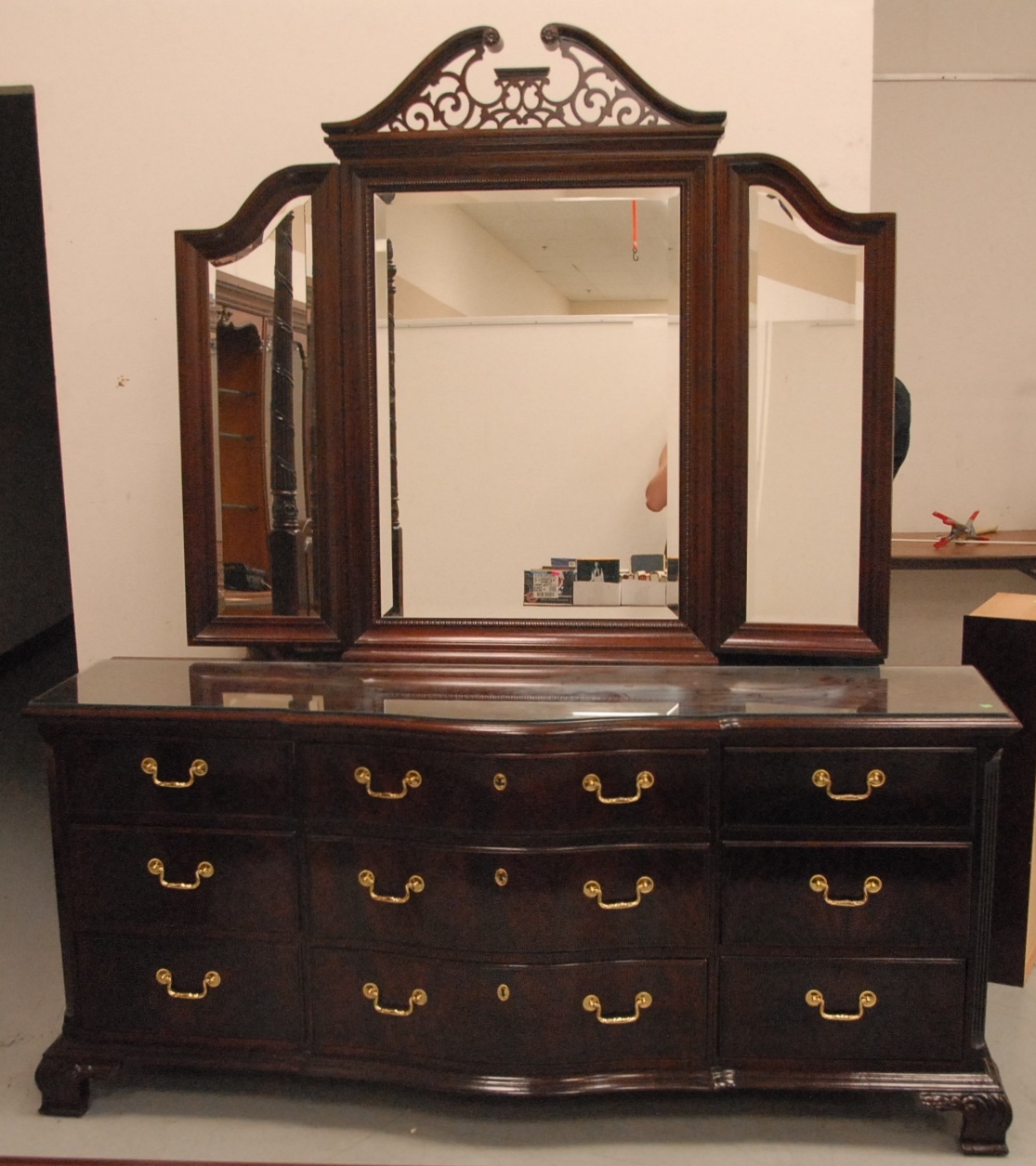 Lot 107: Thomasville mahogany bedroom suite with king size four post bed, triple chest and mirror, and tall chest, tall chest: ht. 70in. wd….
