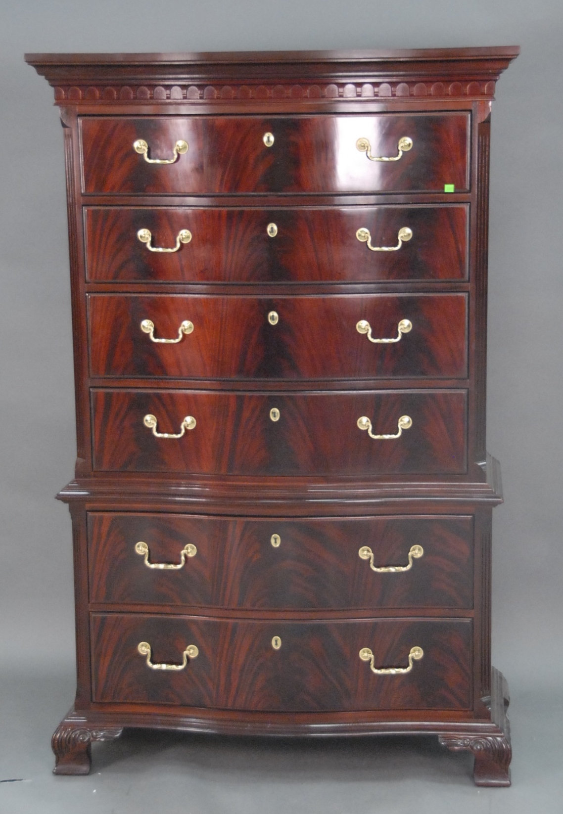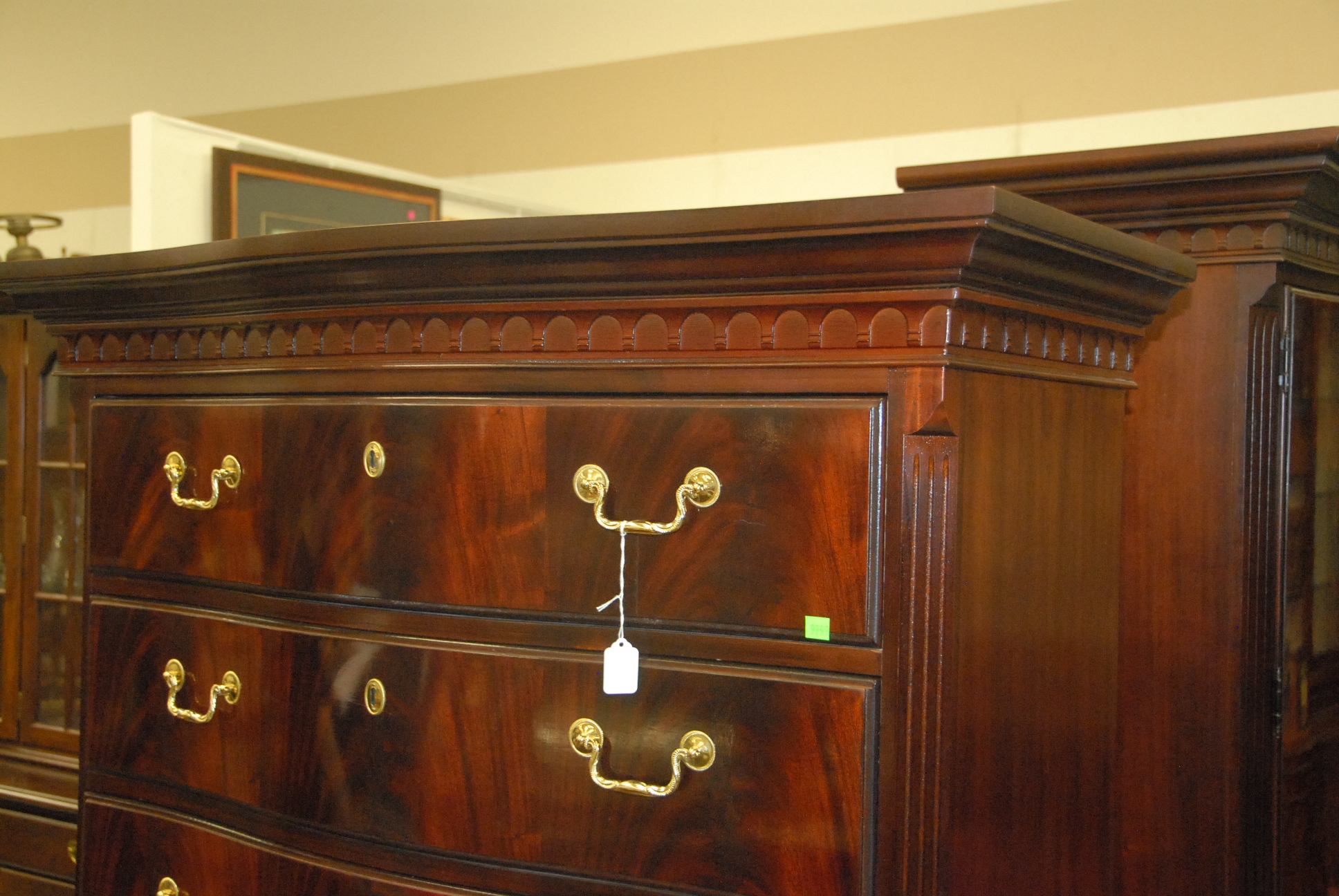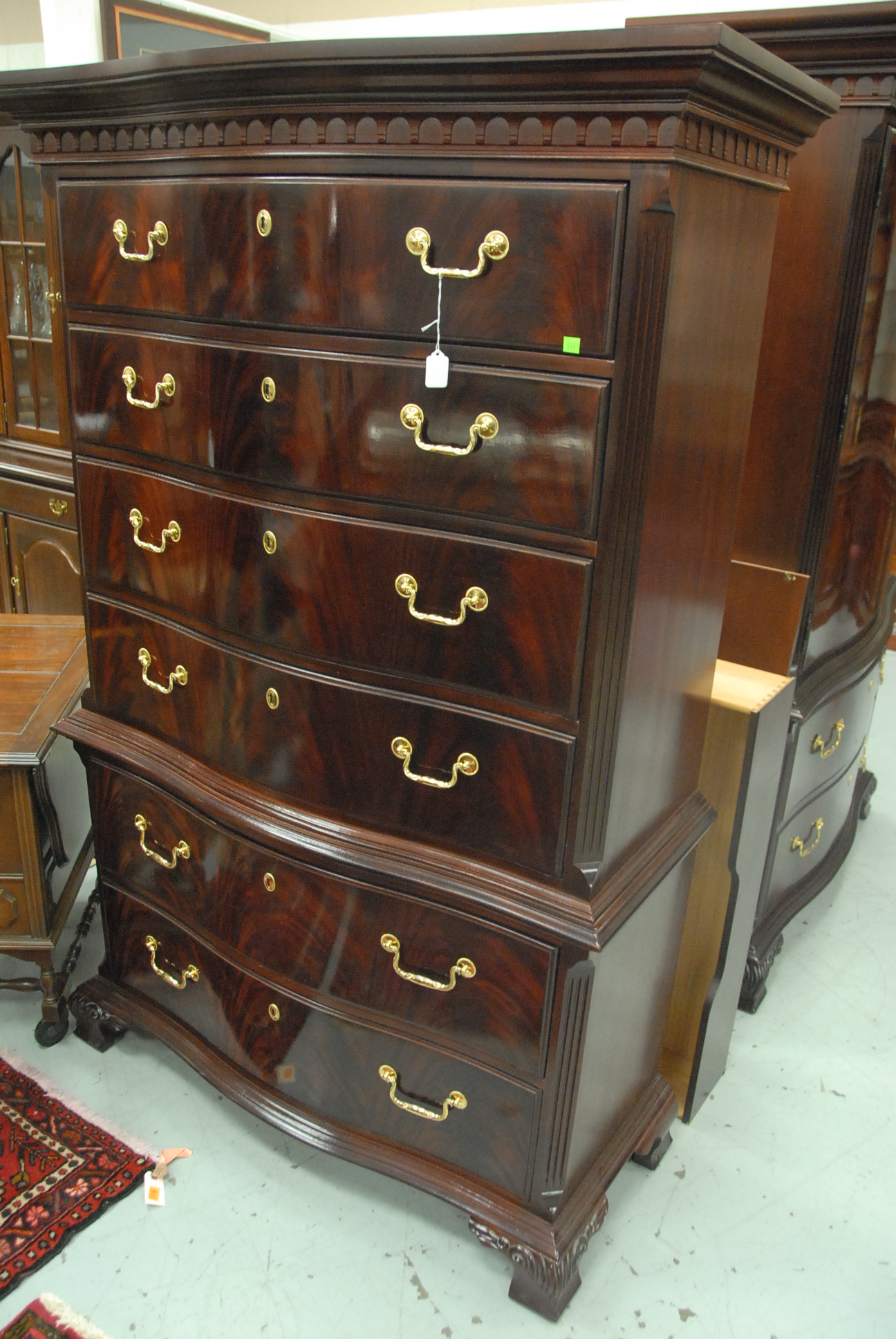 Thomasville mahogany bedroom suite with king size four post bed, triple chest and mirror, and tall chest, tall chest: ht. 70in. wd. 43 1/2in. dp. 18in., bed: ht. 89in.