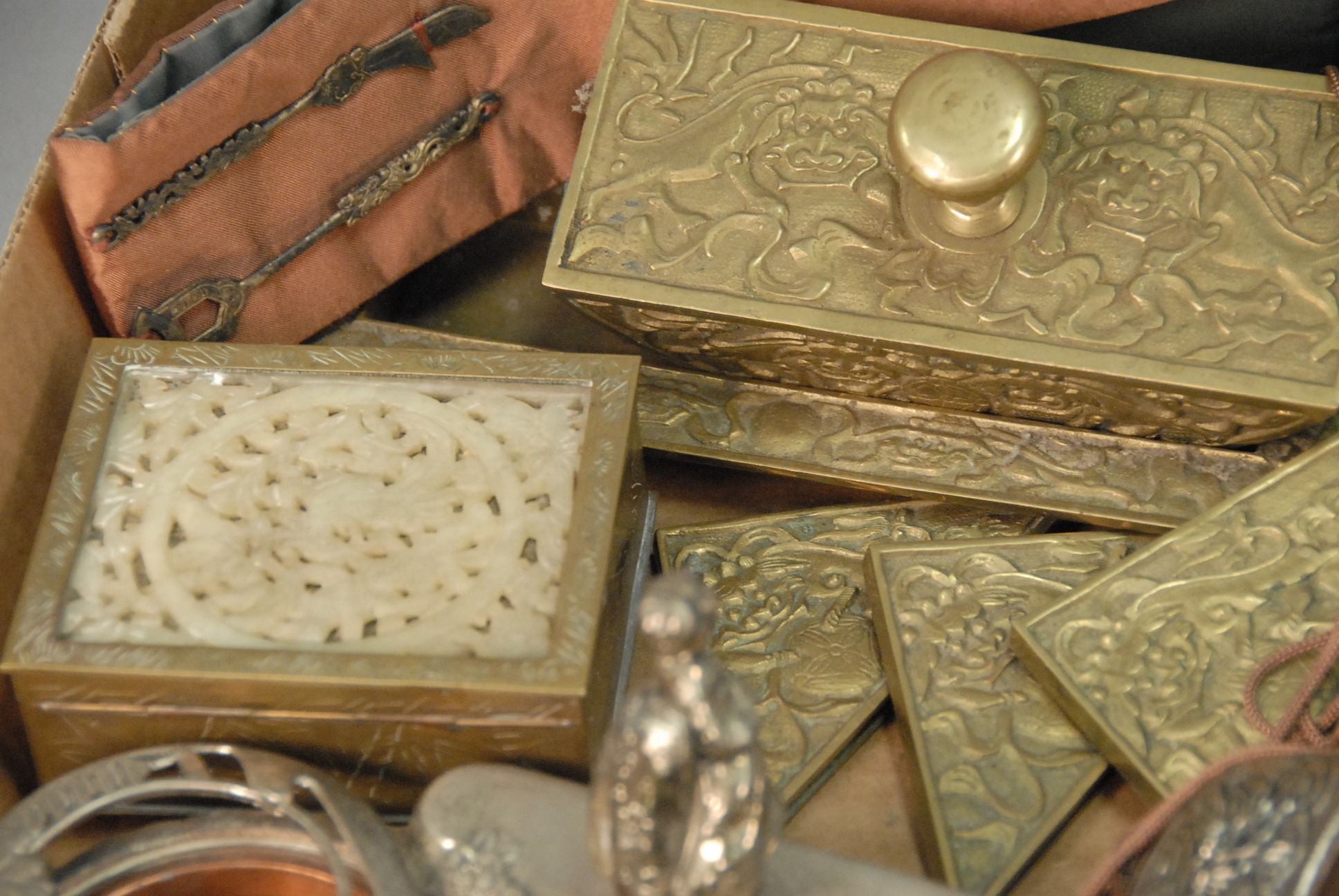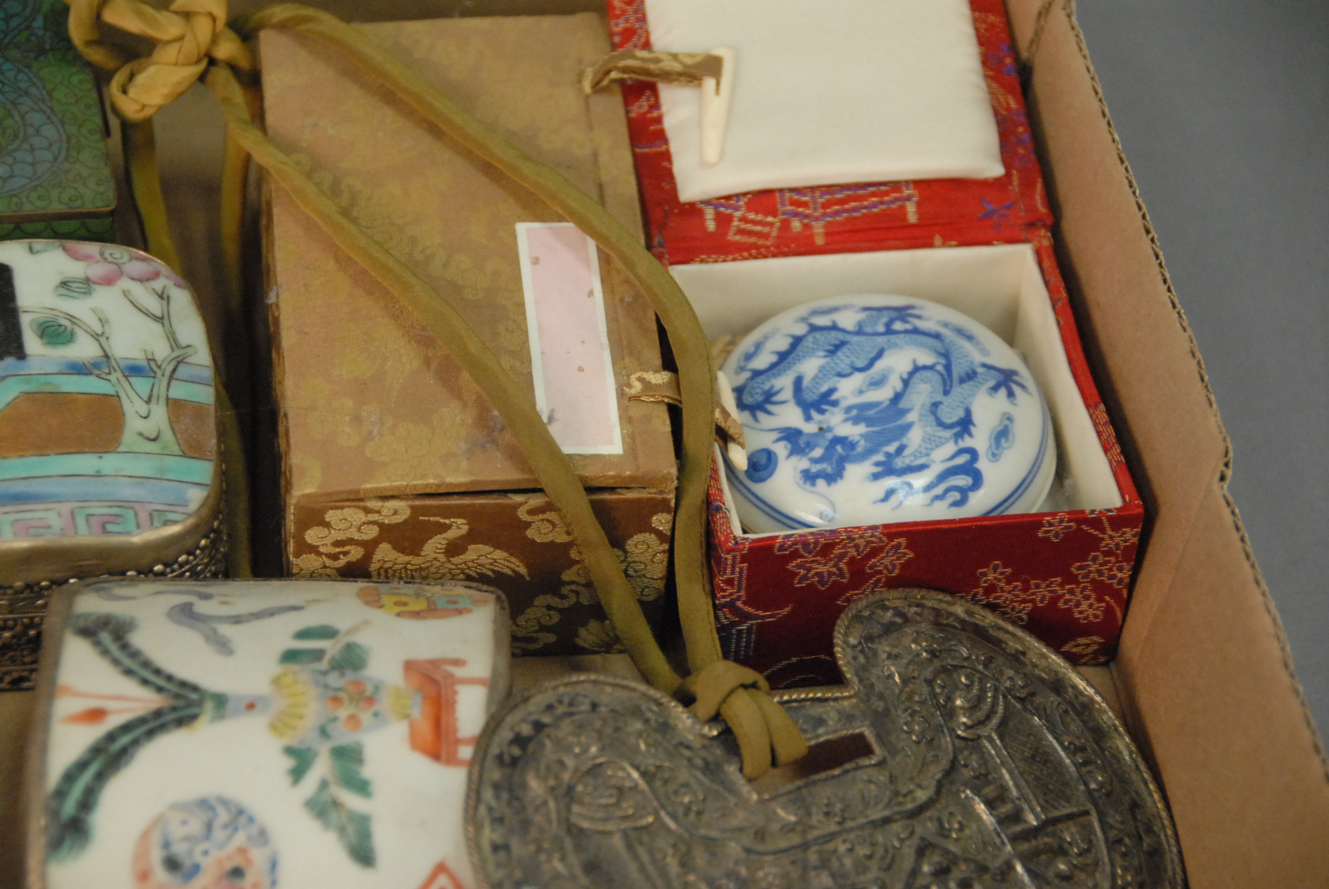 Lot 107: Two box lots of Chinese items to include desk set box with hardstone, small boxes, silver shield, blue and white round seal box with…