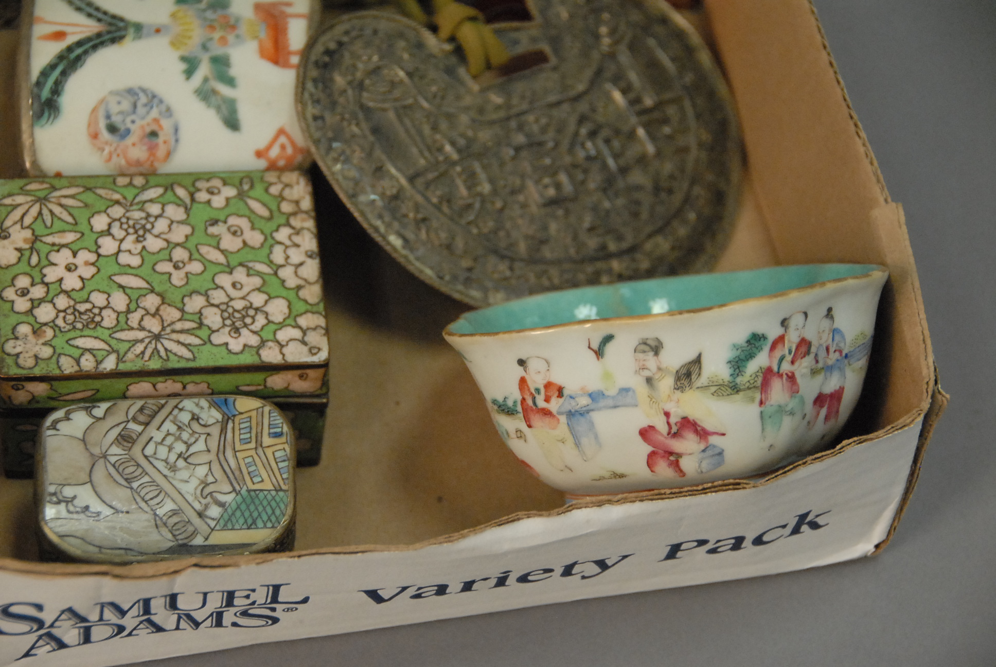 Two box lots of Chinese items to include desk set box with hardstone, small boxes, silver shield, blue and white round seal box with mark on bottom, and small bowl with seal mark on bottom.