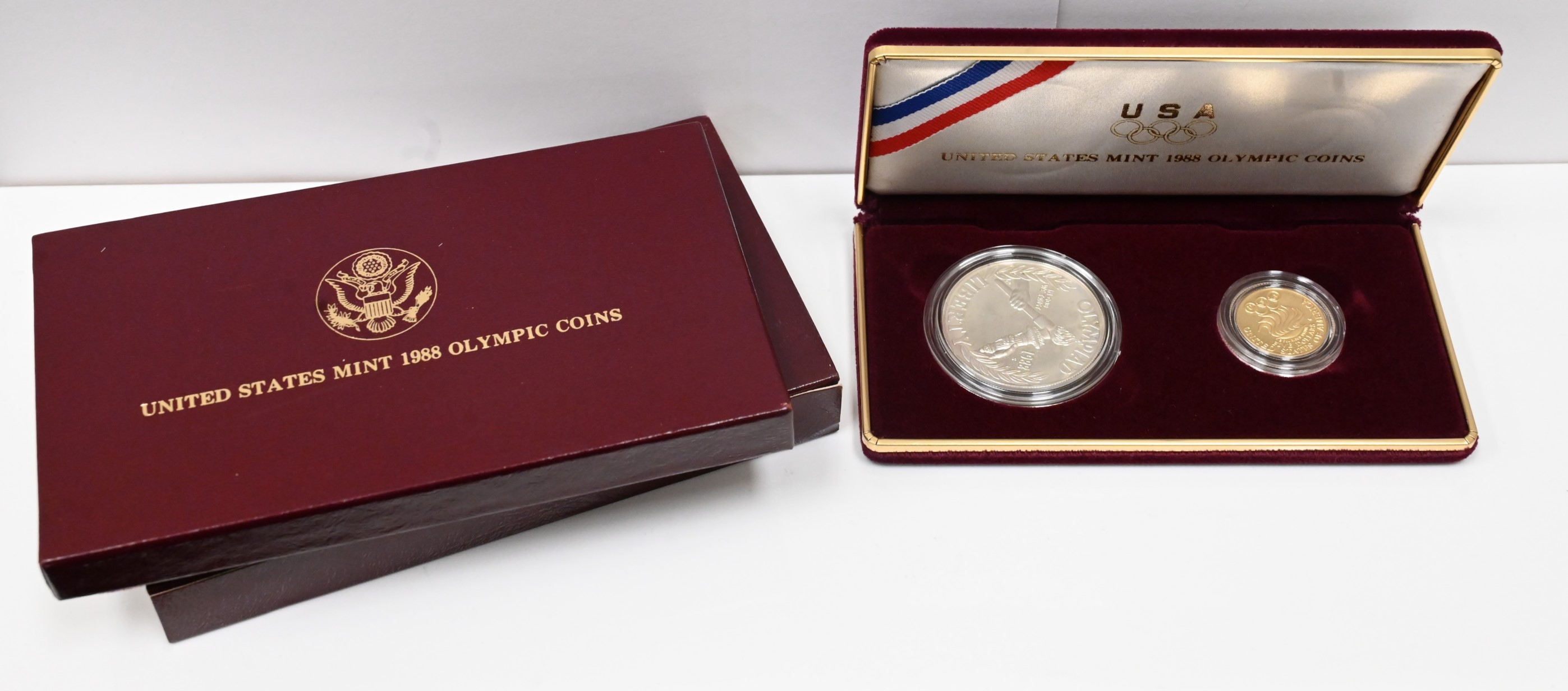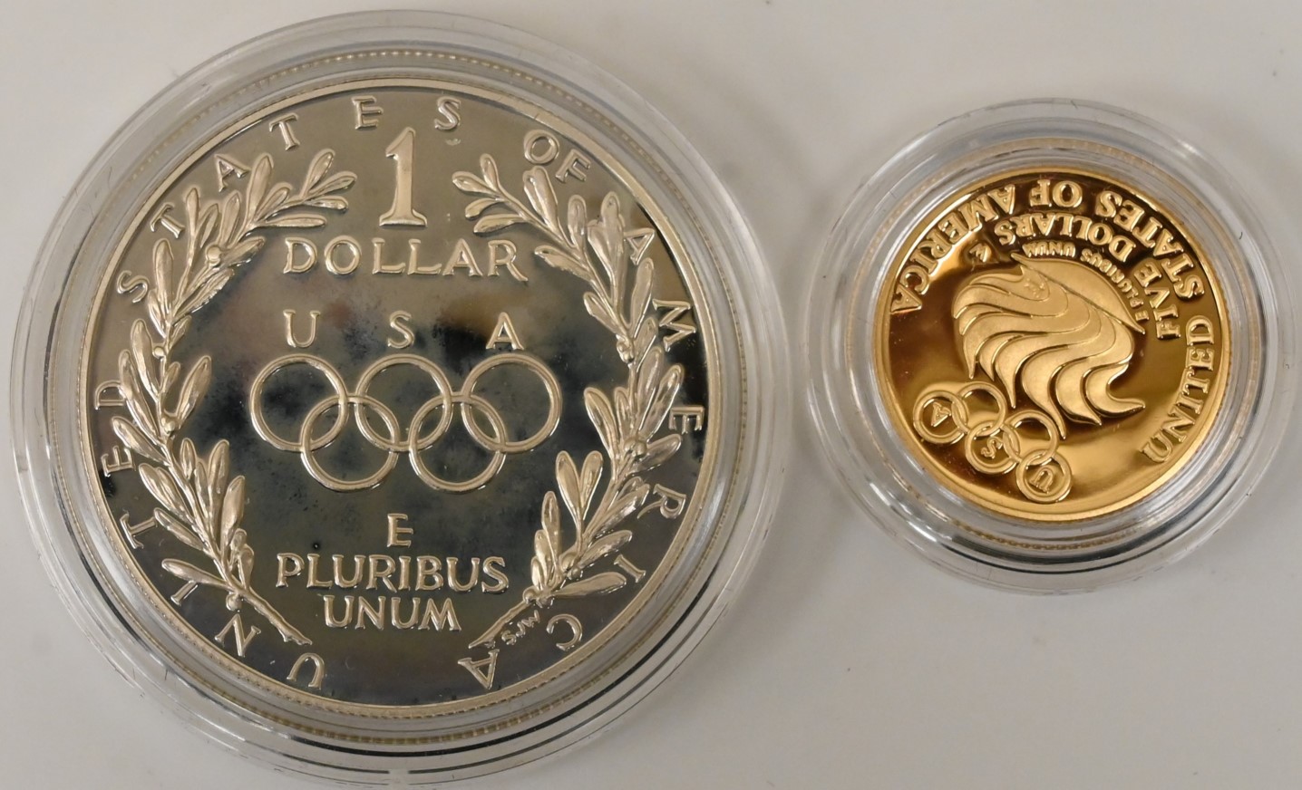 Two Coin Set of Olympic Proofs, to include $5 dollar gold and one 1 oz. silver dollar.