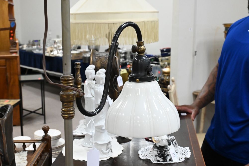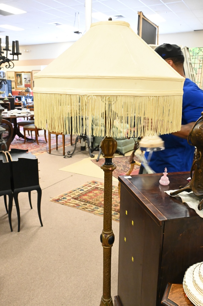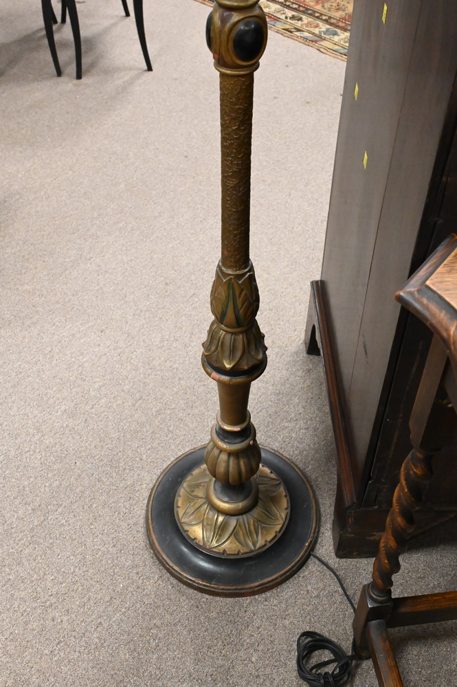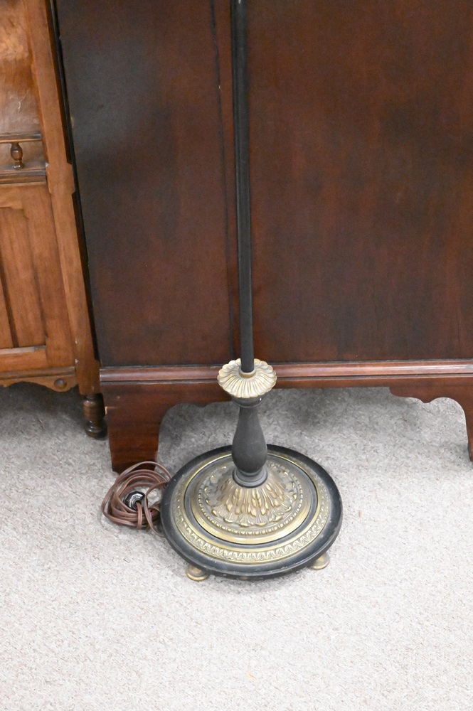 Two Neoclassical Floor Lamps, one having glass shade, heights 64 and 66 inches.