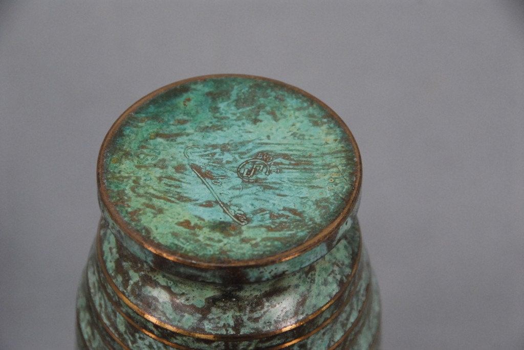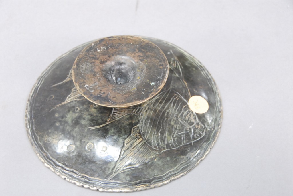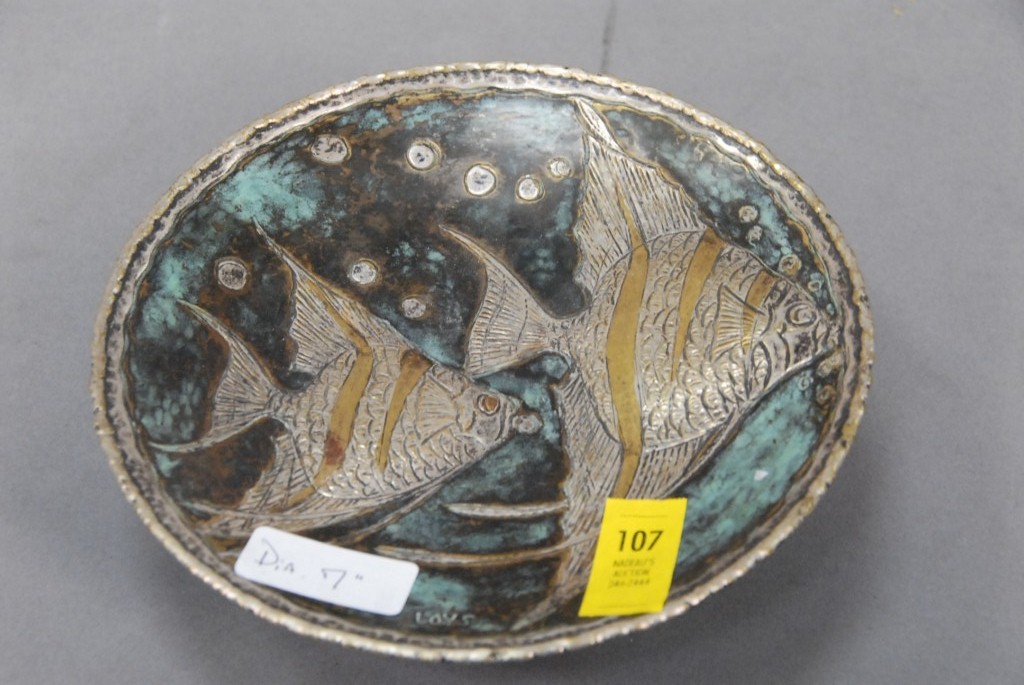 Lot 107: Two piece lot bronze and silver fish decorated compote dia. 7 signed Loys and bronze vase signed Carl Sorensen.
