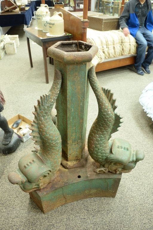 Lot 107: Victorian iron base with three large dolphin. dolphin ht. 30in., total ht. 45in. Provenance: Collection of Anne Jones Willis and the…