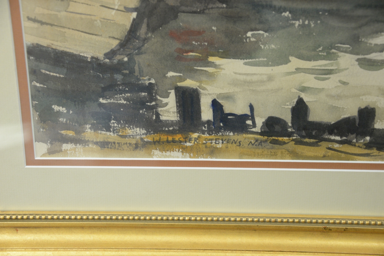 William Lester Stevens (American, 1888 – 1969), Boatyard, watercolor on paper, signed lower left “W. Lester Stevens N.A.”, sight size 14″ x 20″. Provenance: Estate of James Wadhams.