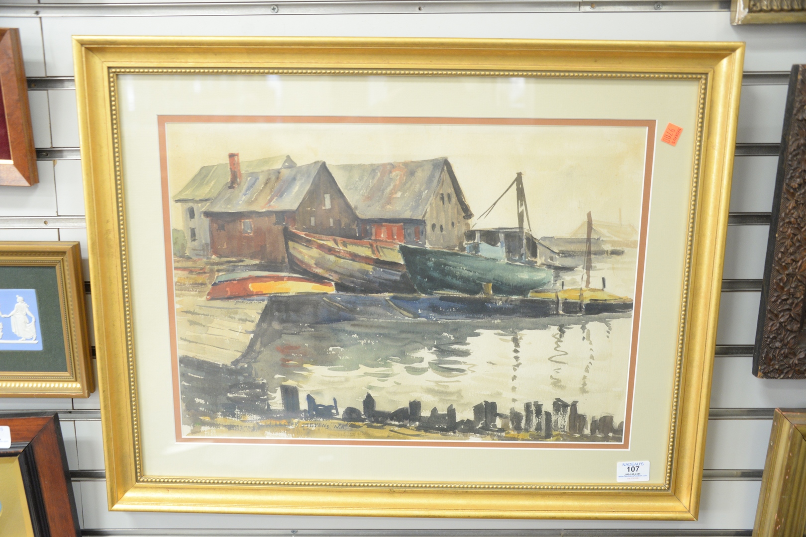 Lot 107: William Lester Stevens (American, 1888 – 1969), Boatyard, watercolor on paper, signed lower left “W. Lester Stevens N.A.”, sight size 14″ x 20″. Provenance: Estate of James Wadhams.