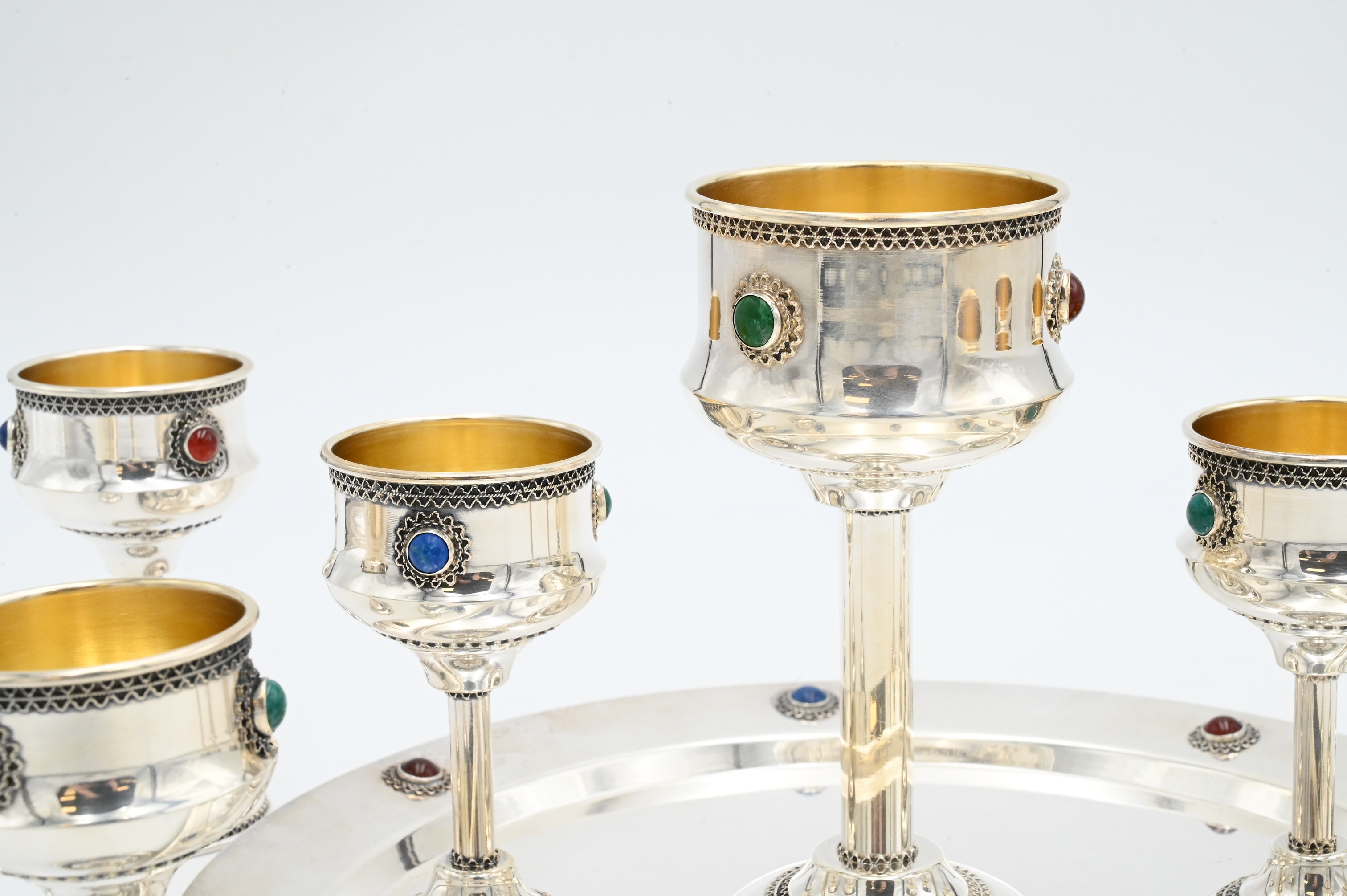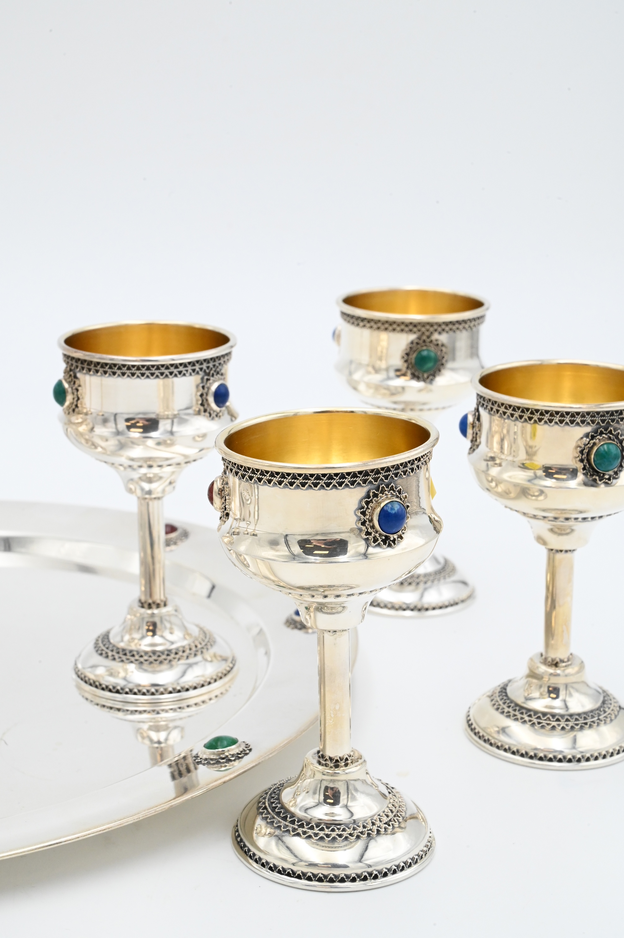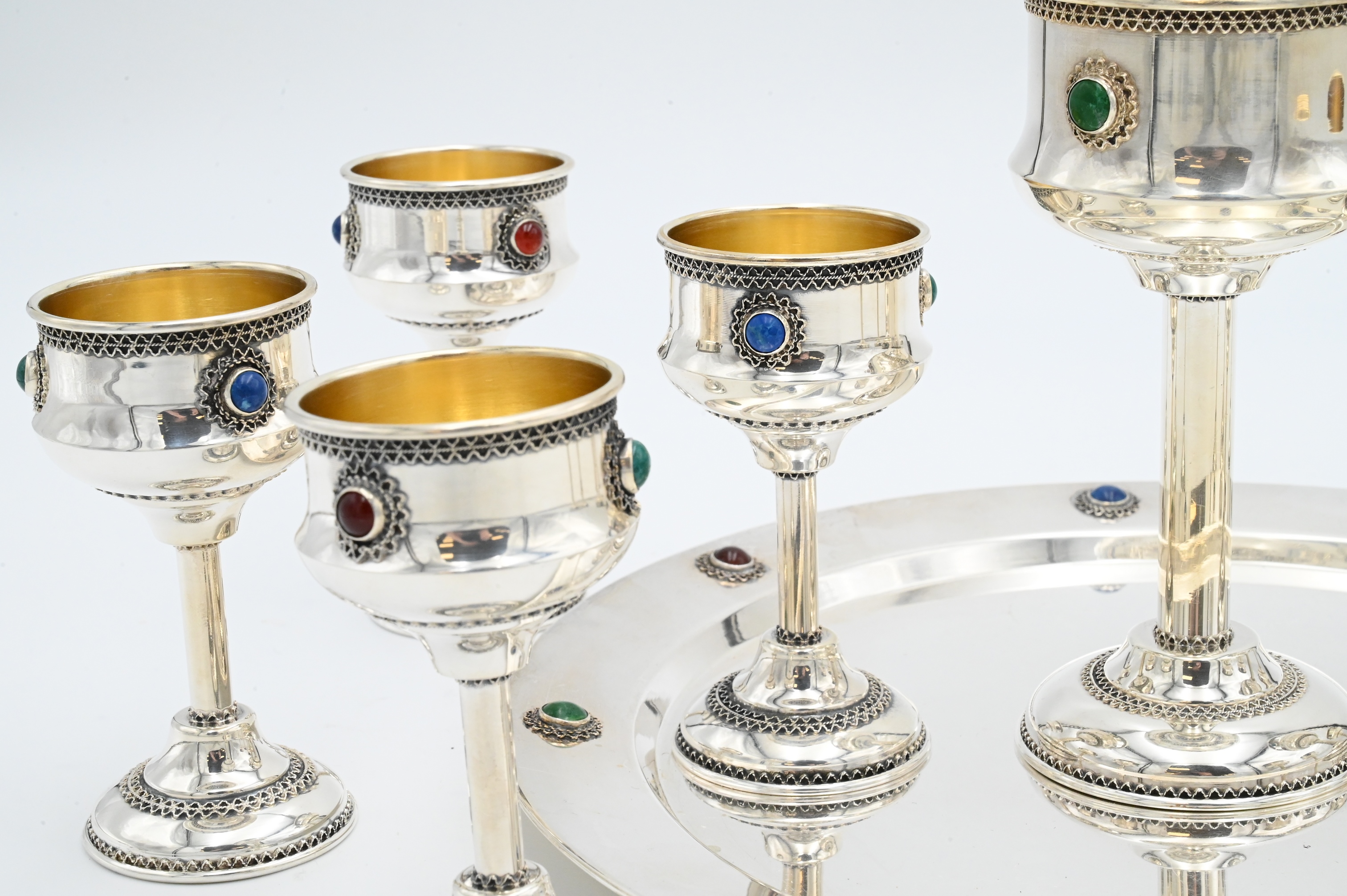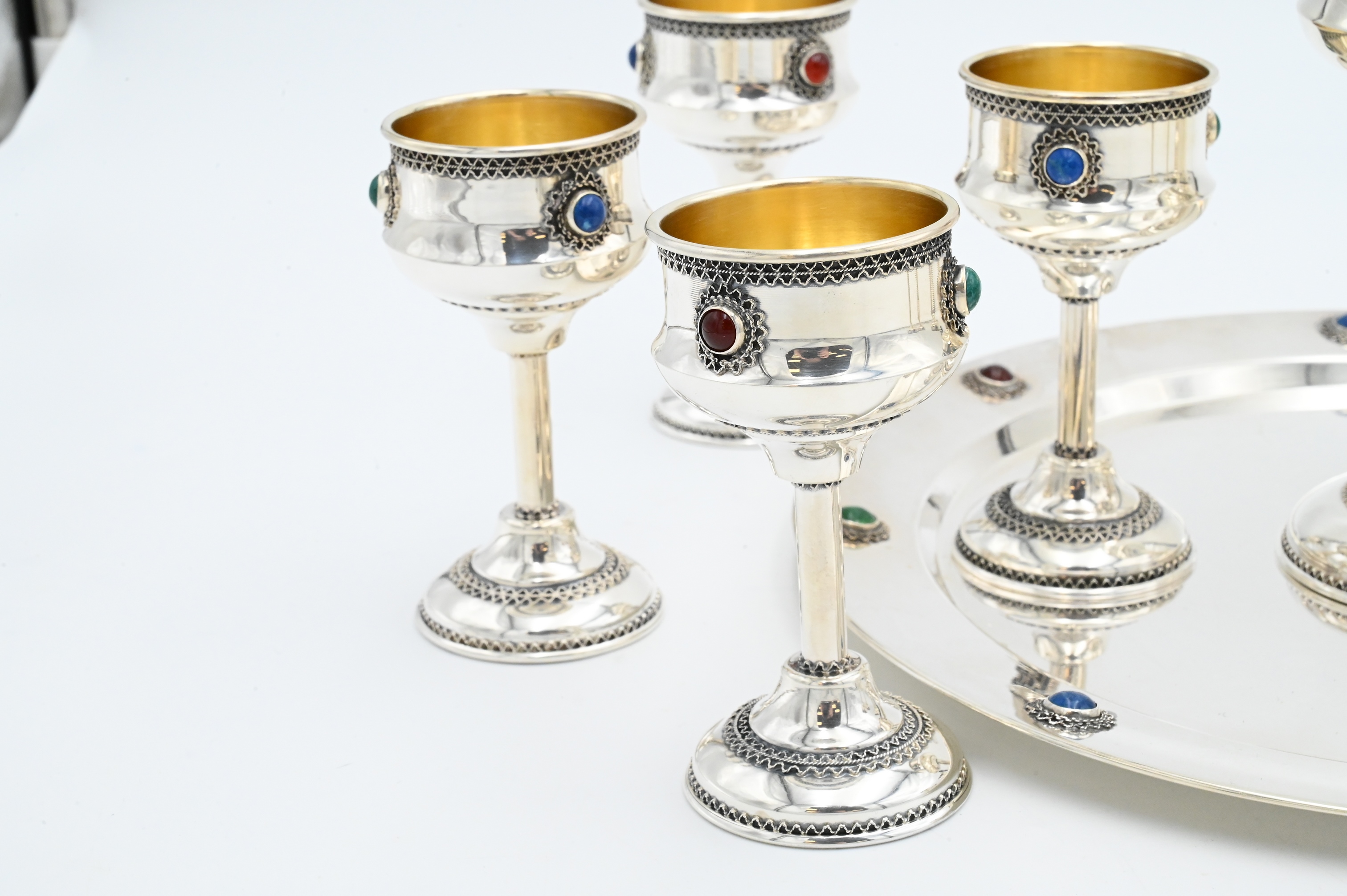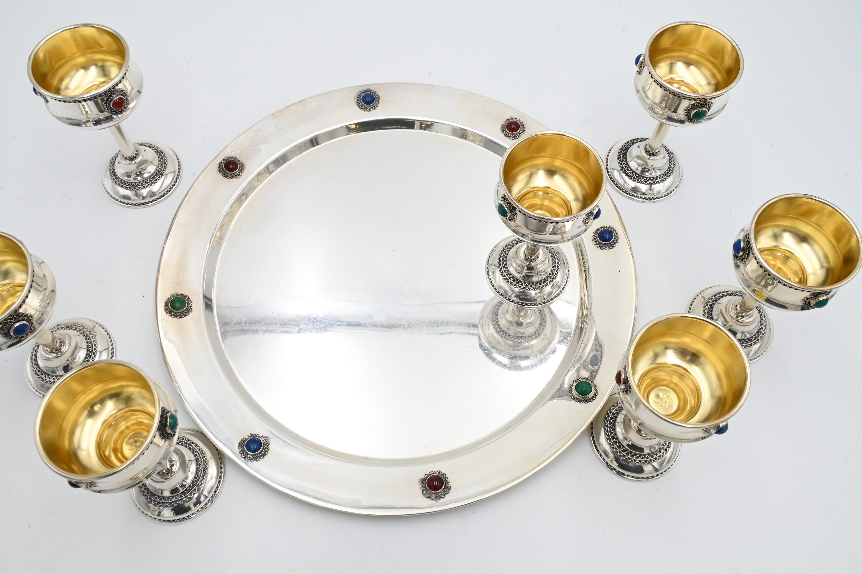 to include eight small wine stems, one large wine stem, and a circular tray, each border set with various polished hard stones at intervals, having filigree rims, the cups with goldwash gilt interiors
