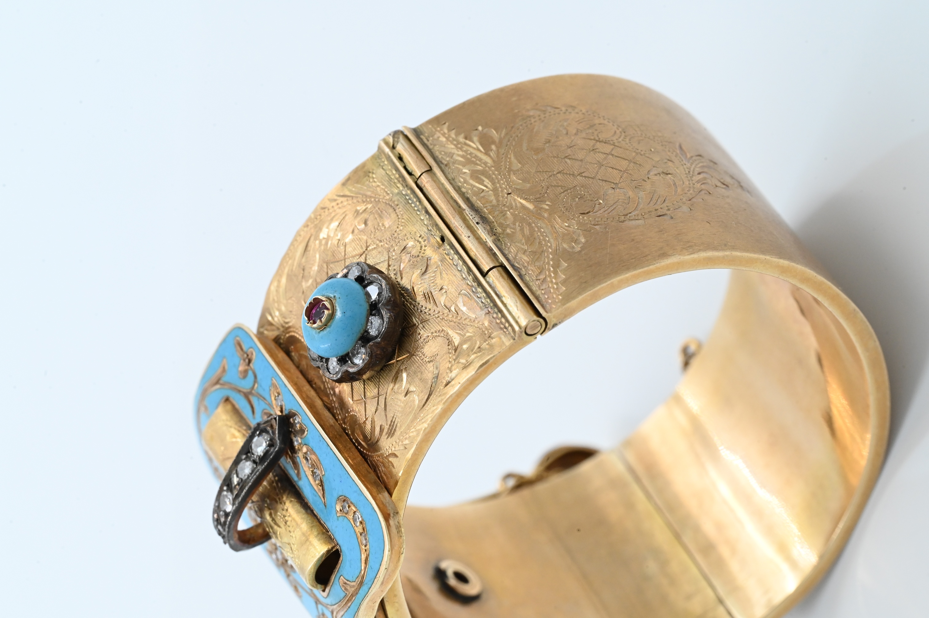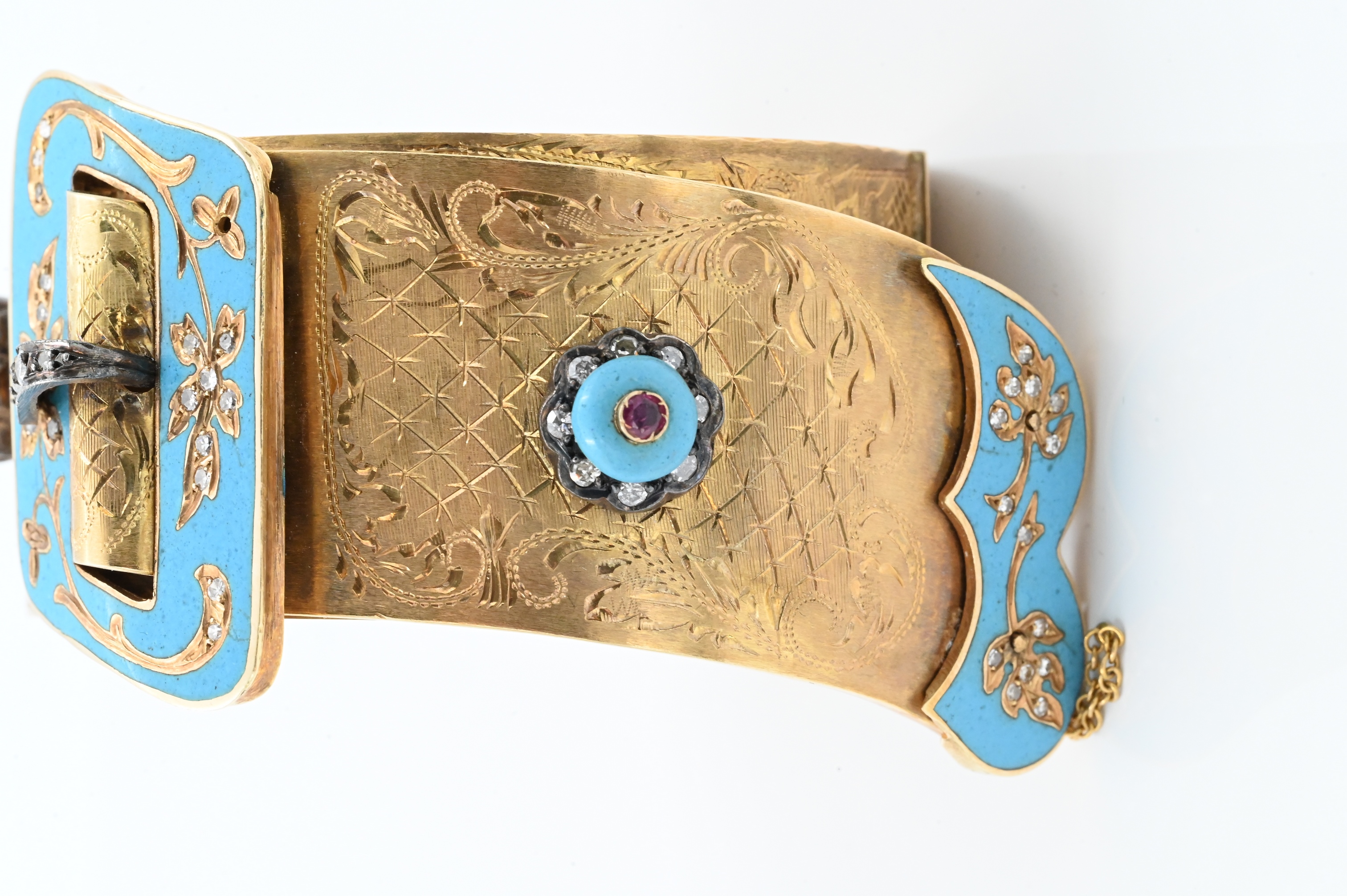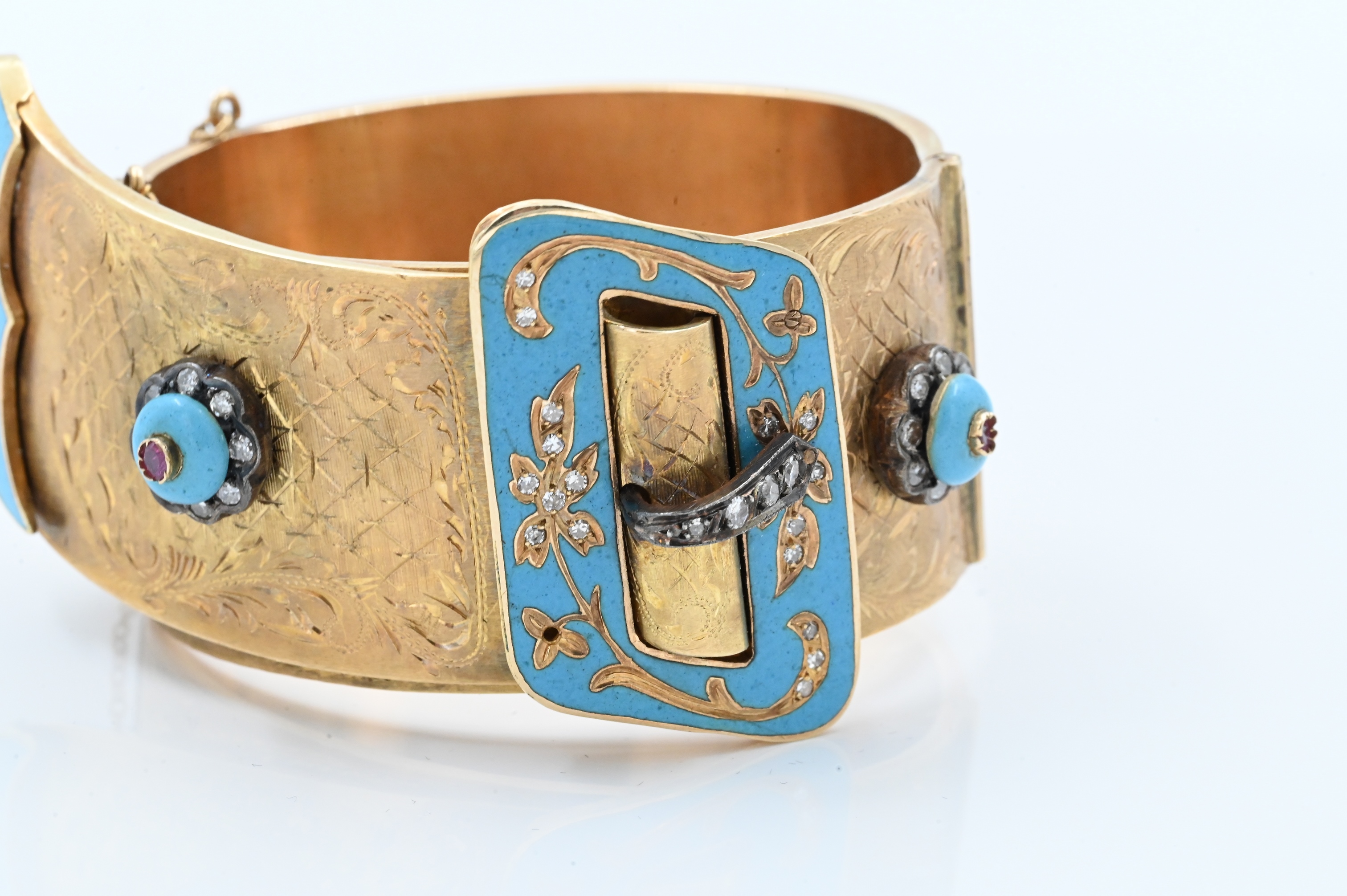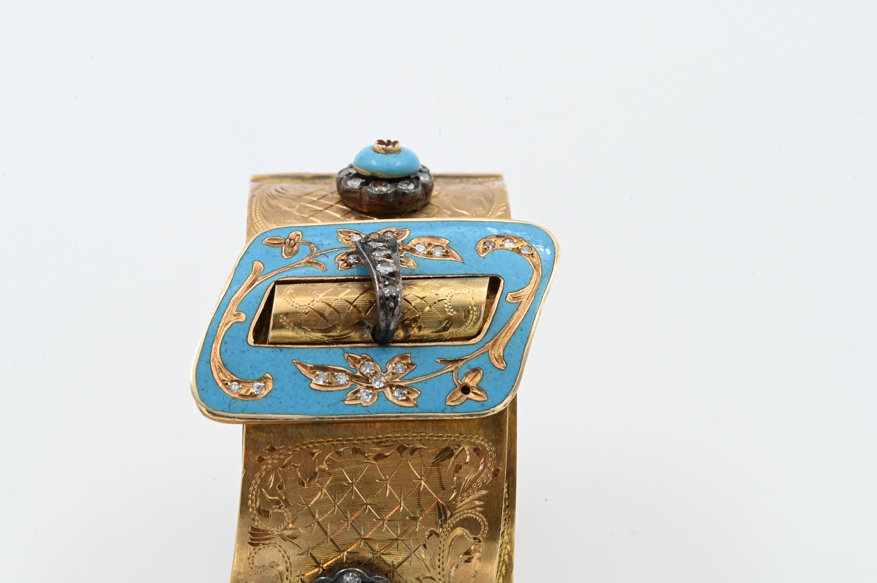 having hallow buckle design with turquoise color enamel mounted with approximately 50 diamonds, chase design, missing one diamond,