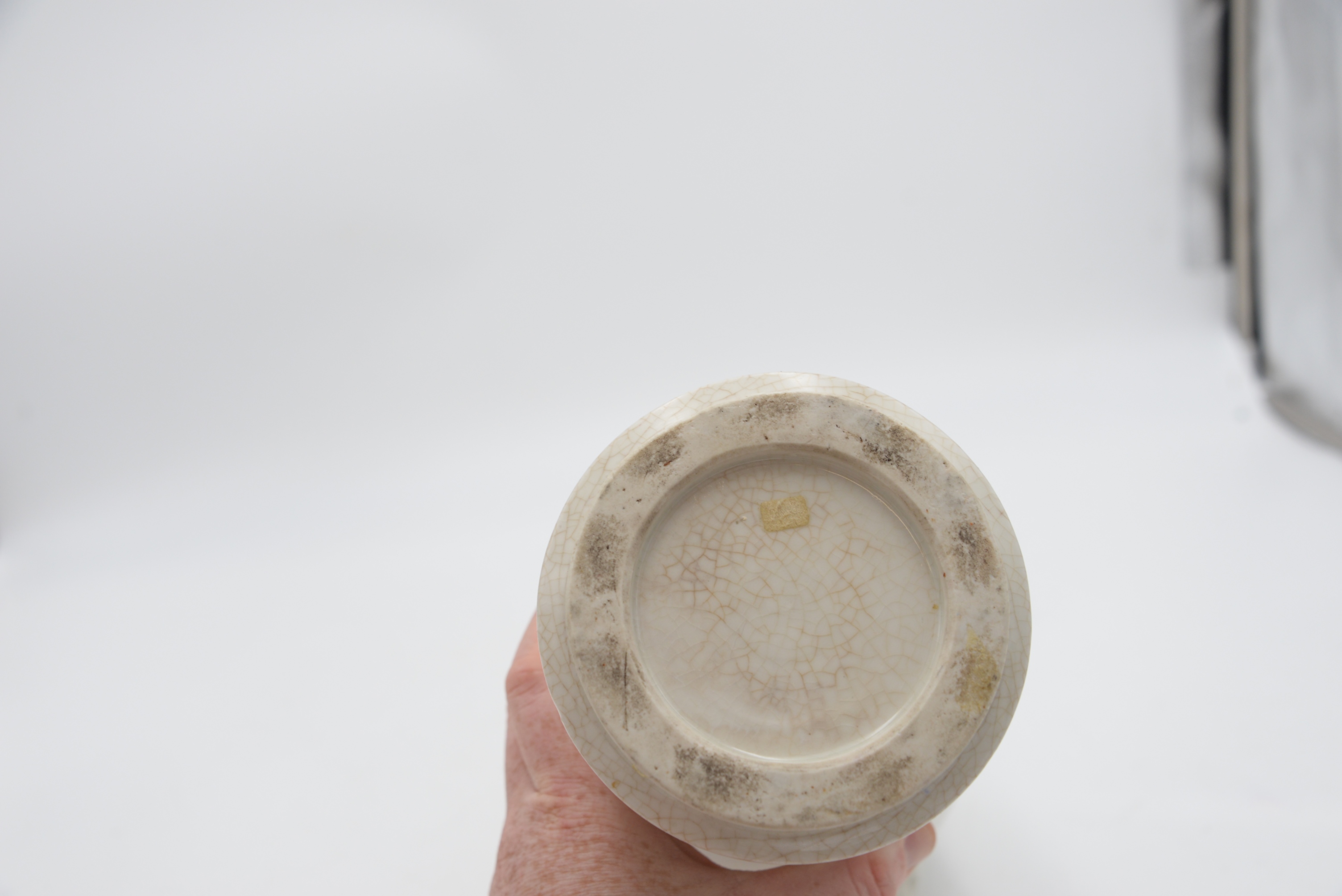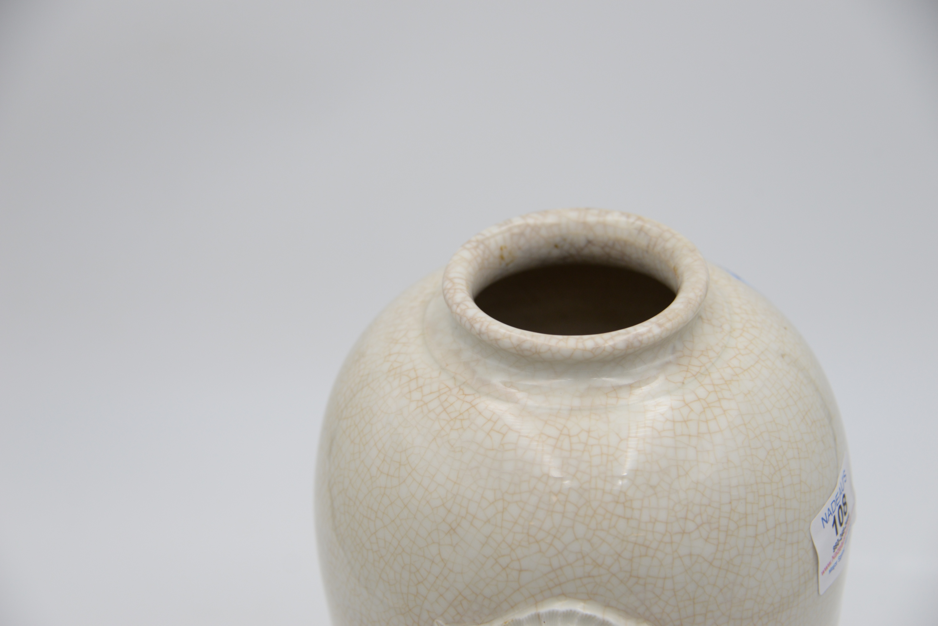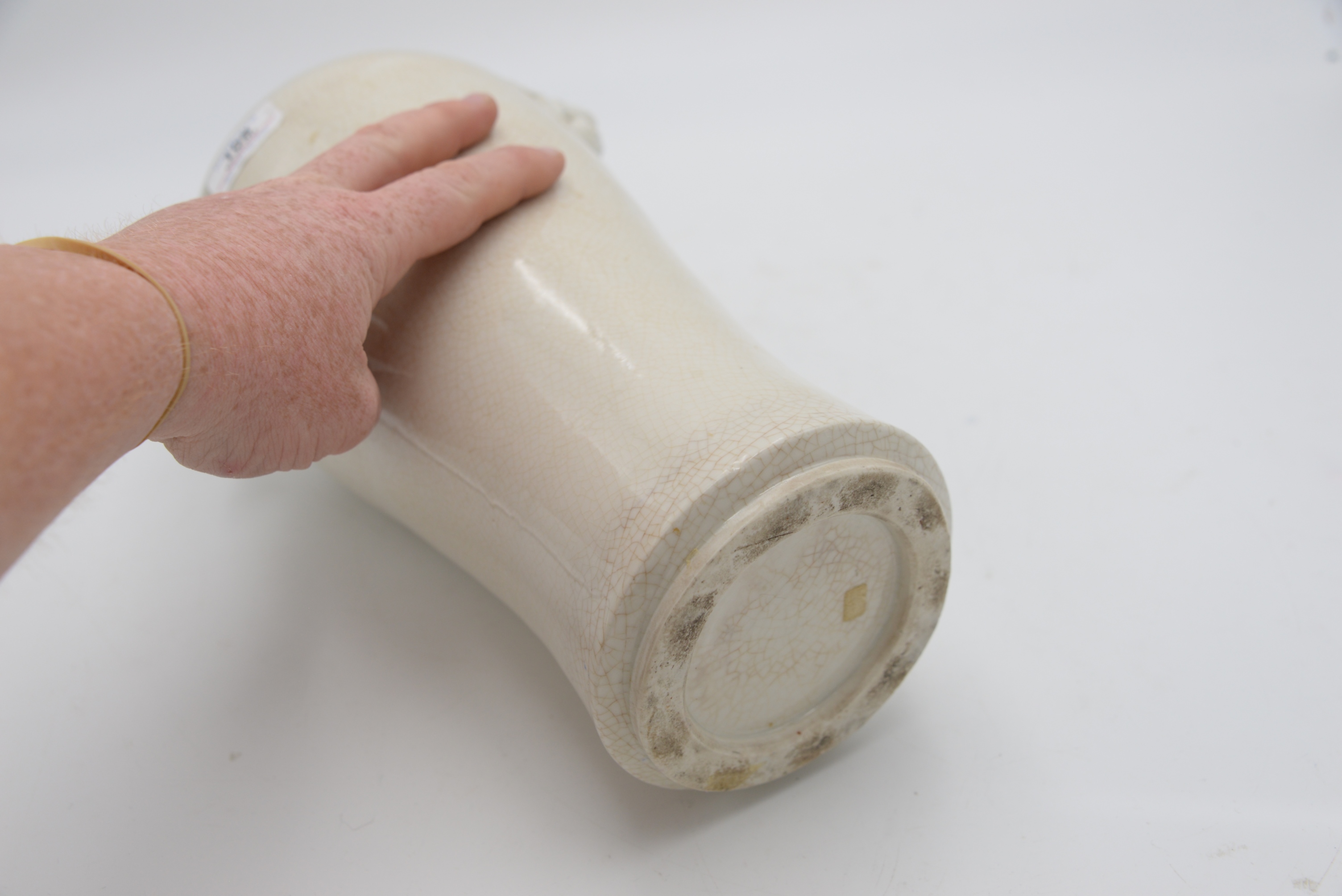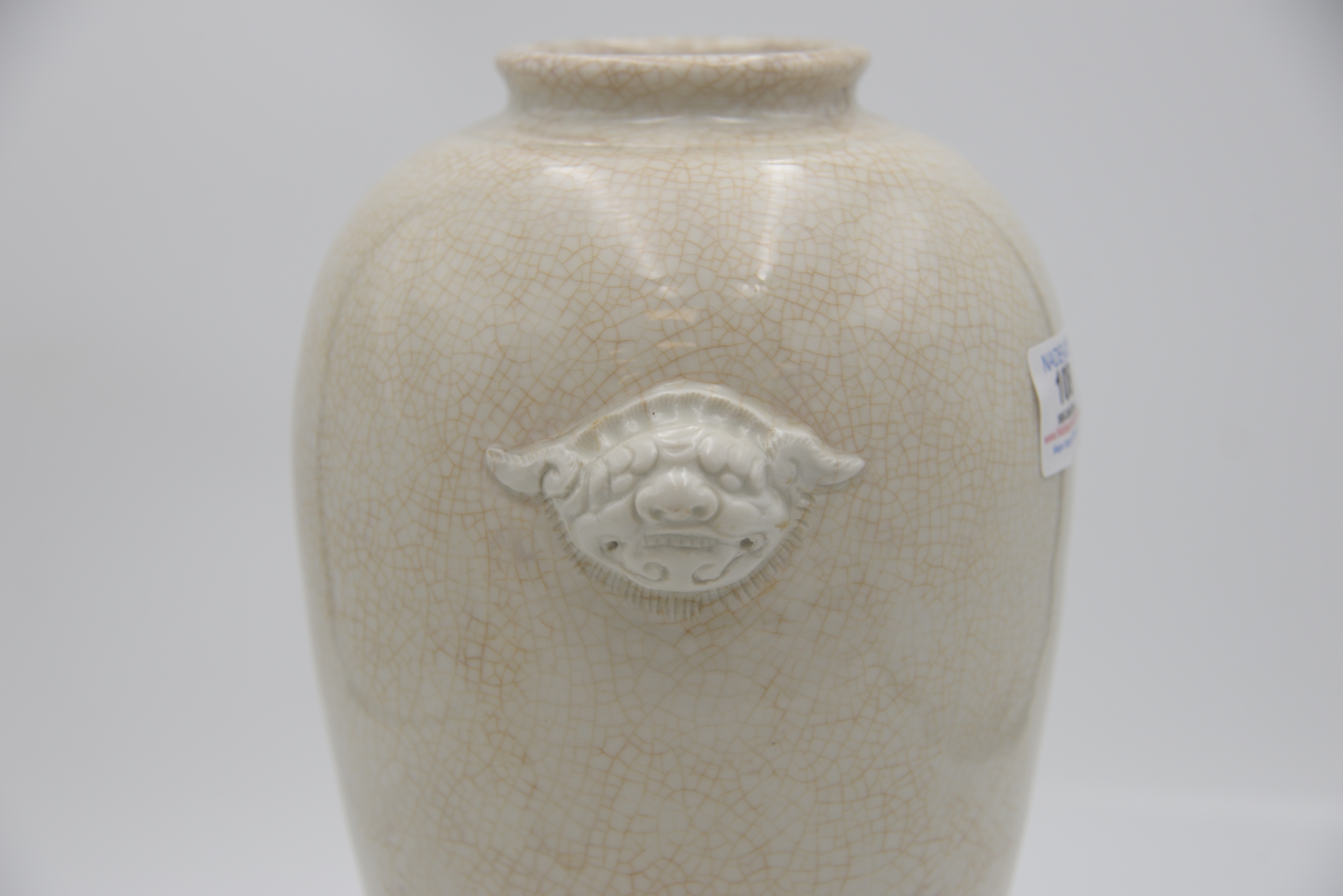 Chinese White Meiping Vase, 19th century, having creamy white glaze (Dehua), with applied articulated lion handles at the shoulder, no mark height 12 inches