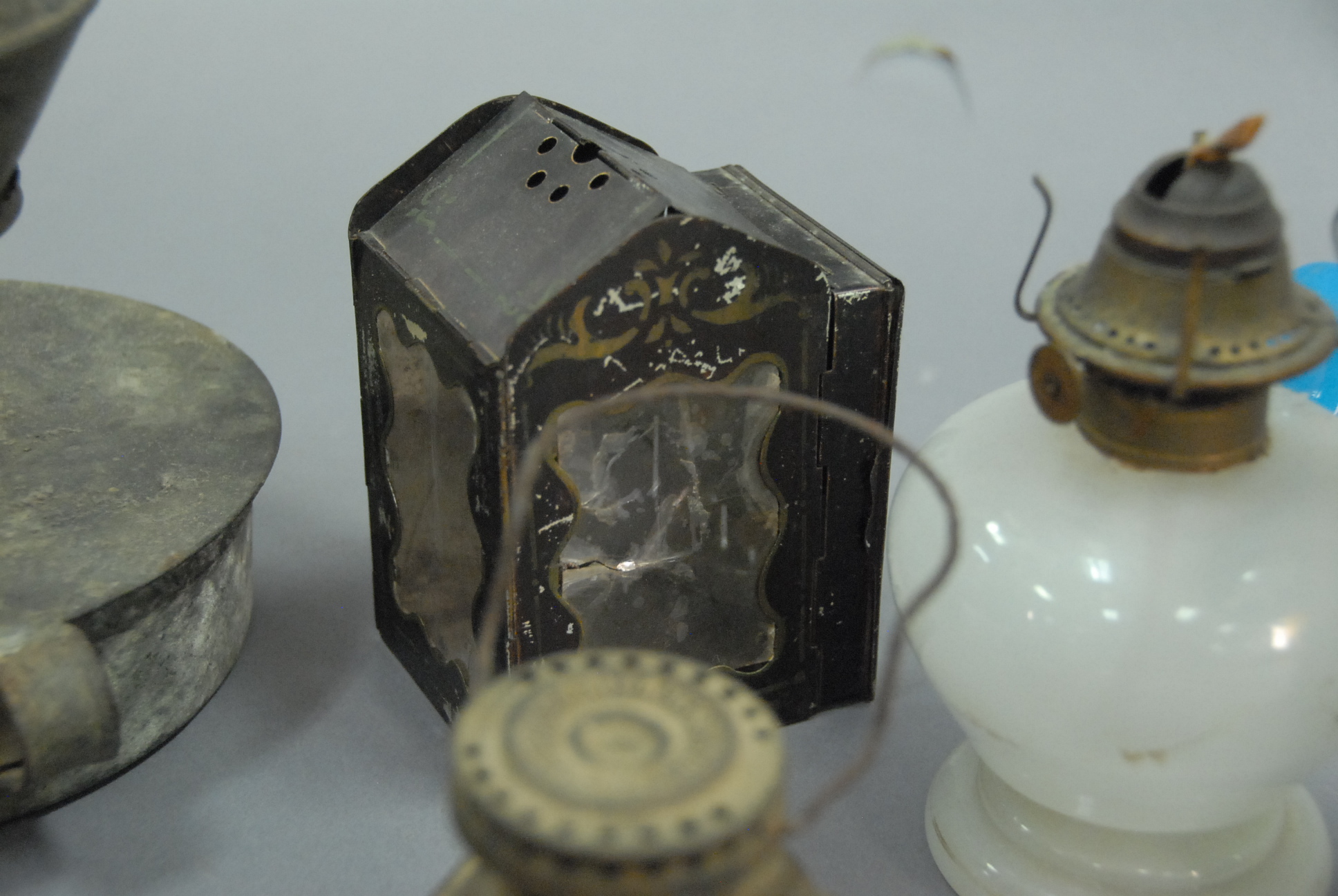 Lot 108: Five oil lamps, one civil war japanned tin lamp, Minors patent 1865, brass lamp, pigeon, etc.
