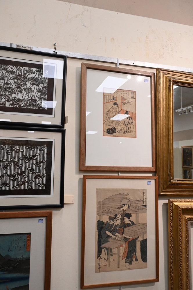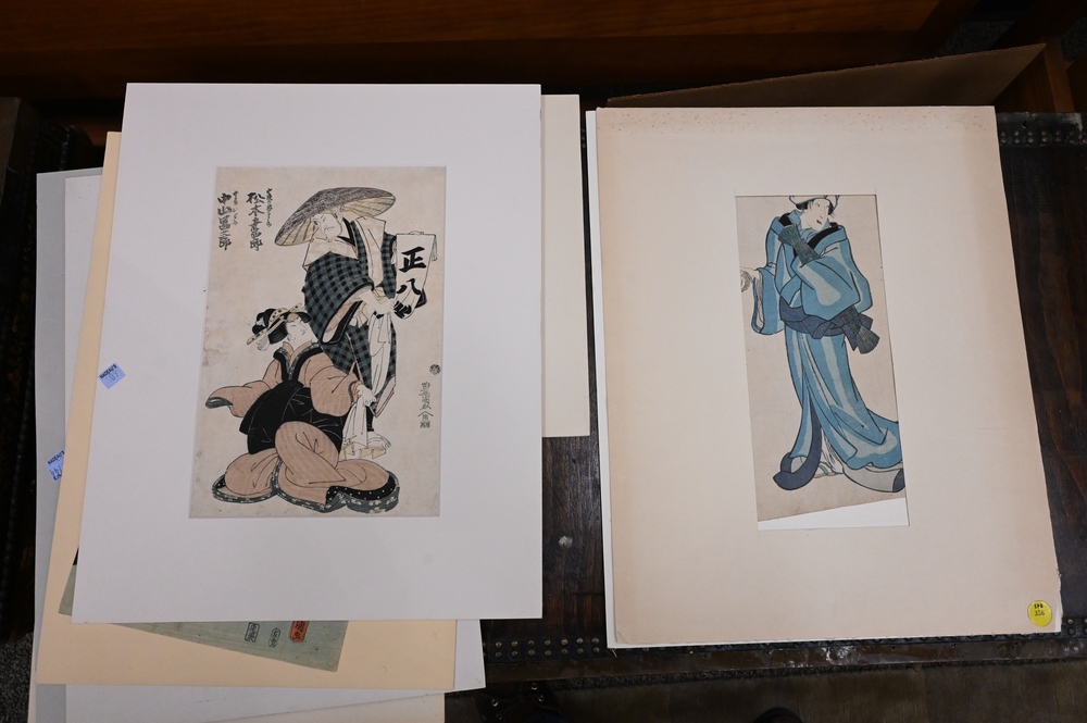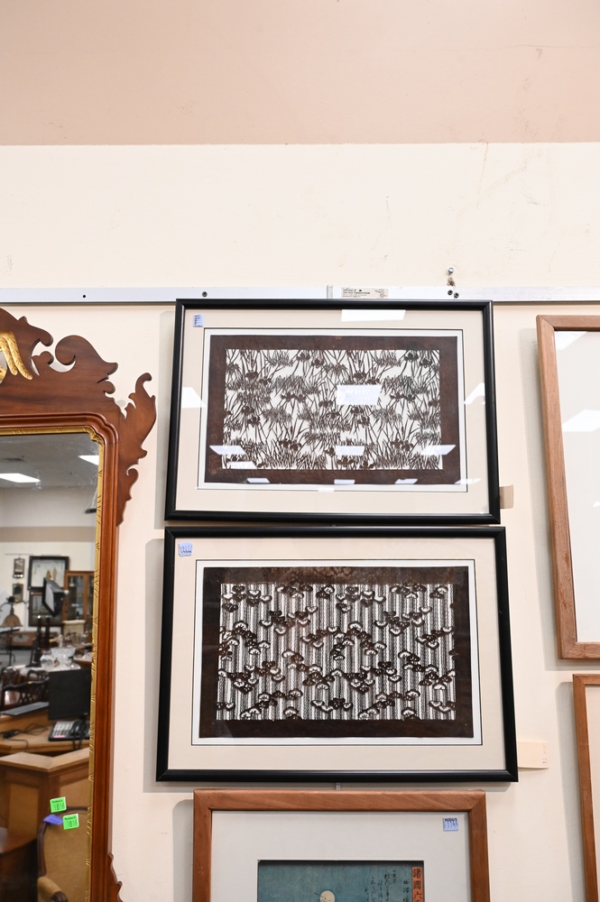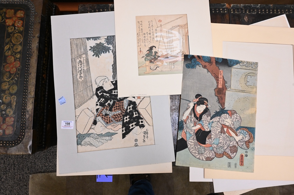 Lot 108: Group of Thirteen Japanese Woodblock Prints, to include five framed and eight paper silhouette cuts, largest 15″ x 10″.