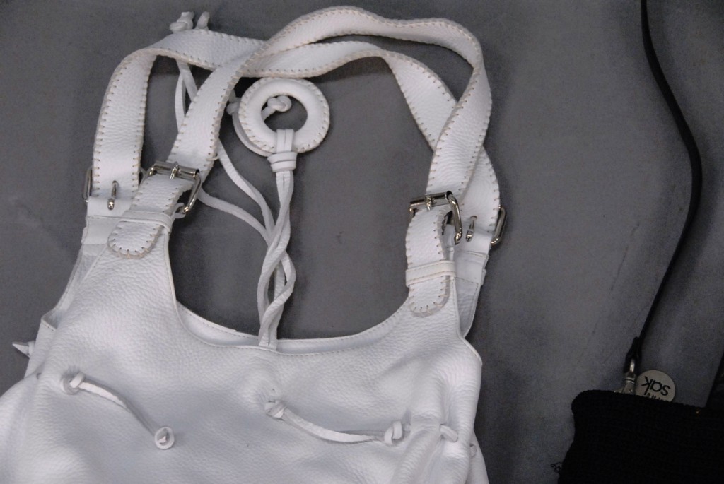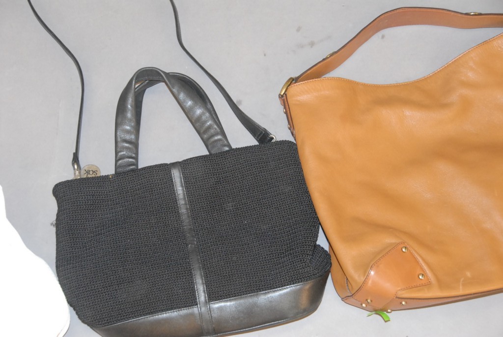 Lot 108: Group of three handbags white leather Carla Mancini, tan Cole Haan, and The Saks black leather trimmed.