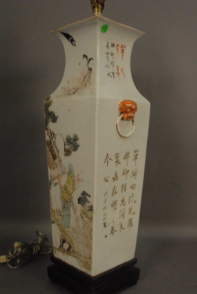 Large Famille Rose square vase having two sides with landscapes and the other two sides having painted characters and foo dog head handles made into table lamp, ht. of vase 22, wd. 7.