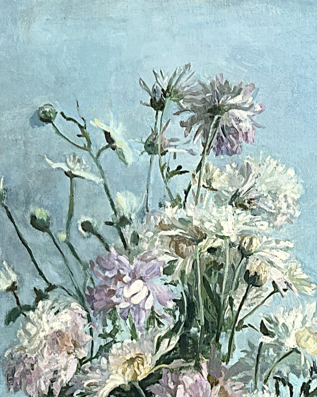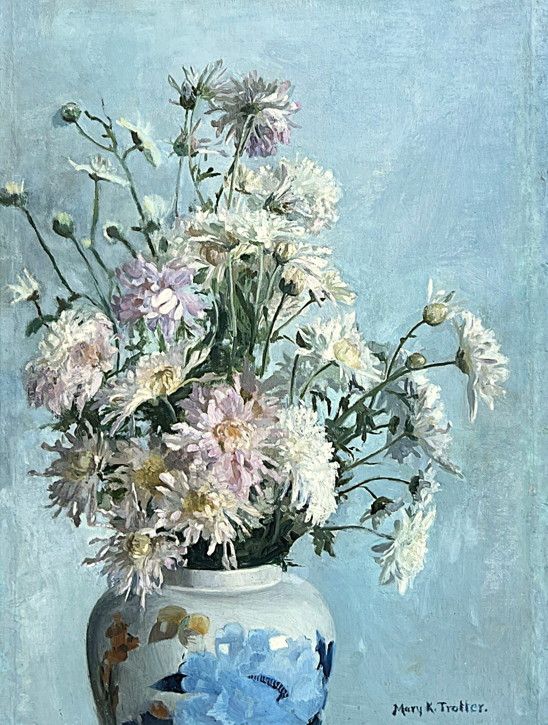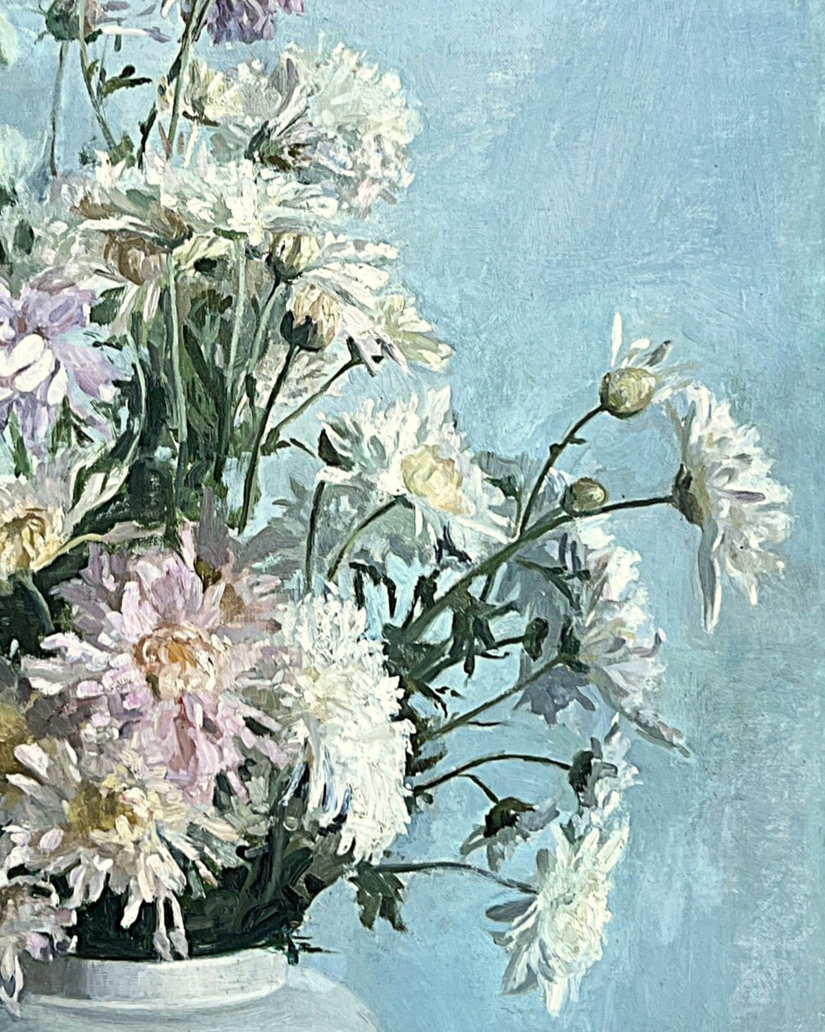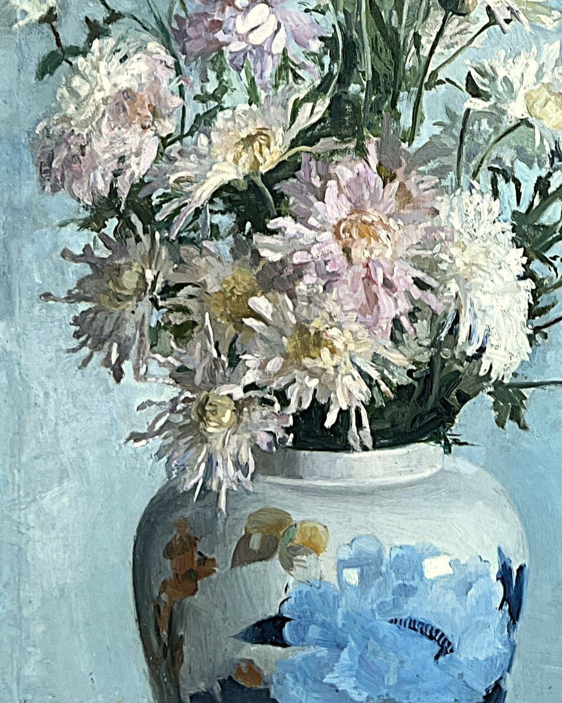 Depicting a delicate arrangement of white and pale pink chrysanthemums in a blue and white ceramic vase with floral and fish decoration, set against a soft blue background. The composition reflects a refined sense of color harmony and an impressionistic sensitivity to light and texture.