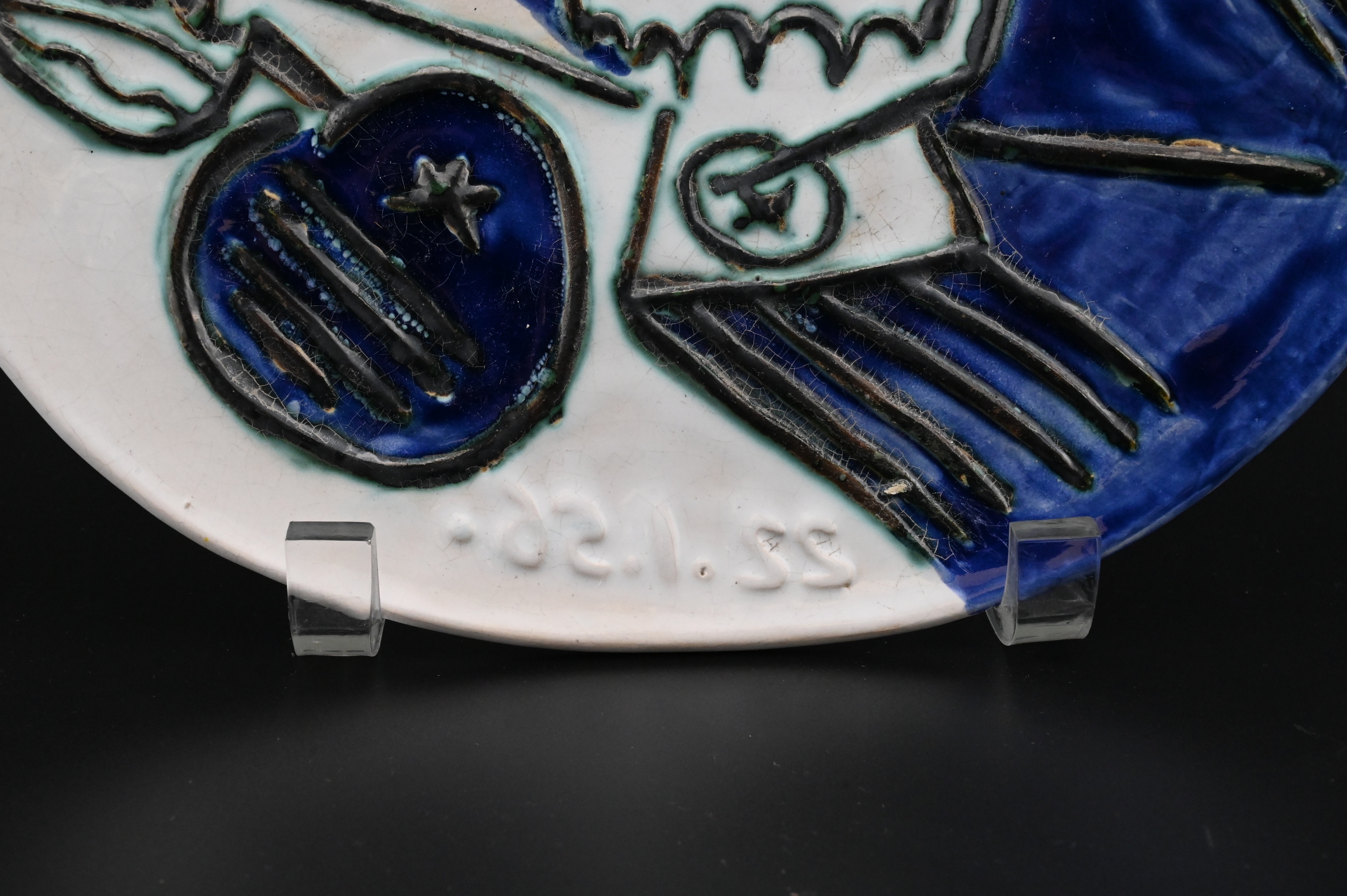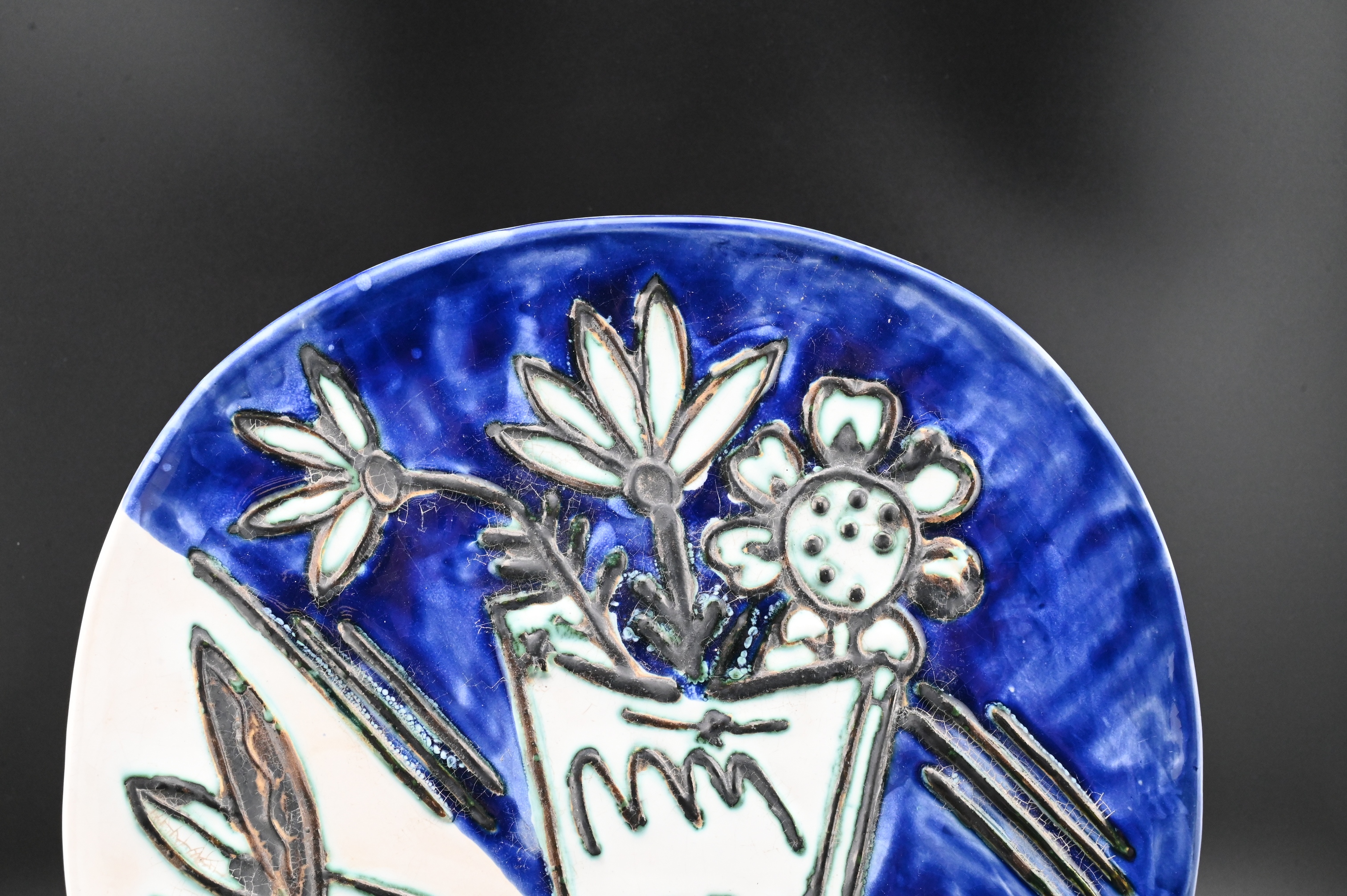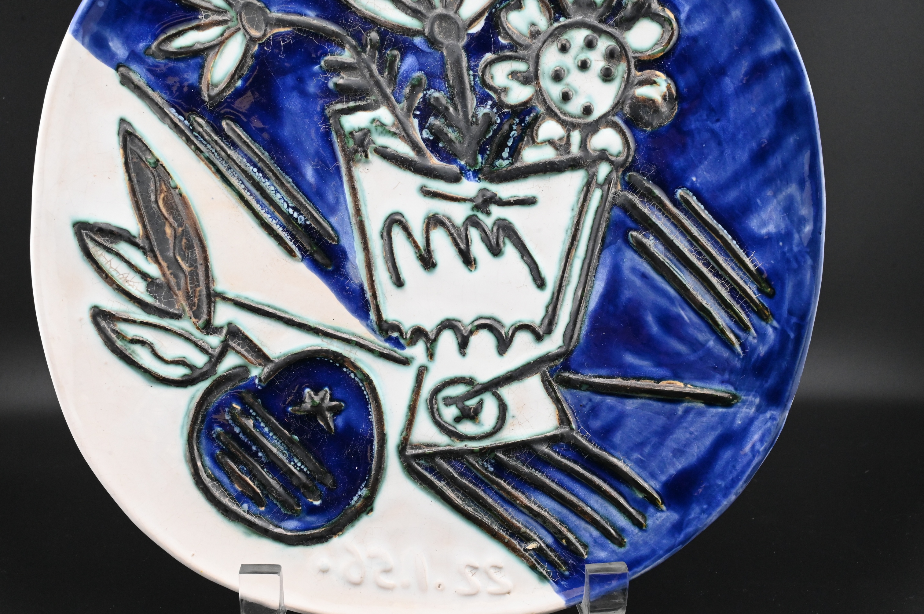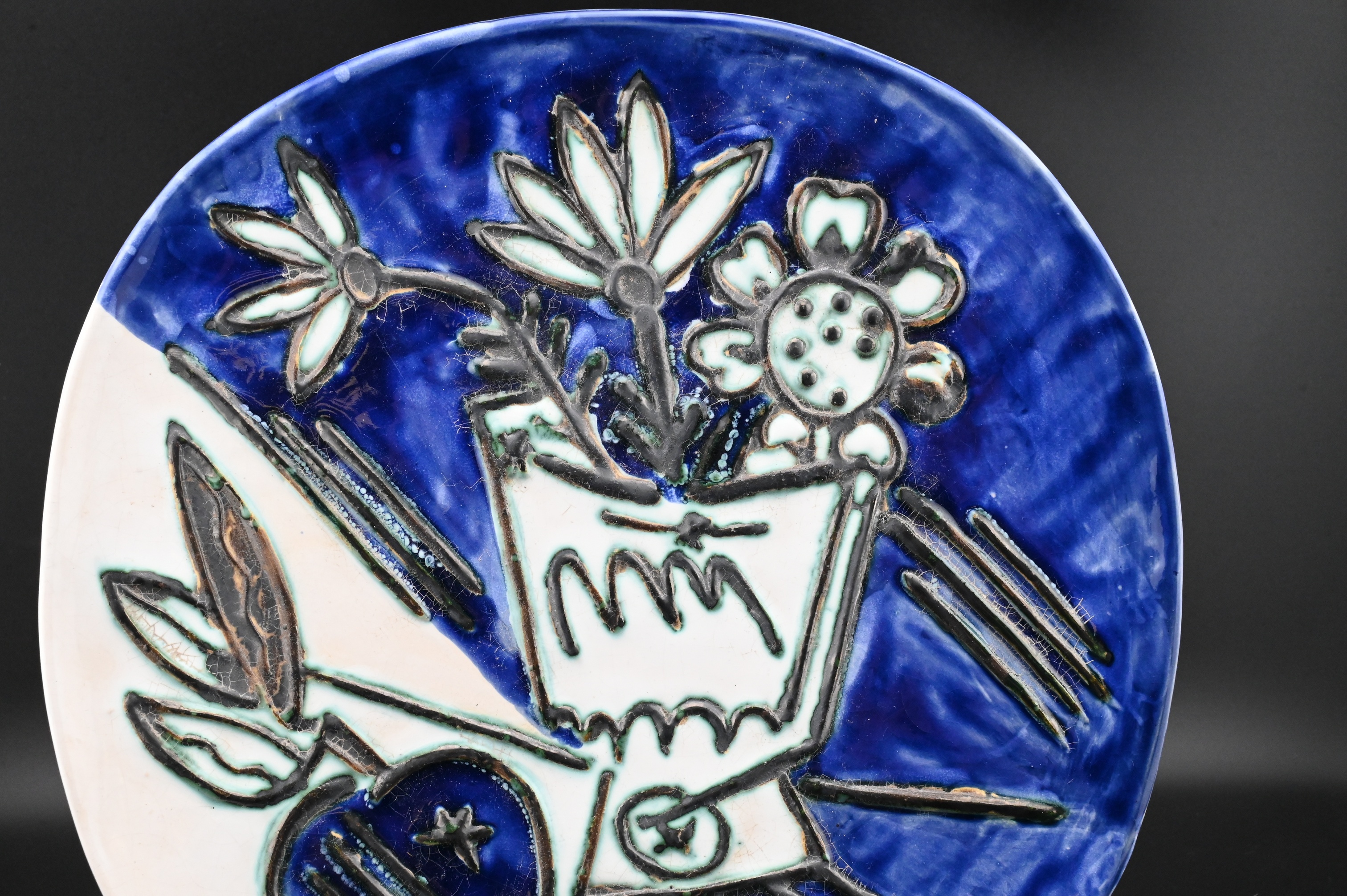 glazed and partially engraved ceramic plate depicting a stylized bouquet and apple in vivid cobalt blue, turquoise, and cream, the design raised and incised throughout, with impressed “Madoura Plein Feu” and “Empreinte Originale de Picasso” stamps on the reverse, glazed earthenware, impressed Madoura and Picasso stamps verso