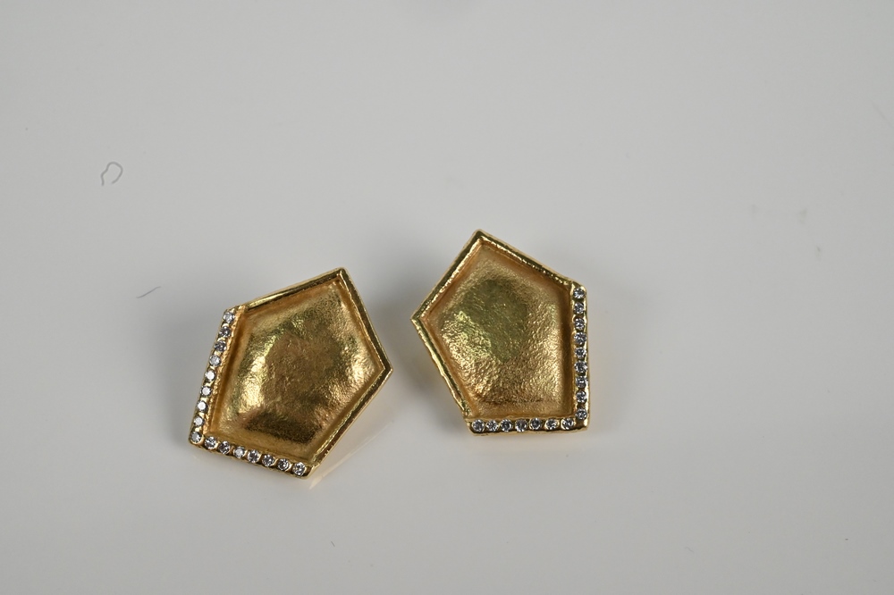 Lot 108: Pair of 18 Karat Gold Daniel Vettori Earrings, having 17 diamonds each, 14.7 grams total weight.