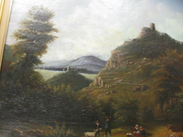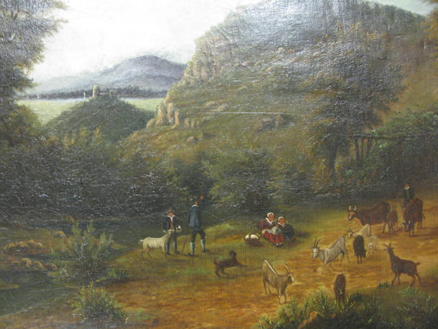 Primitive oil on canvas of people and farm animals