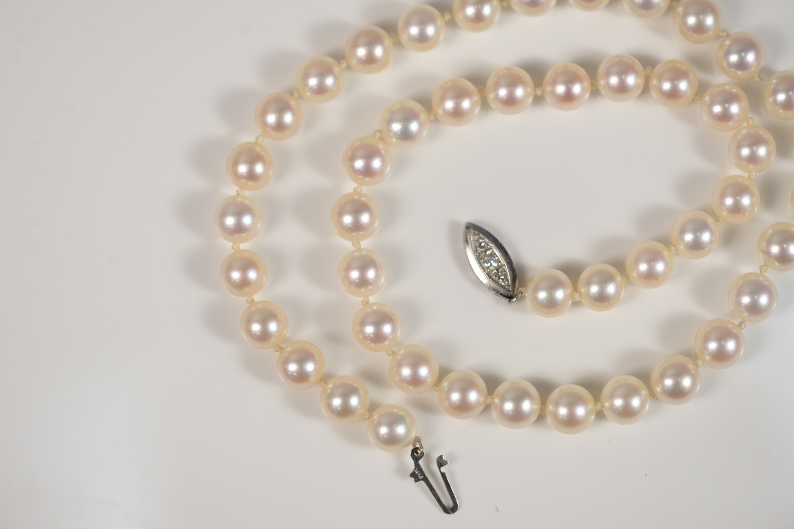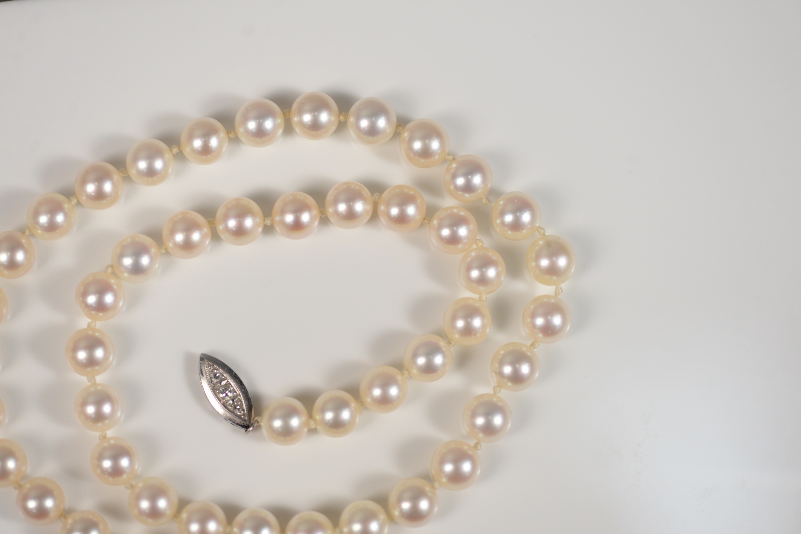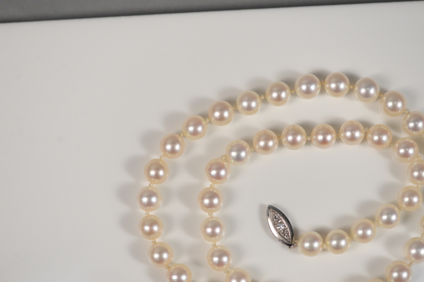 Single Strand of Pearls with 14 karat white gold clasp length 16 inches