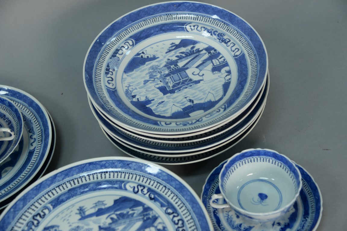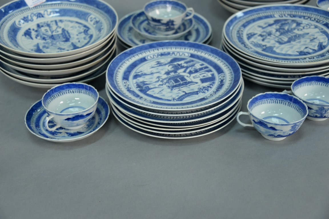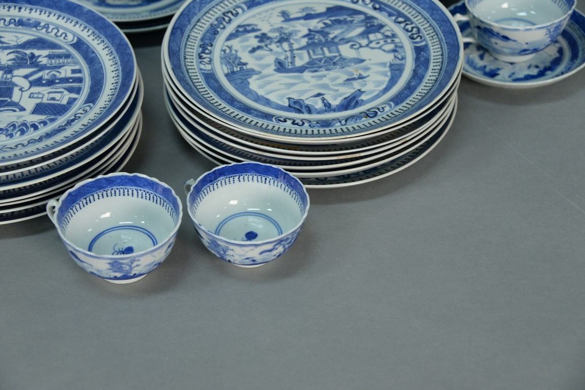 Thirty-six piece Chinese export porcelain Nanking and Canton, near matching blue and white group to include a set of twelve large bowls, seven dinner plates, seven luncheon plates, two bread plates, three saucers, and five tea cups.