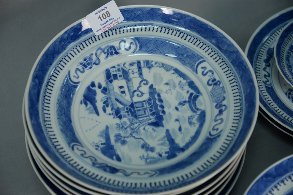 Lot 108: Thirty-six piece Chinese export porcelain Nanking and Canton, near matching blue and white group to include a set of twelve large bo…